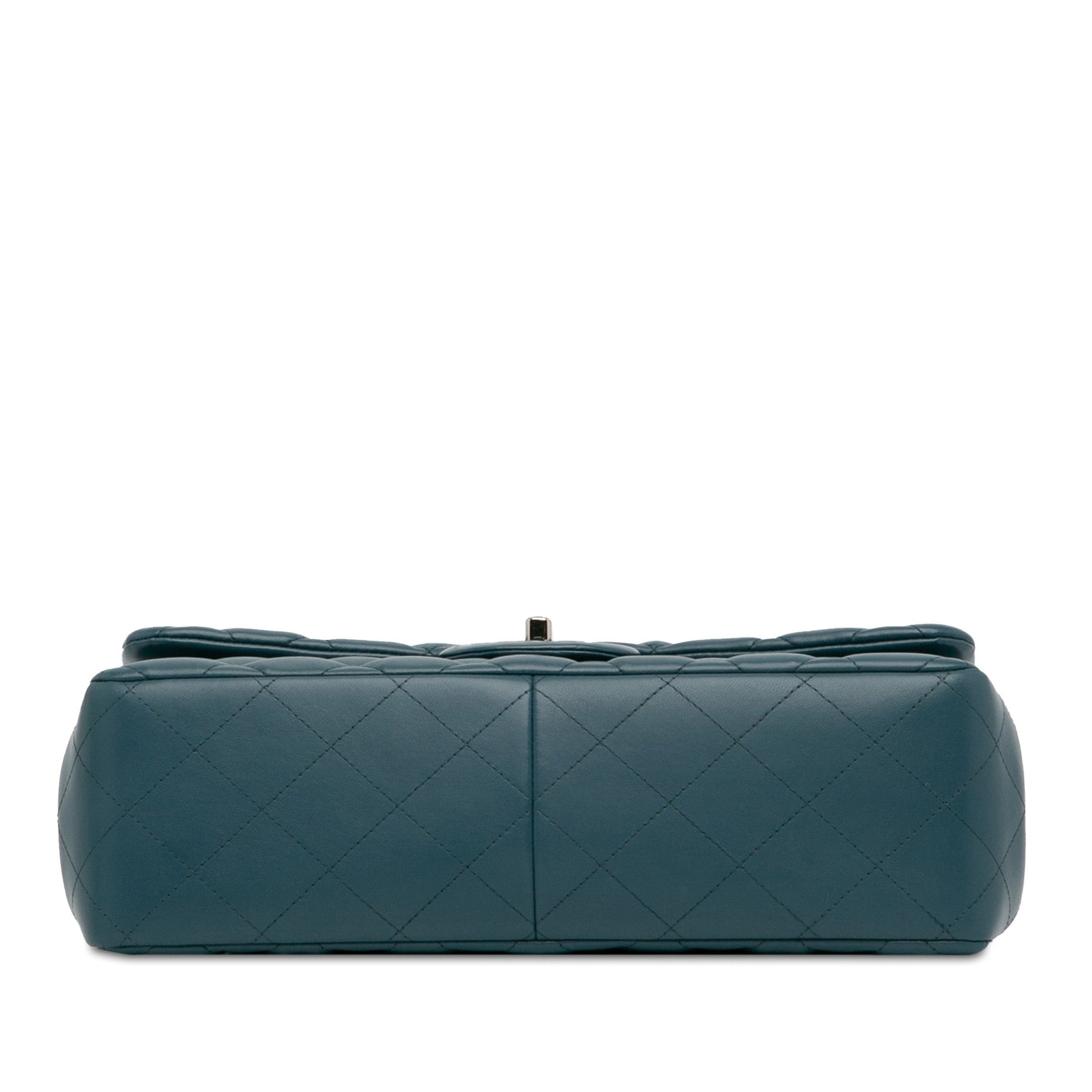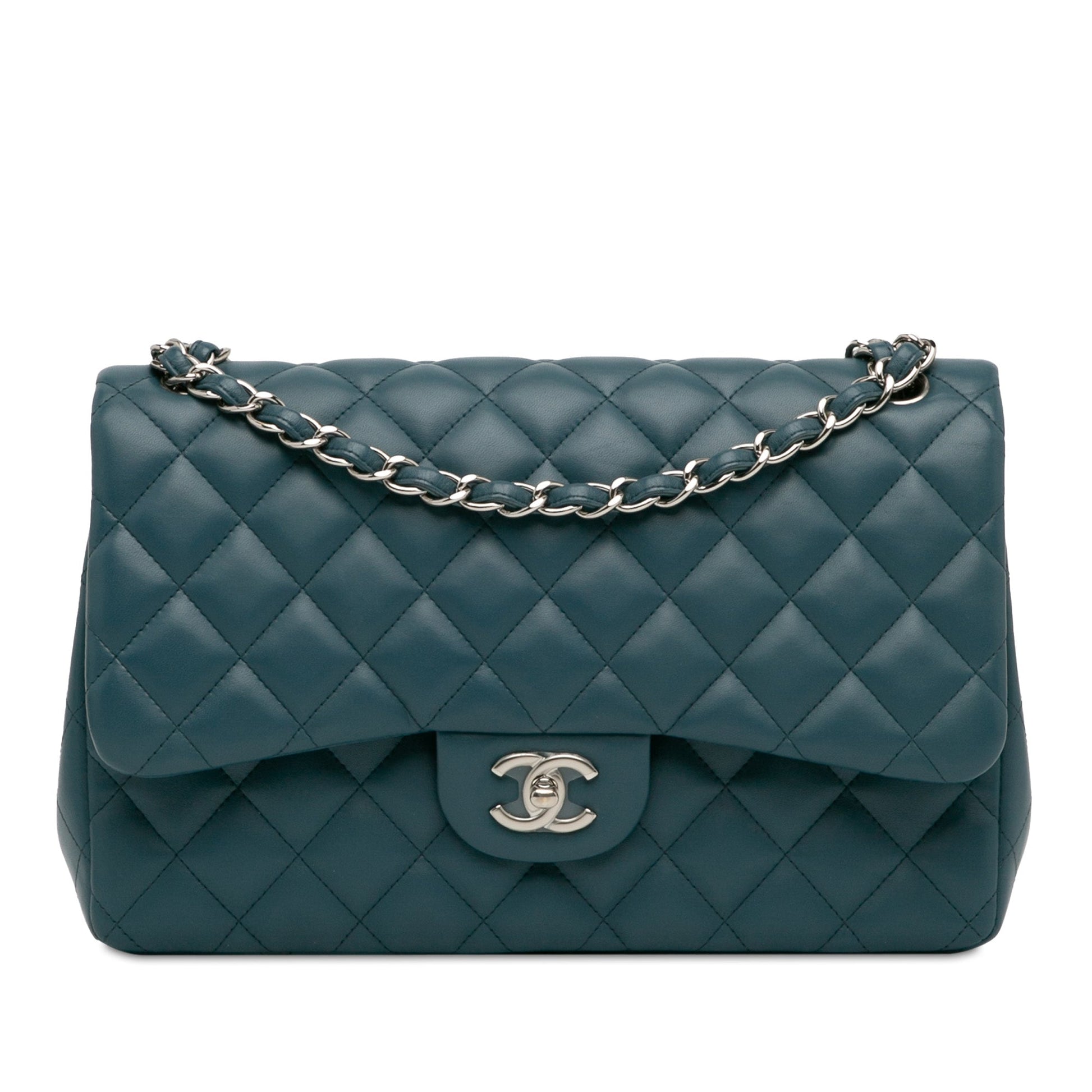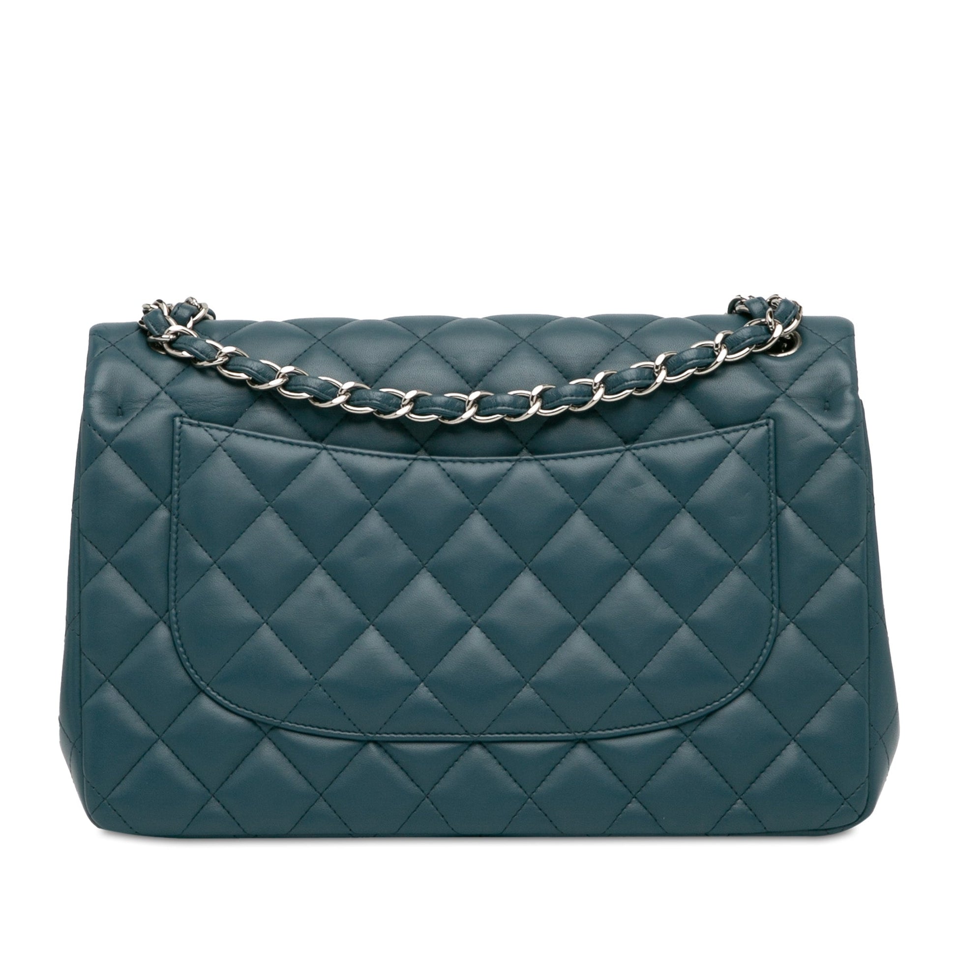 Product Details: Blue Chanel Jumbo Classic Lambskin Double Flap Shoulder Bag. This shoulder bag features a quilted lambskin leather body, leather-woven chain straps, double front flaps with CC turnlock closure, an exterior back slip pocket, and interior zip and slip pockets. Strap is repainted. 7.5" L x 11.6" W x 3.5" D. Serial number 17436987.