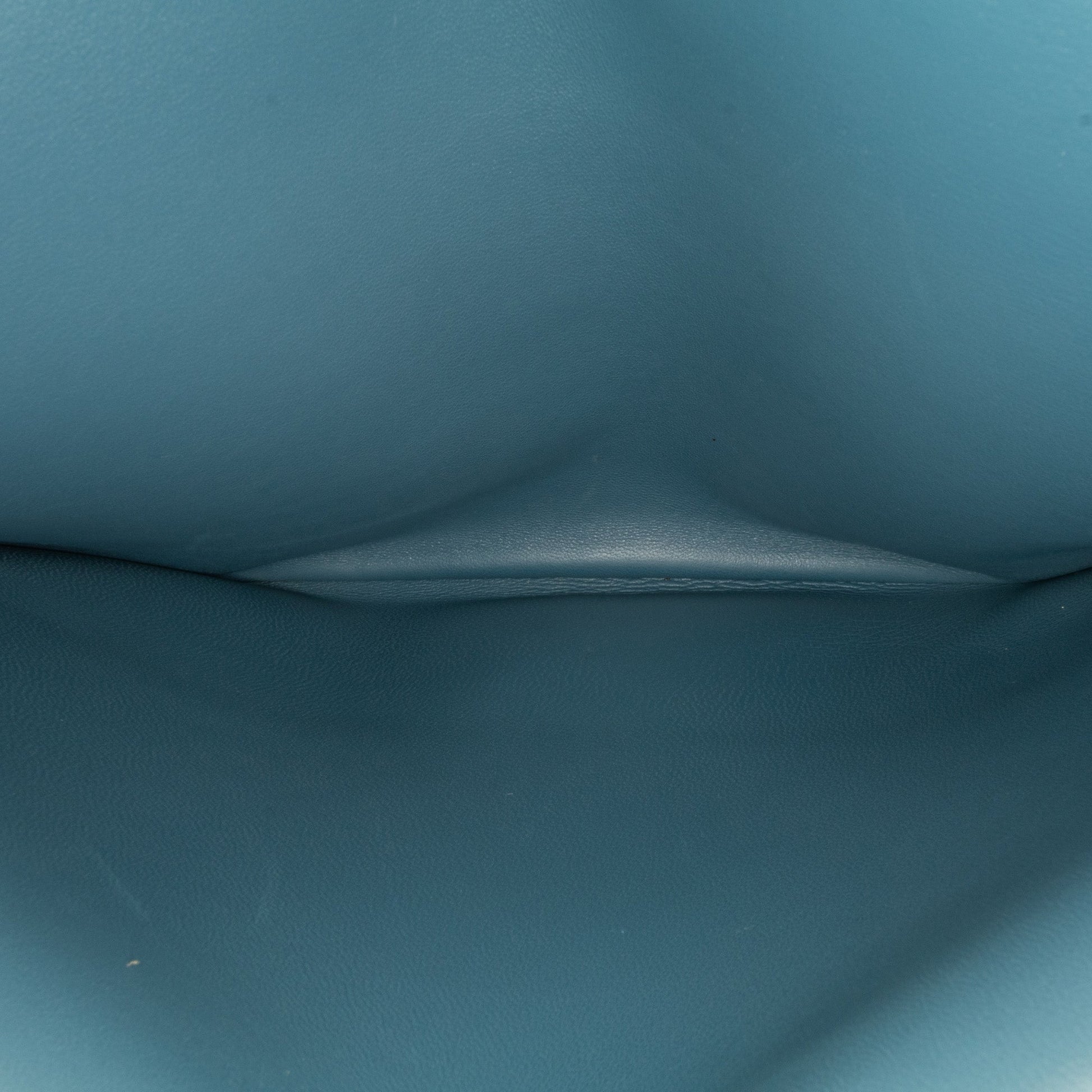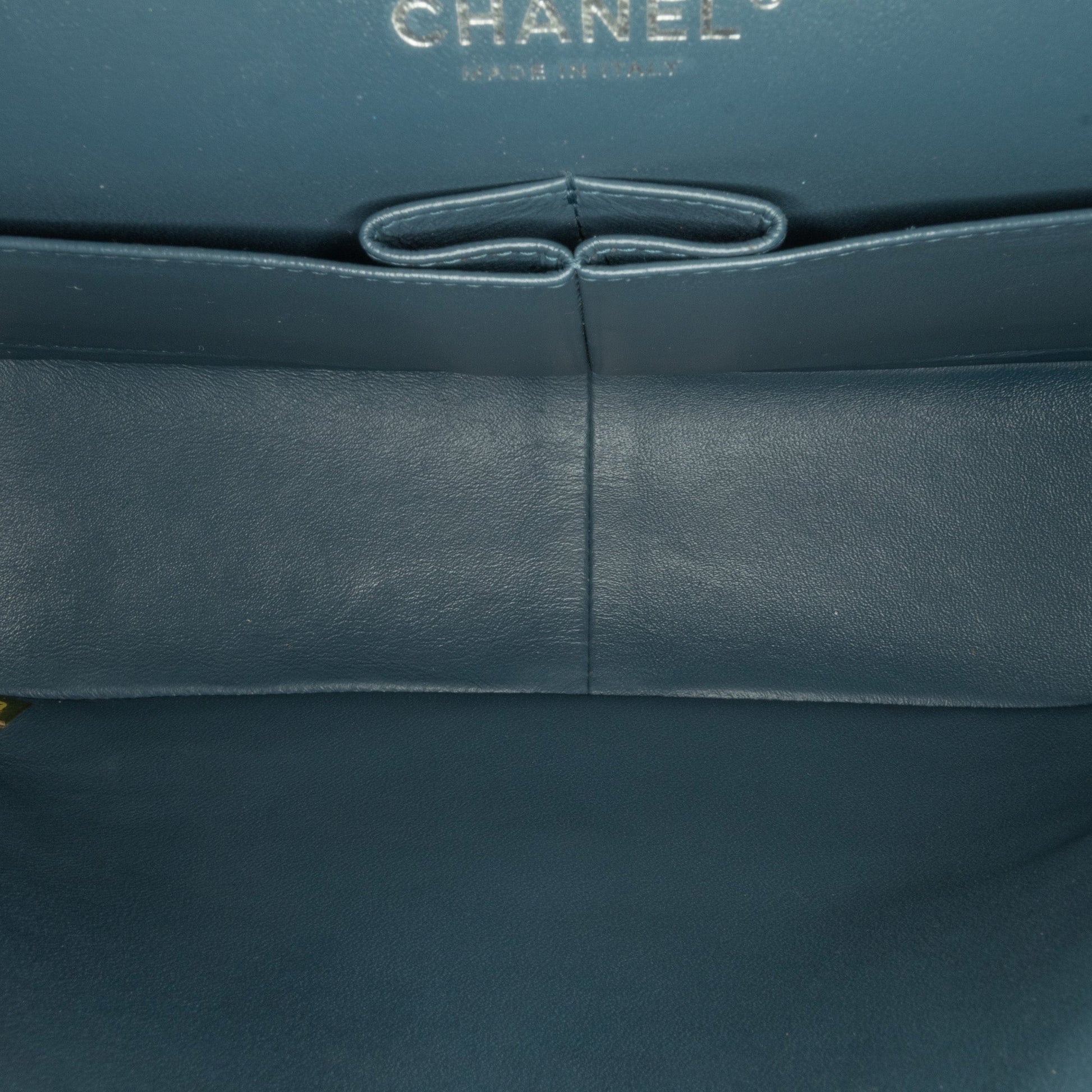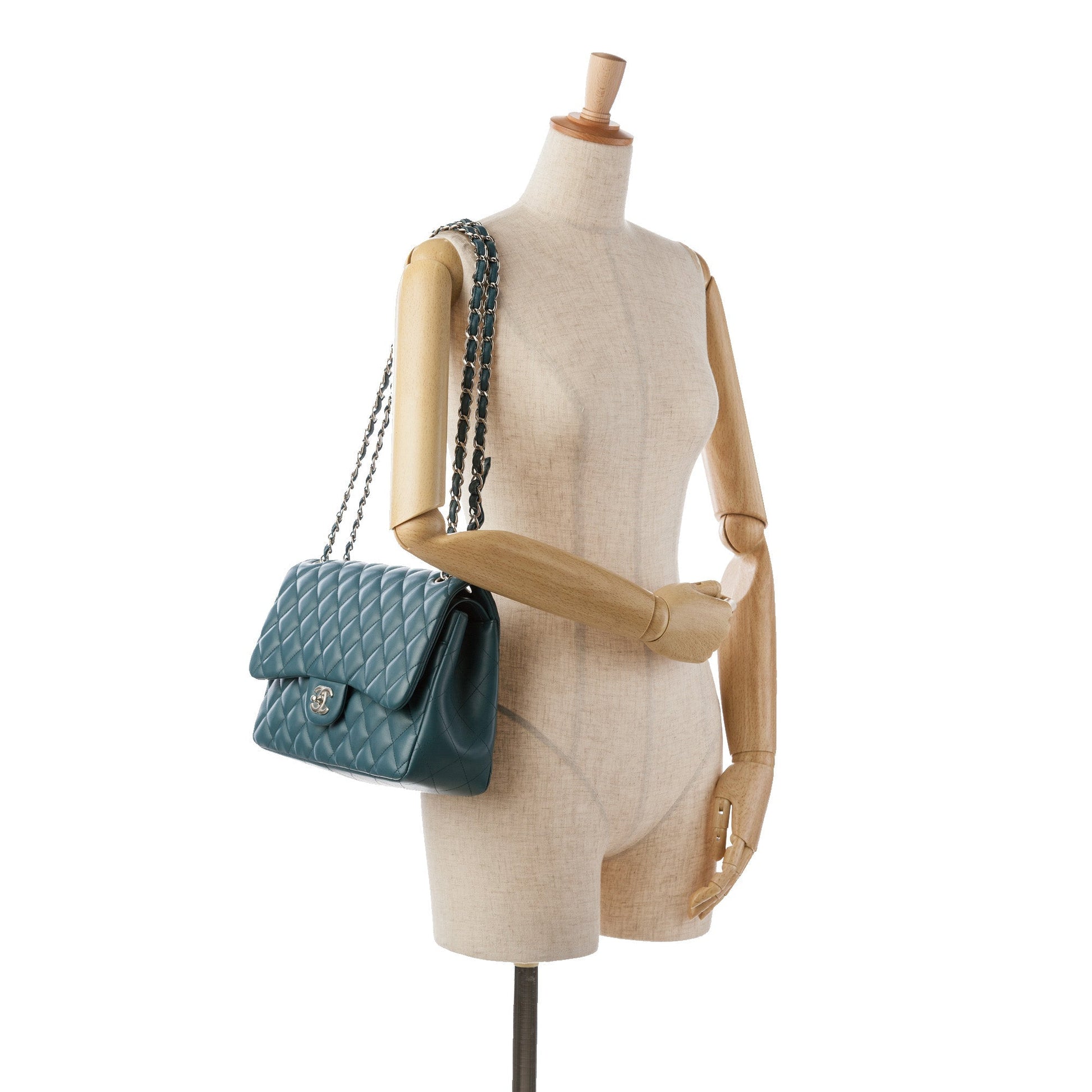 Product Details: Blue Chanel Jumbo Classic Lambskin Double Flap Shoulder Bag. This shoulder bag features a quilted lambskin leather body, leather-woven chain straps, double front flaps with CC turnlock closure, an exterior back slip pocket, and interior zip and slip pockets. Strap is repainted. 7.5" L x 11.6" W x 3.5" D. Serial number 17436987.