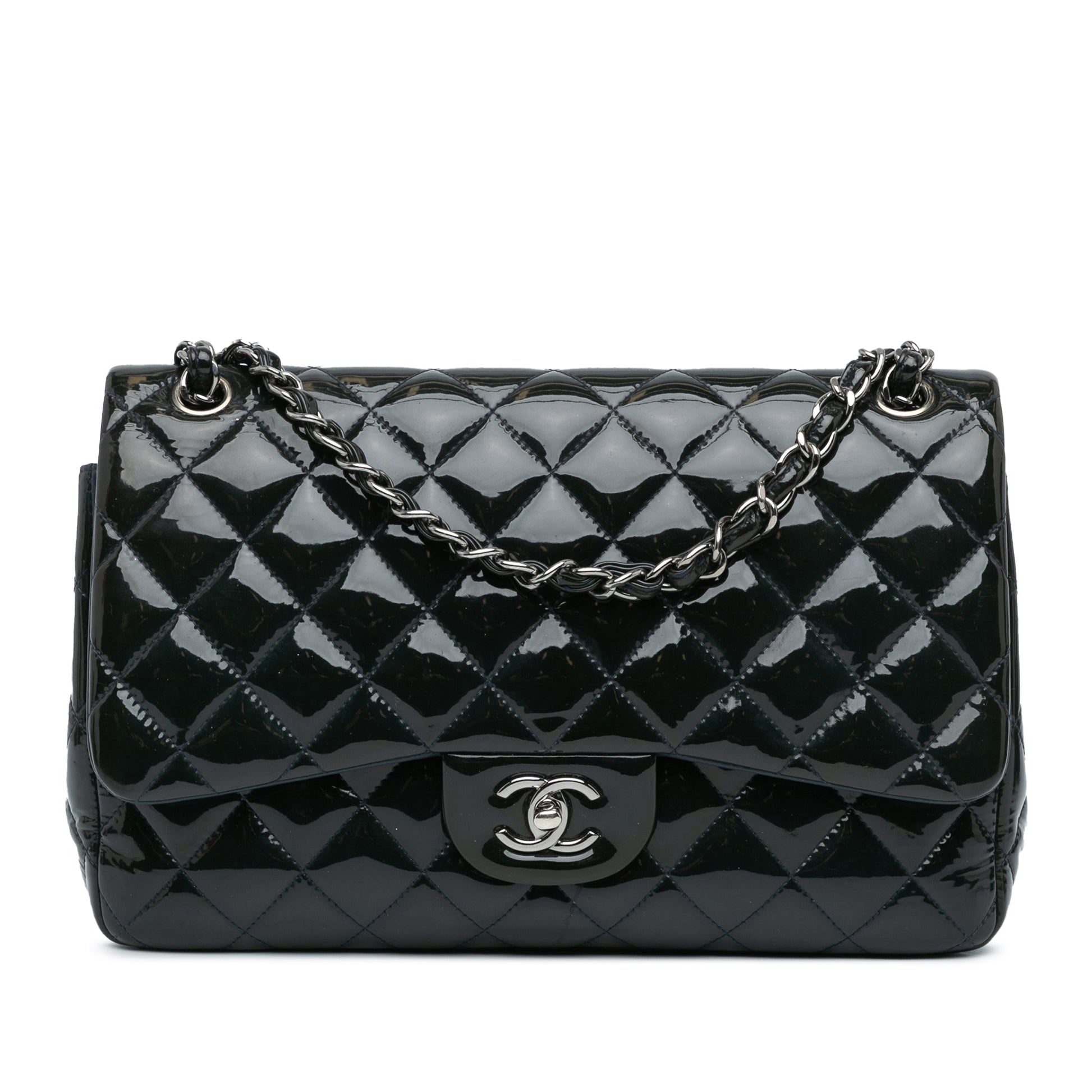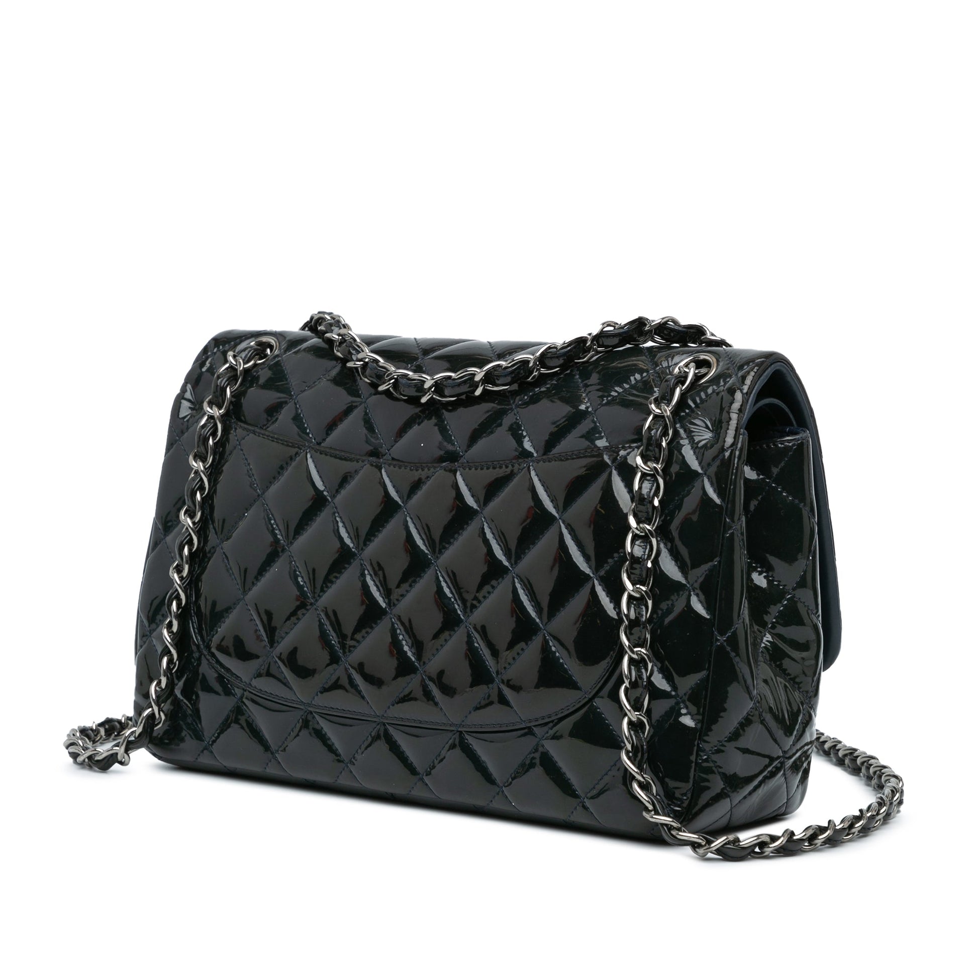 Product Details: Blue Chanel Jumbo Classic Patent Double Flap Shoulder Bag. The Jumbo Classic features a quilted patent leather body, leather woven chain shoulder straps, double front flaps with interlocking Cs and a twist lock closure, an exterior back slip pocket, and interior zip and slip pockets. Lining is repainted. 7.5" L x 11.8" W x 3.5" D, 13.4" drop. Serial number 19912159.