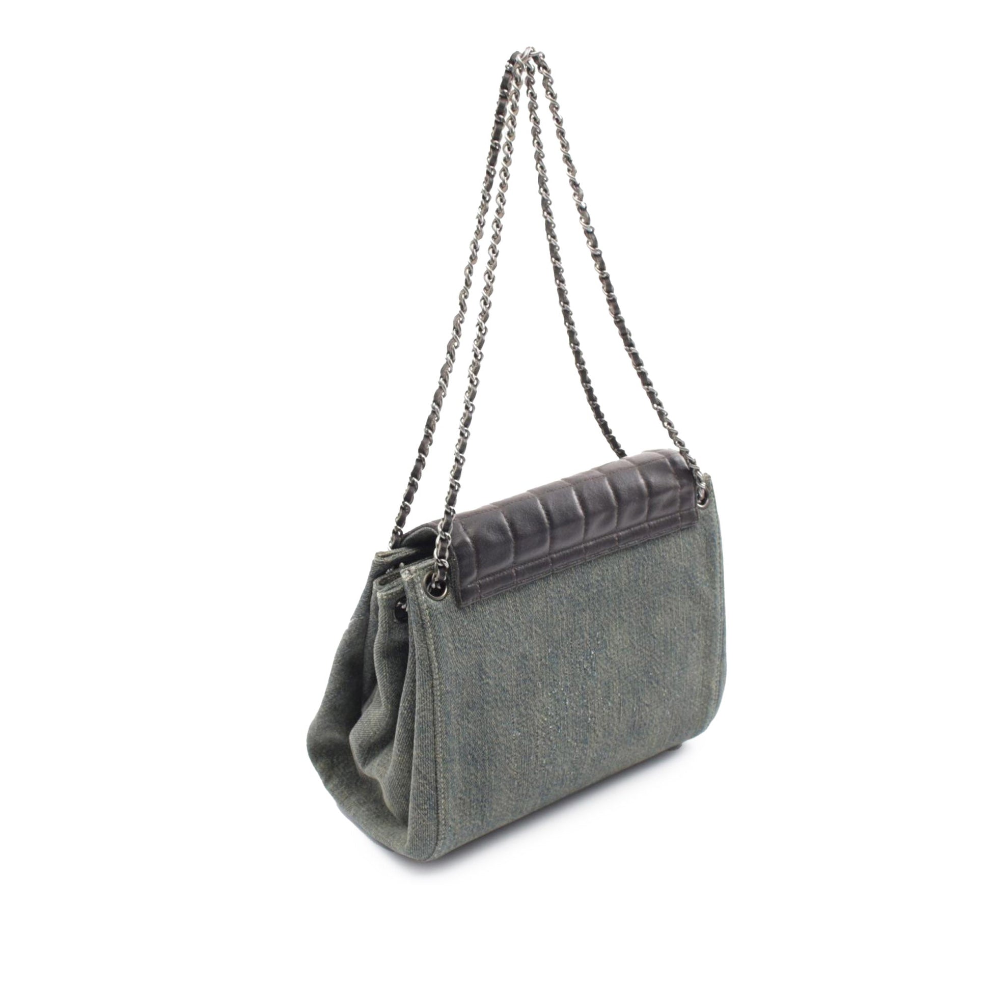 Product Details: Blue Chanel Lambskin And Denim Chocolate Bar 2.55 Accordion Flap Shoulder Bag. This shoulder bag features a quilted lambskin and denim body, leather-woven chain link straps, a front flap with twist lock closure, and interior zip and slip pockets. 7.9" L x 9.4" W x 4.7" D. Serial number 6299825.