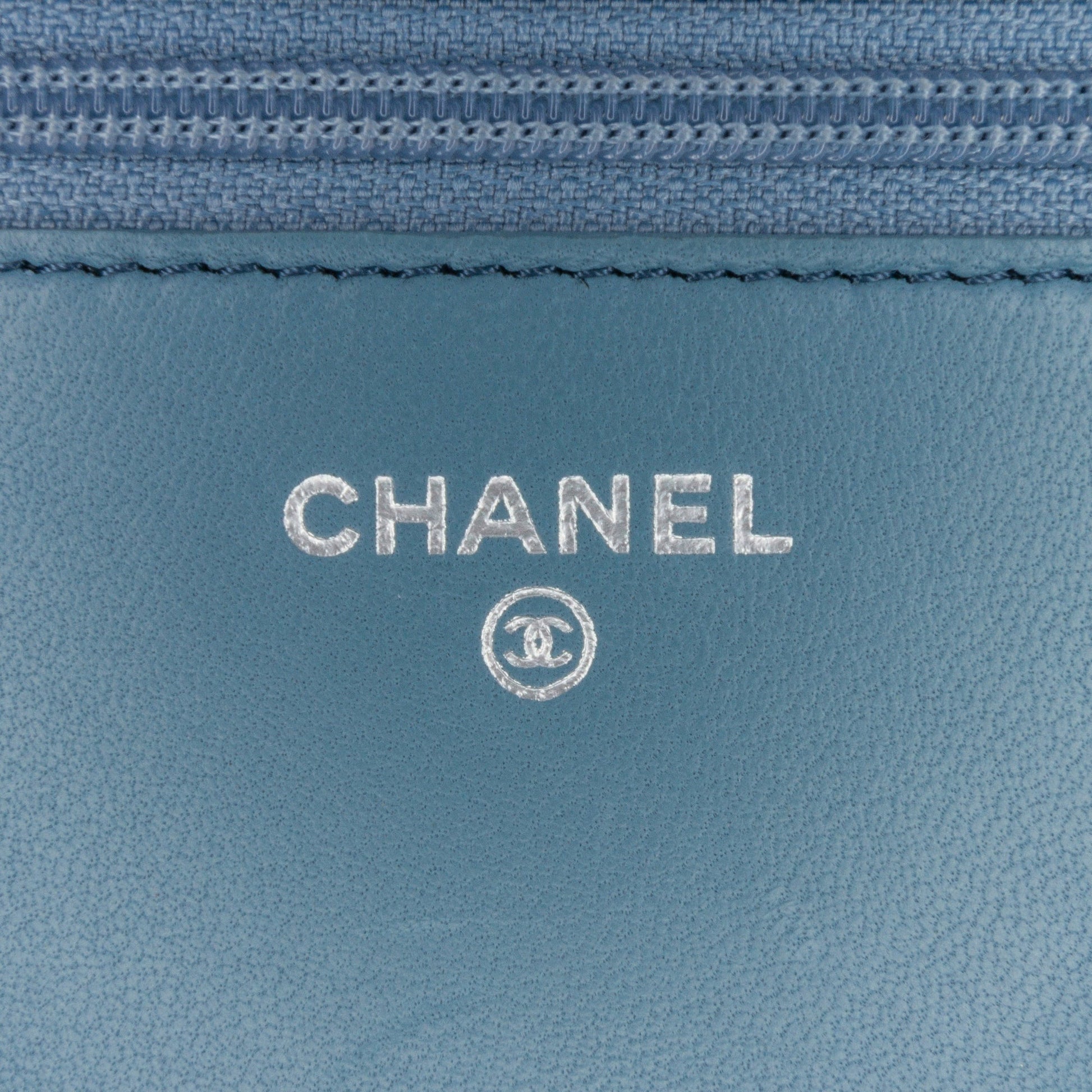 Product Details: Blue Chanel Lambskin Boy Wallet On Chain Crossbody Bag. The Boy wallet on chain features a lambskin leather body, leather woven chain strap, a front flap with magnetic snap closure, and interior zip and slip pockets. 4.9" L x 7.5" W x 1.2" D. Serial number 24948876.