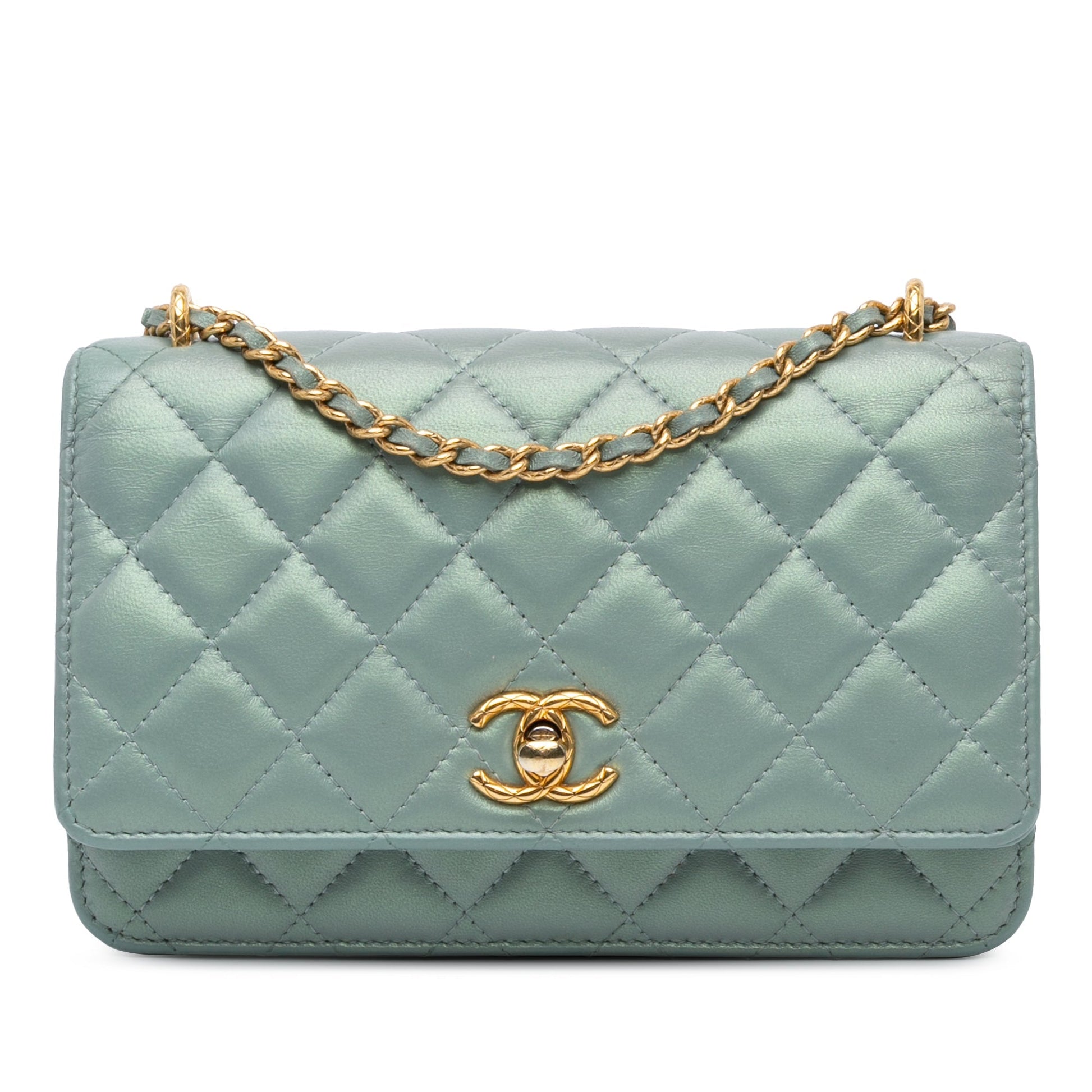 Product Details: Blue Chanel Lambskin Trendy CC Wallet On Chain Crossbody Bag. This wallet on chain features a quilted lambskin leather body, a leather-woven chain strap, a front flap with interlocking C turnlock closure, and interior zip and slip pockets. Exterior back has been repainted. 4.7" L x 3.5" W x 2" D, 13" drop. Serial number TACNXJN7.