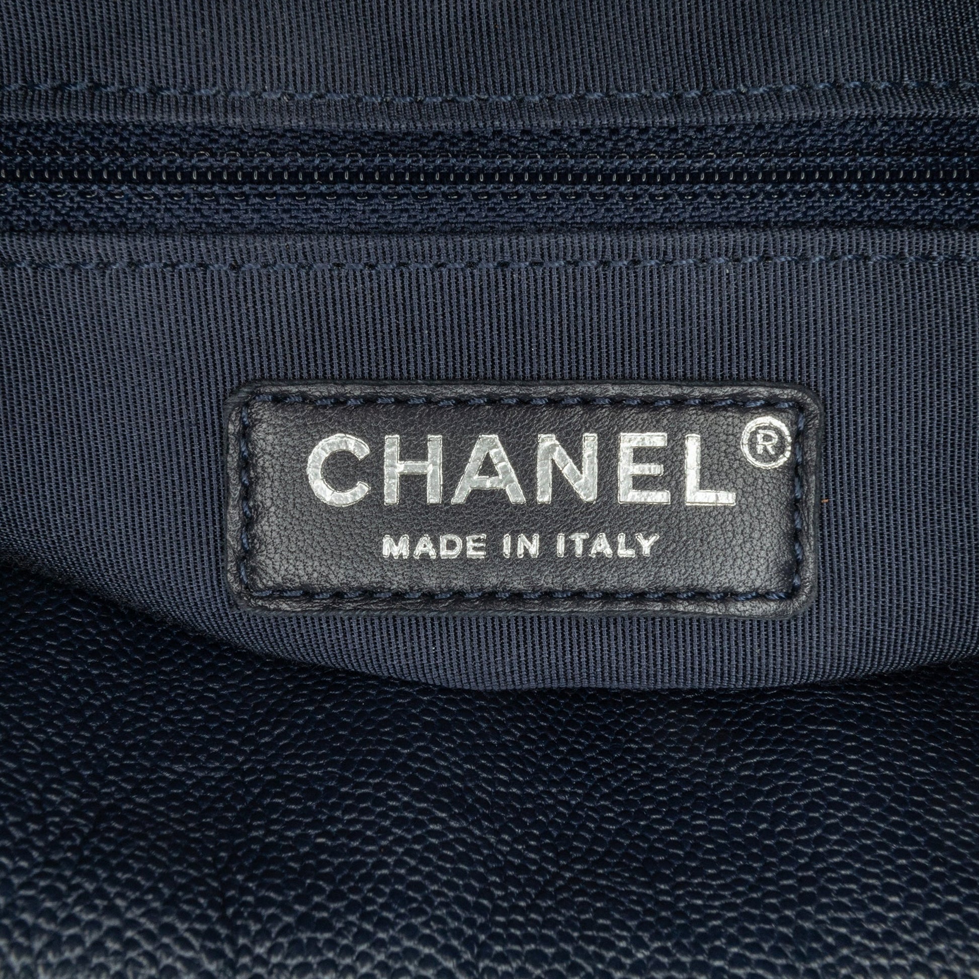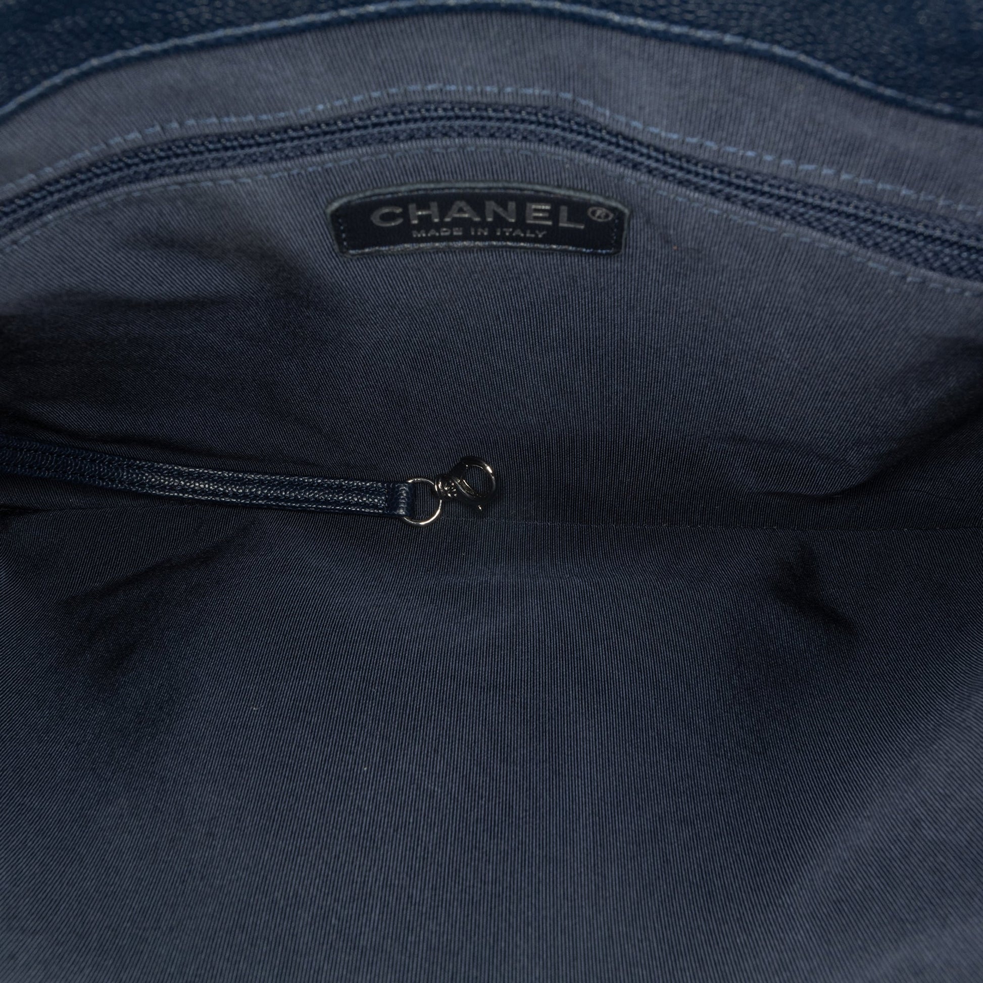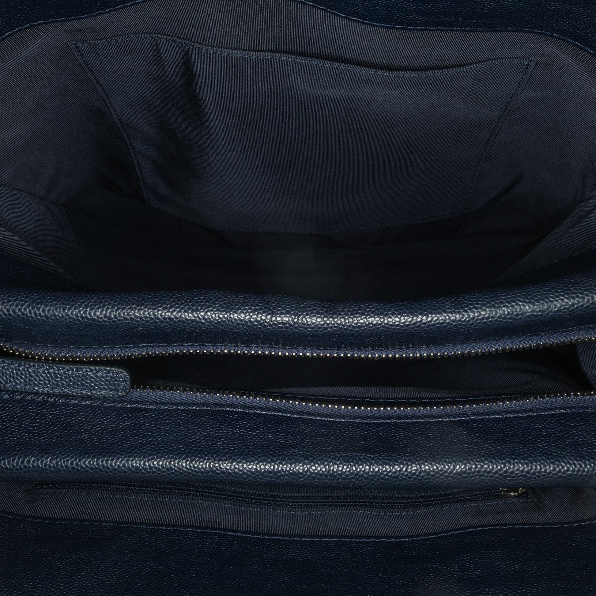 Product Details: Blue Chanel Large Quilted Caviar Urban Companion Tote Satchel. This satchel features a caviar leather body, flat leather handles, leather woven chain link straps with leather guard, open compartments, a zip compartment, an exterior back slip pocket, and interior zip and slip pockets. 9.4" L x 13.4" W x 4.7" D, 4.3" drop. Serial number 25279126.