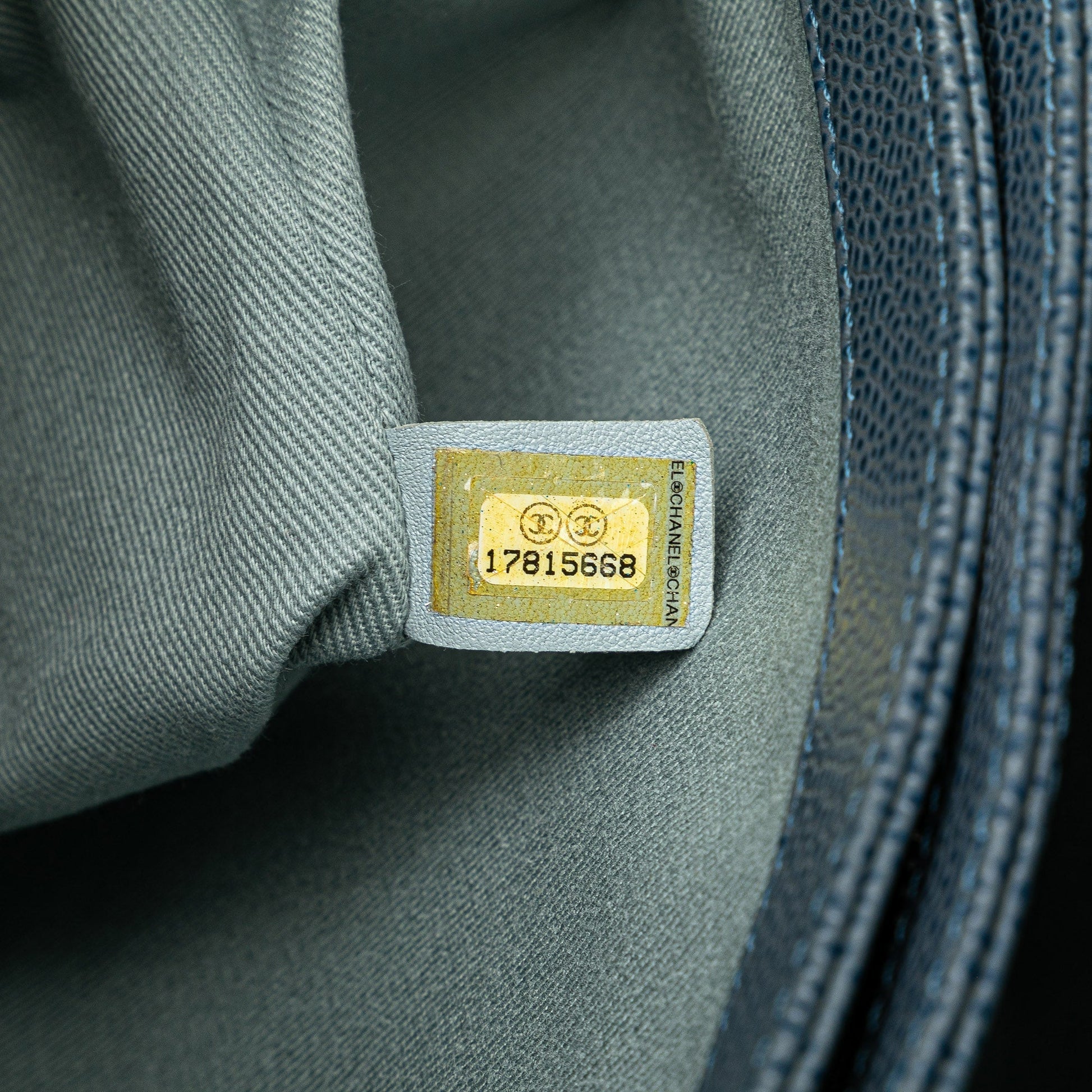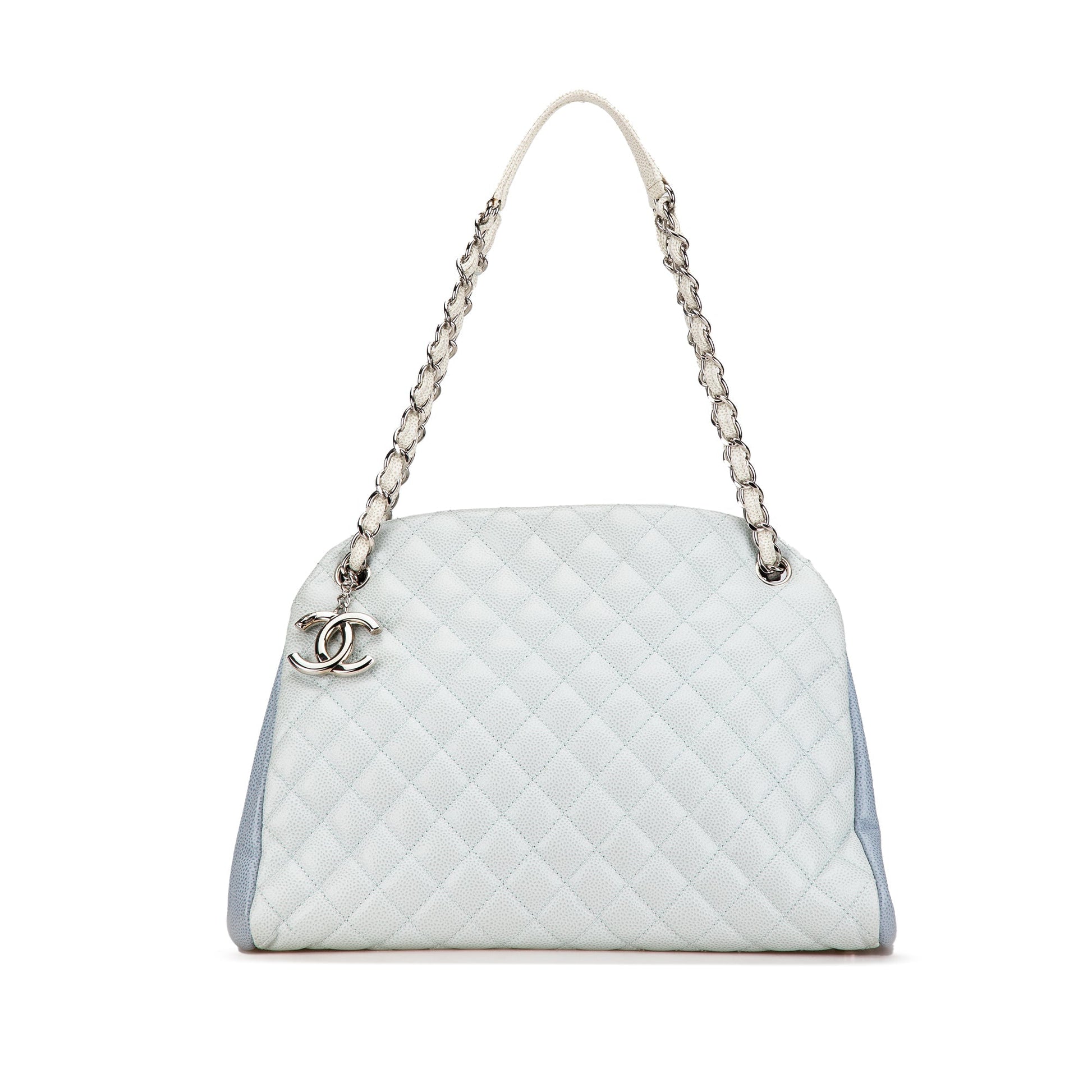 Product Details: Blue Chanel Large Tricolor Caviar Just Mademoiselle Bowling Bag. The Just Mademoiselle features a quilted caviar leather body, leather-woven chain straps, an open top with magnetic snap closure, an interior zip compartment, and interior zip and slip pockets. 9.8" L x 13" W x 5.5" D. Serial number 17815668.