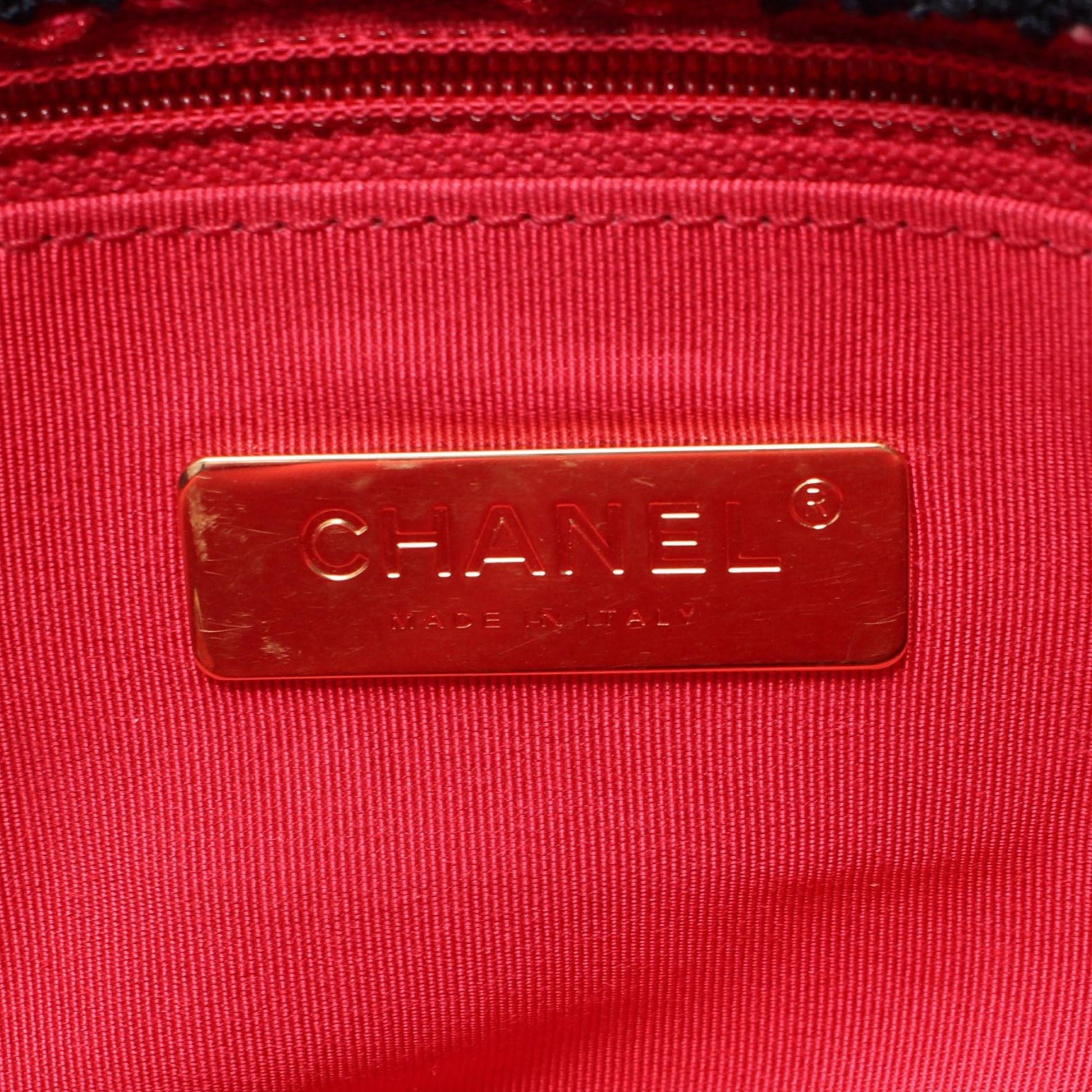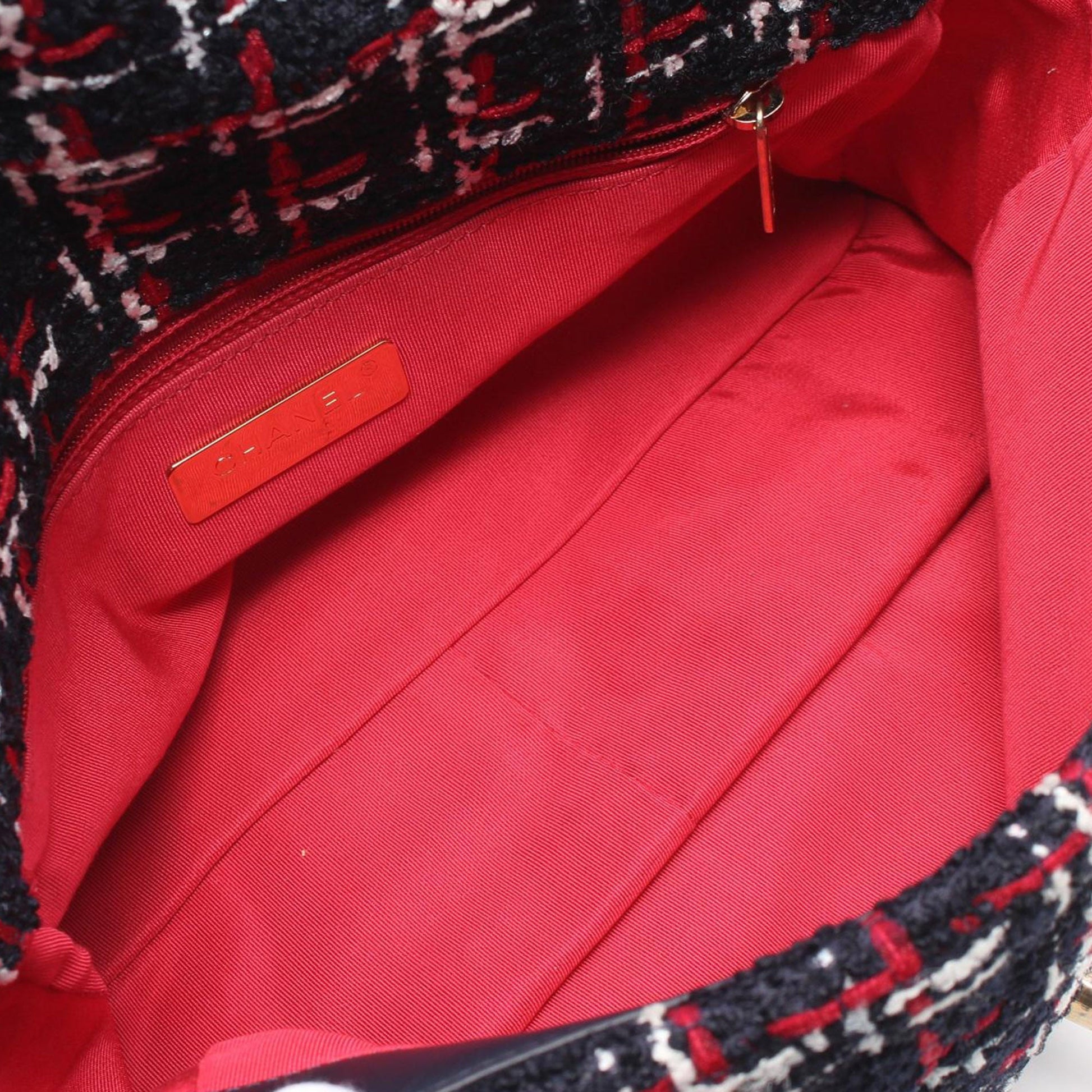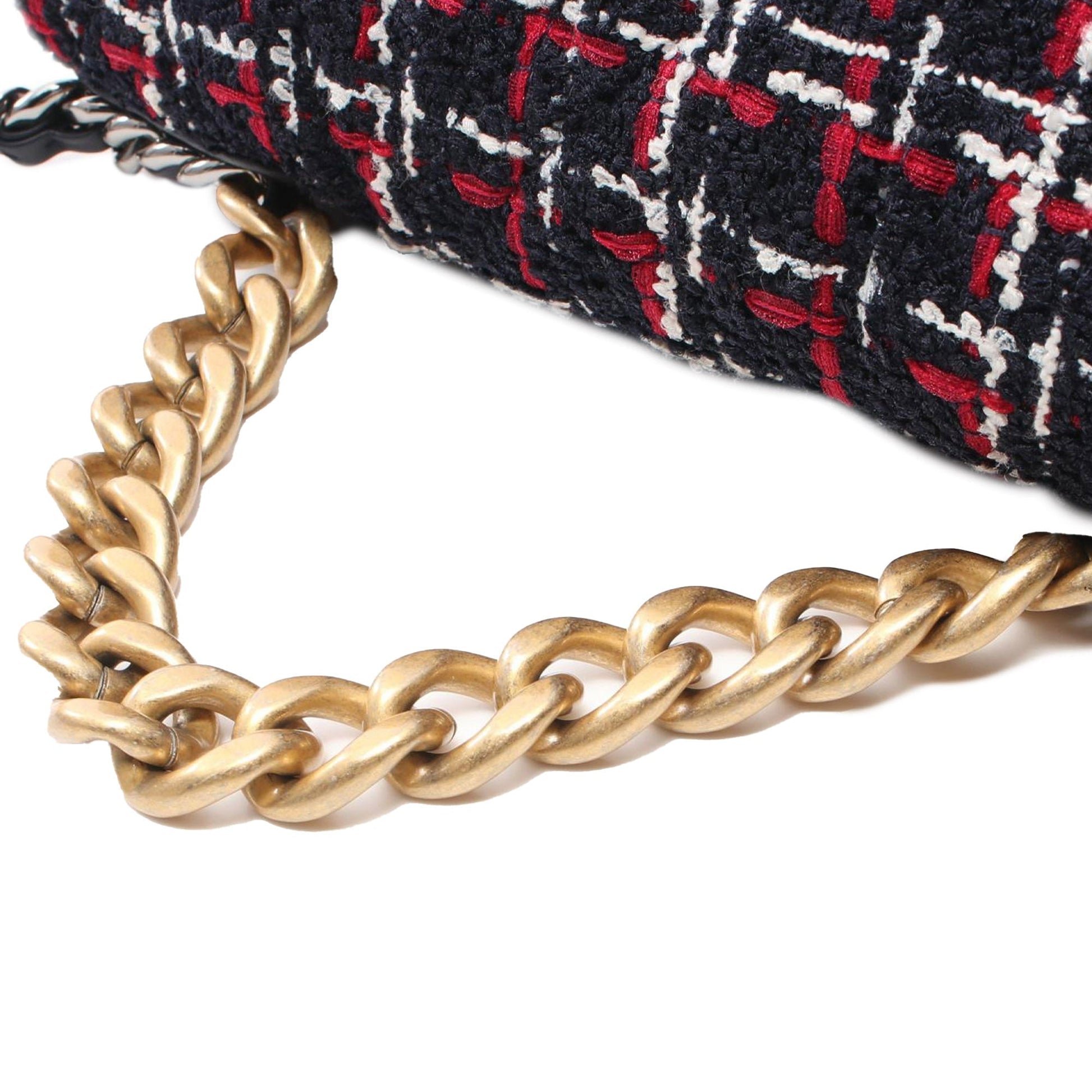 Product Details: Blue Chanel Large Tweed 19 Flap Satchel. The 19 Flap Bag features a tweed body, a gold-tone chain link handle, a leather woven chain link shoulder strap with leather guard, a front flap with chain CC logo turn lock closure, and an interior zip pocket. 7.9" L x 11.8" W x 3.1" D, 3.5" drop. Serial number 30008131.