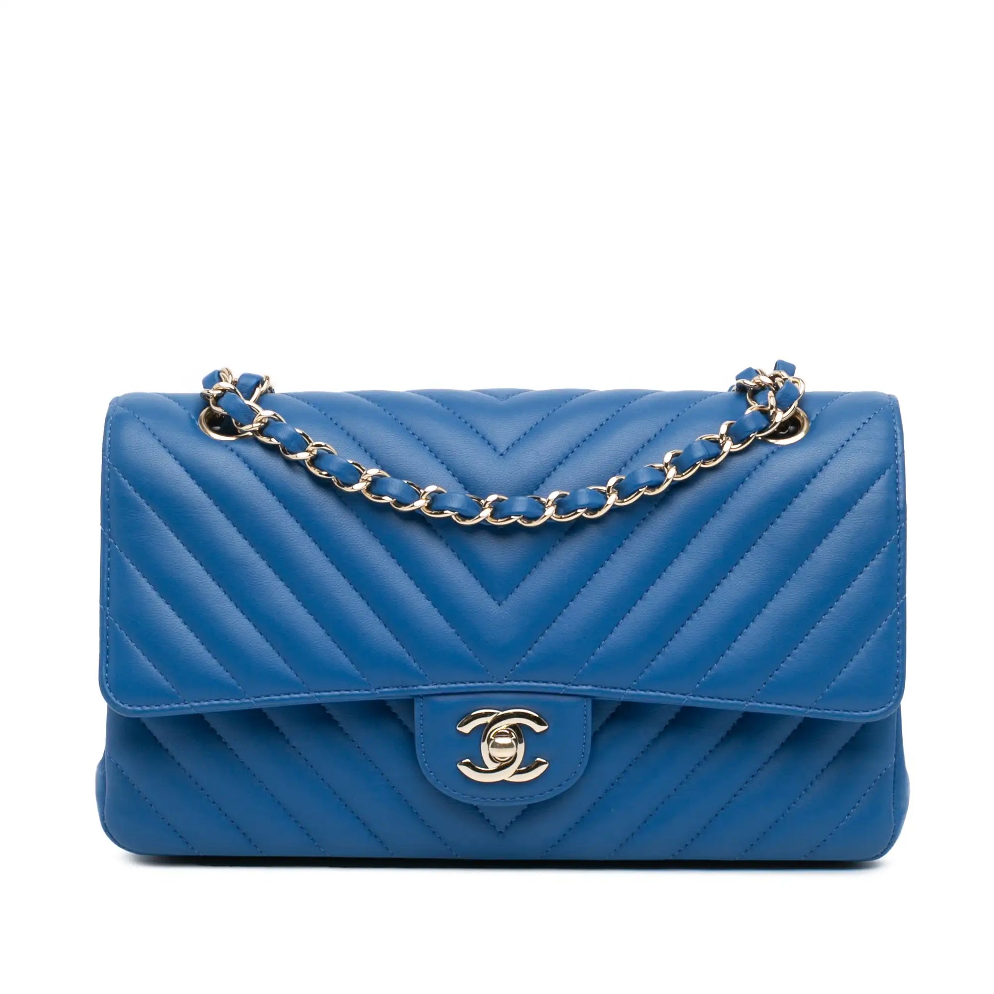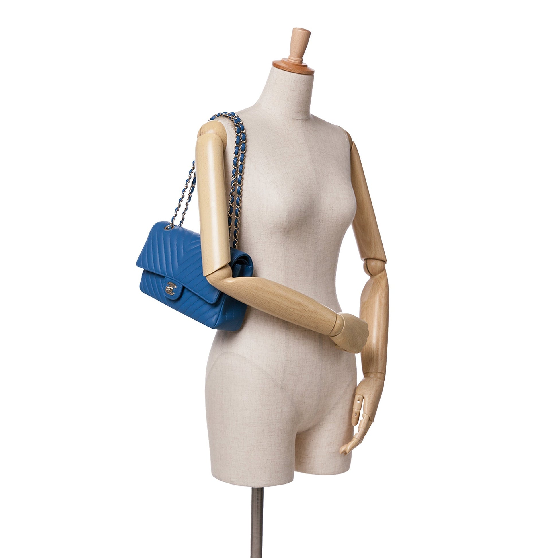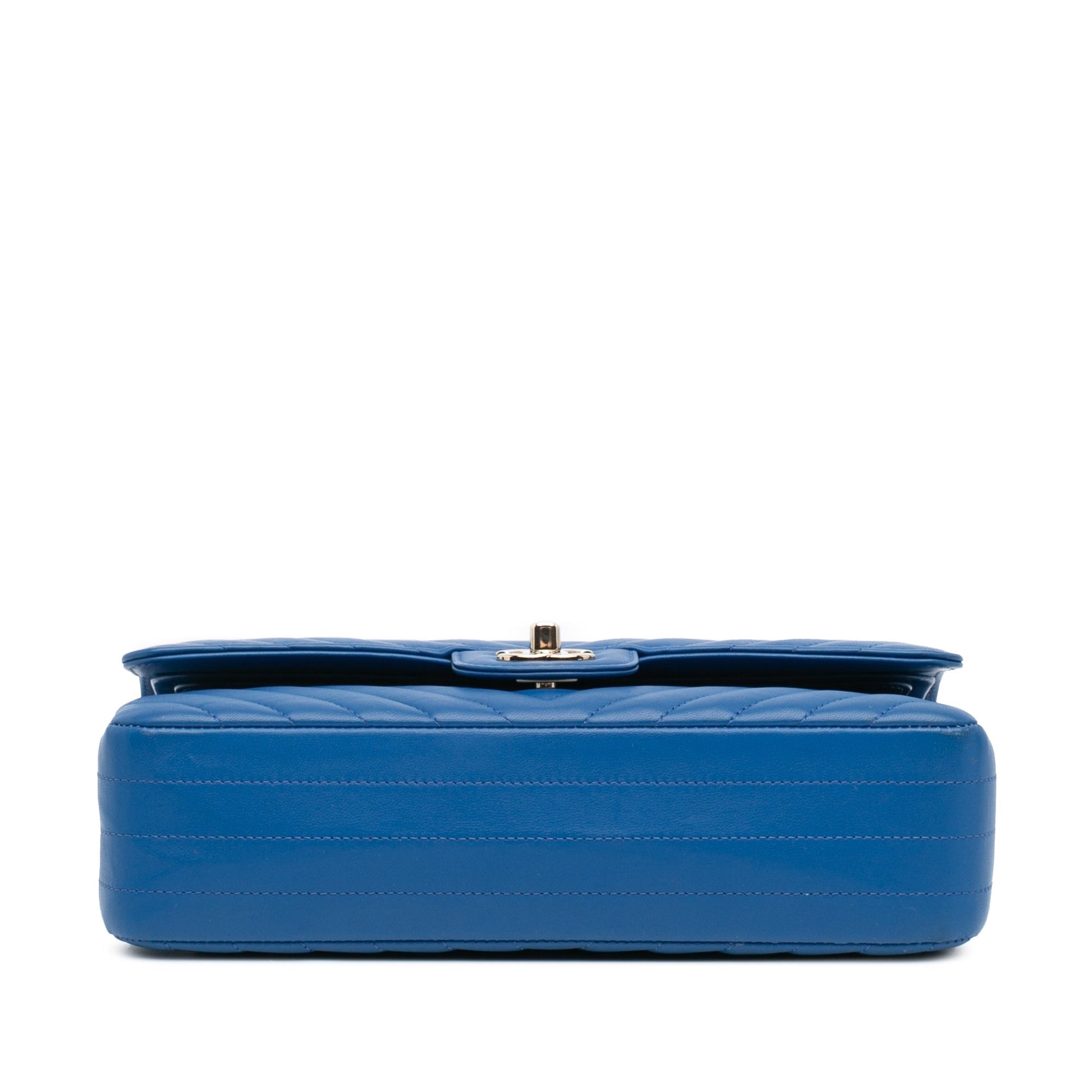 Product Details: Blue Chanel Medium Classic Chevron Lambskin Double Flap Shoulder Bag. This shoulder bag features a quilted lambskin leather body, a leather woven chain link shoulder strap, front flaps with interlocking Cs and twist lock closure, an exterior back slip pocket, and interior zip and slip pockets. 5.9" L x 10" W x 2.8" D, 10.2" drop. Serial number 27168910.