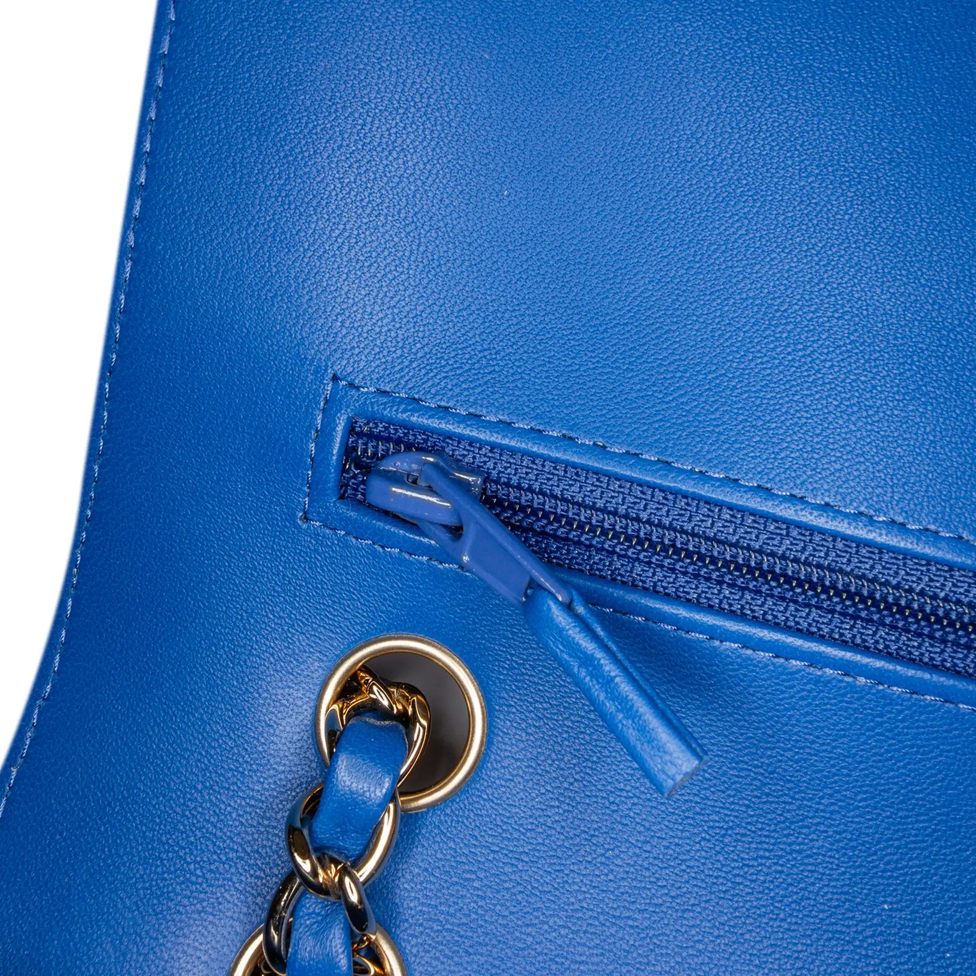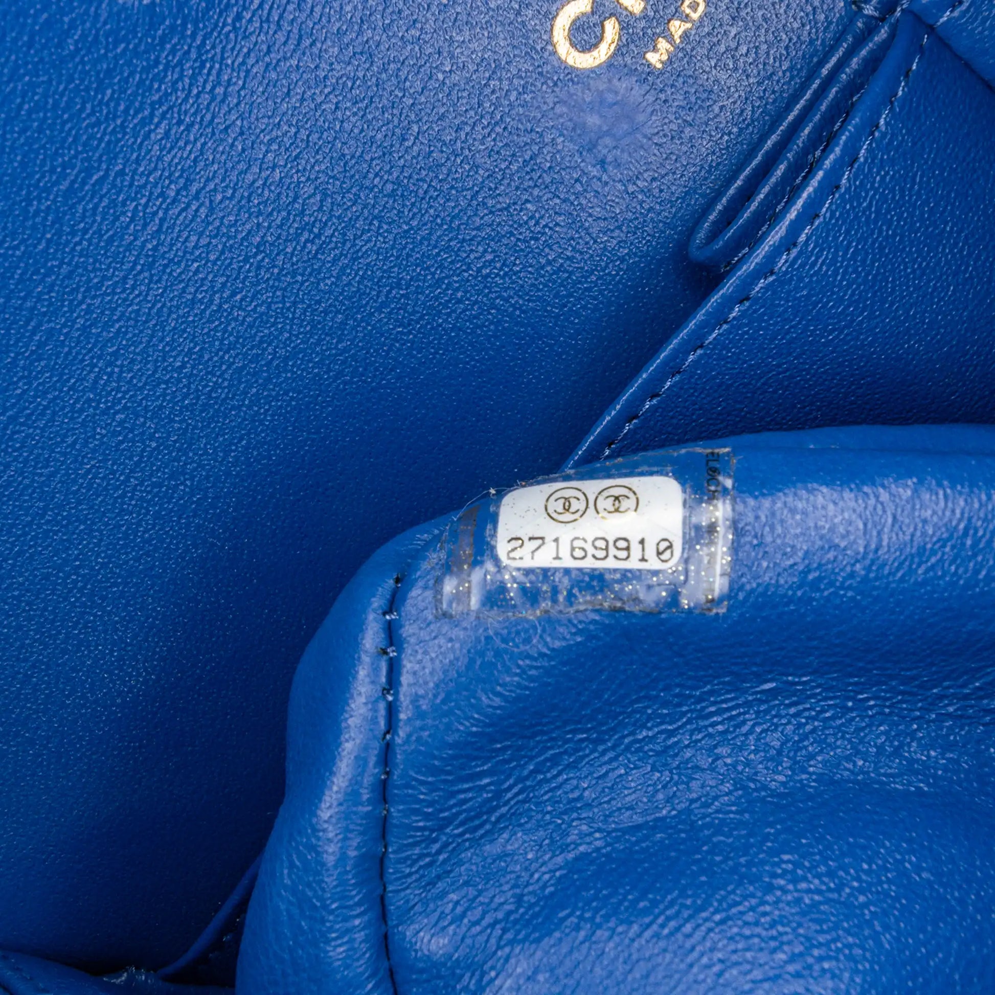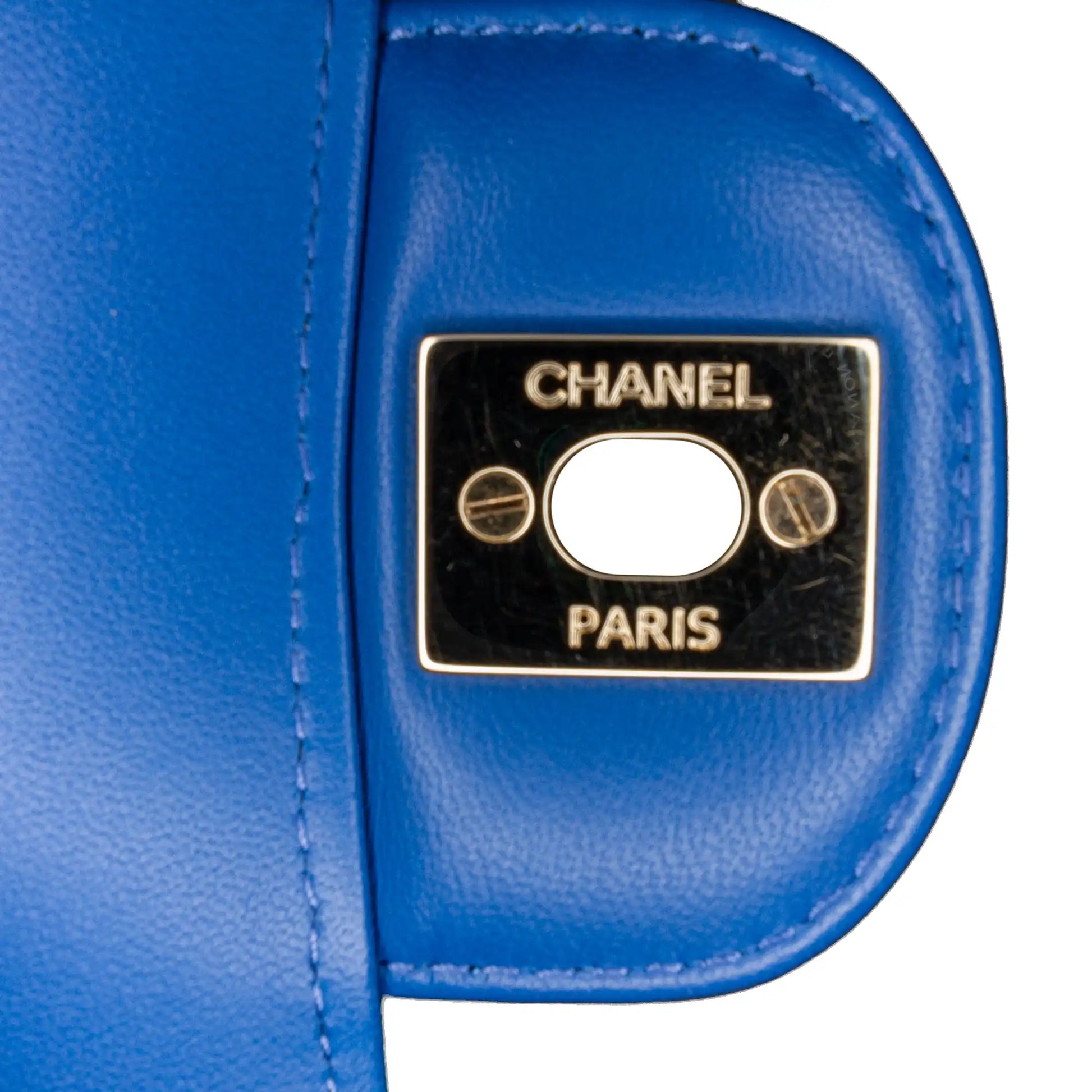 Product Details: Blue Chanel Medium Classic Chevron Lambskin Double Flap Shoulder Bag. This shoulder bag features a quilted lambskin leather body, a leather woven chain link shoulder strap, front flaps with interlocking Cs and twist lock closure, an exterior back slip pocket, and interior zip and slip pockets. 5.9" L x 10" W x 2.8" D, 10.2" drop. Serial number 27168910.