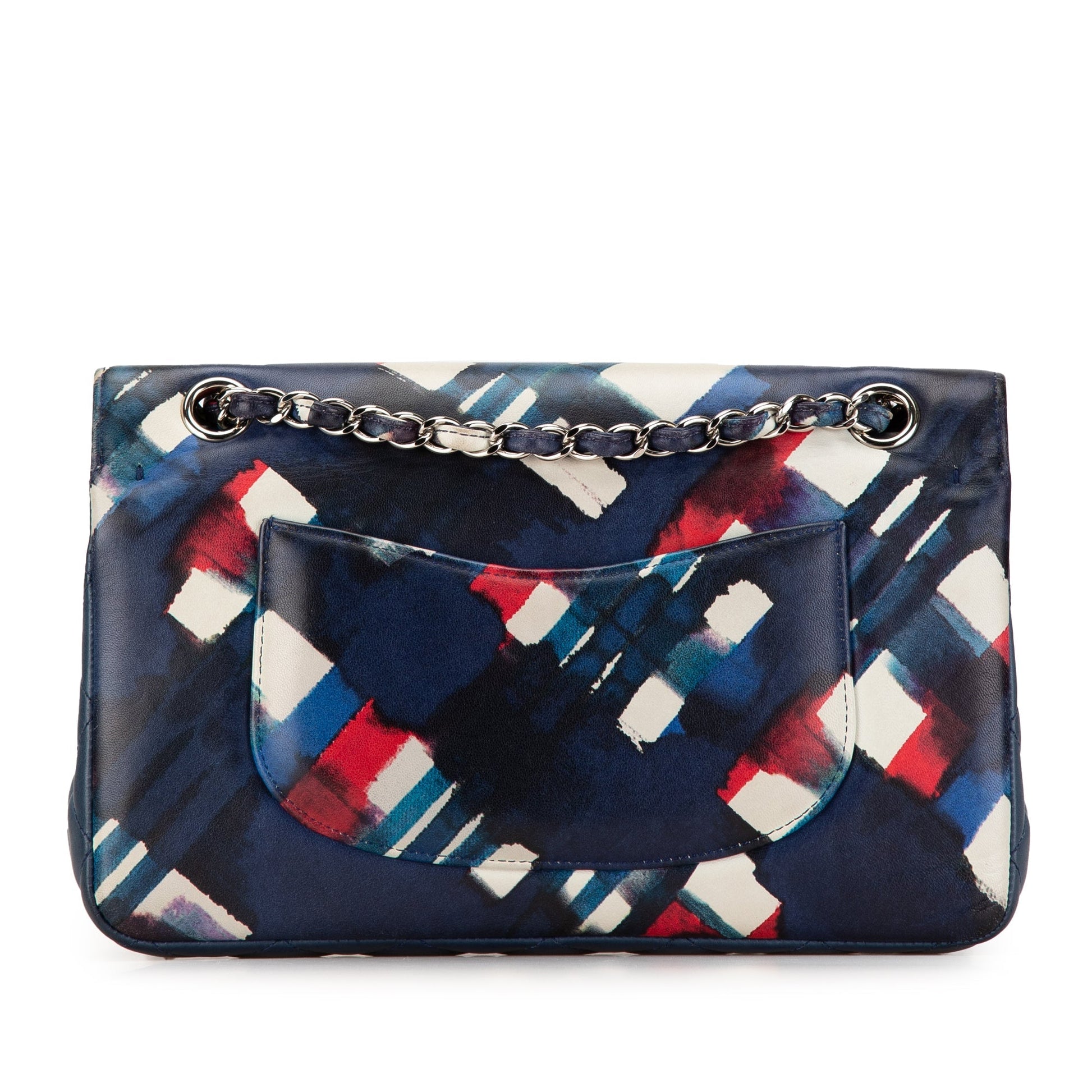 Product Details: Blue Chanel Medium Classic Lambskin Airlines Double Flap Shoulder Bag. This shoulder bag features a printed lambskin leather body, leather-woven chain straps, double front flaps with CC turn-lock closure, an exterior back slip pocket, and interior zip and slip pockets. 5.9" L x 10" W x 2.6" D, 9.4" drop. Serial number 22581716.