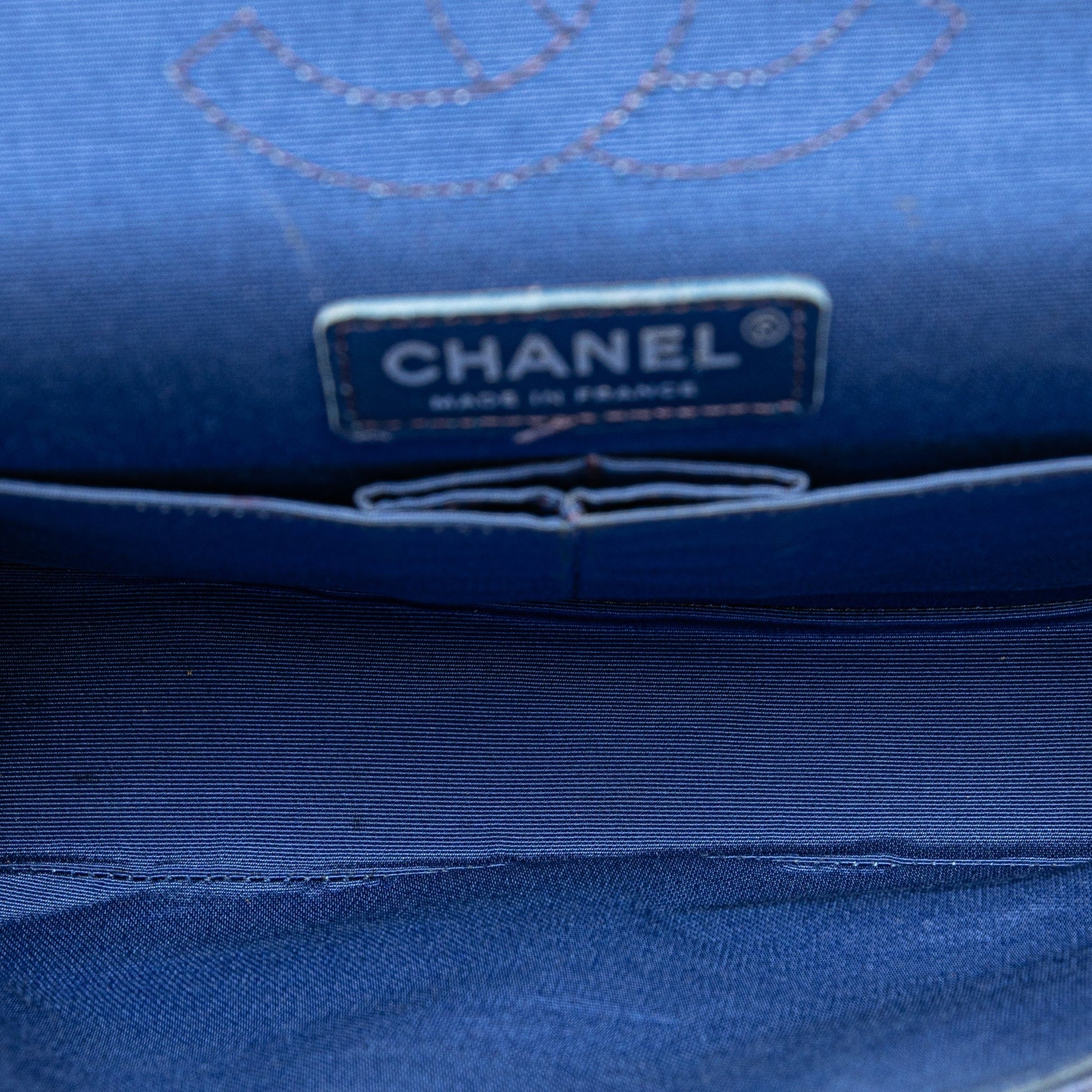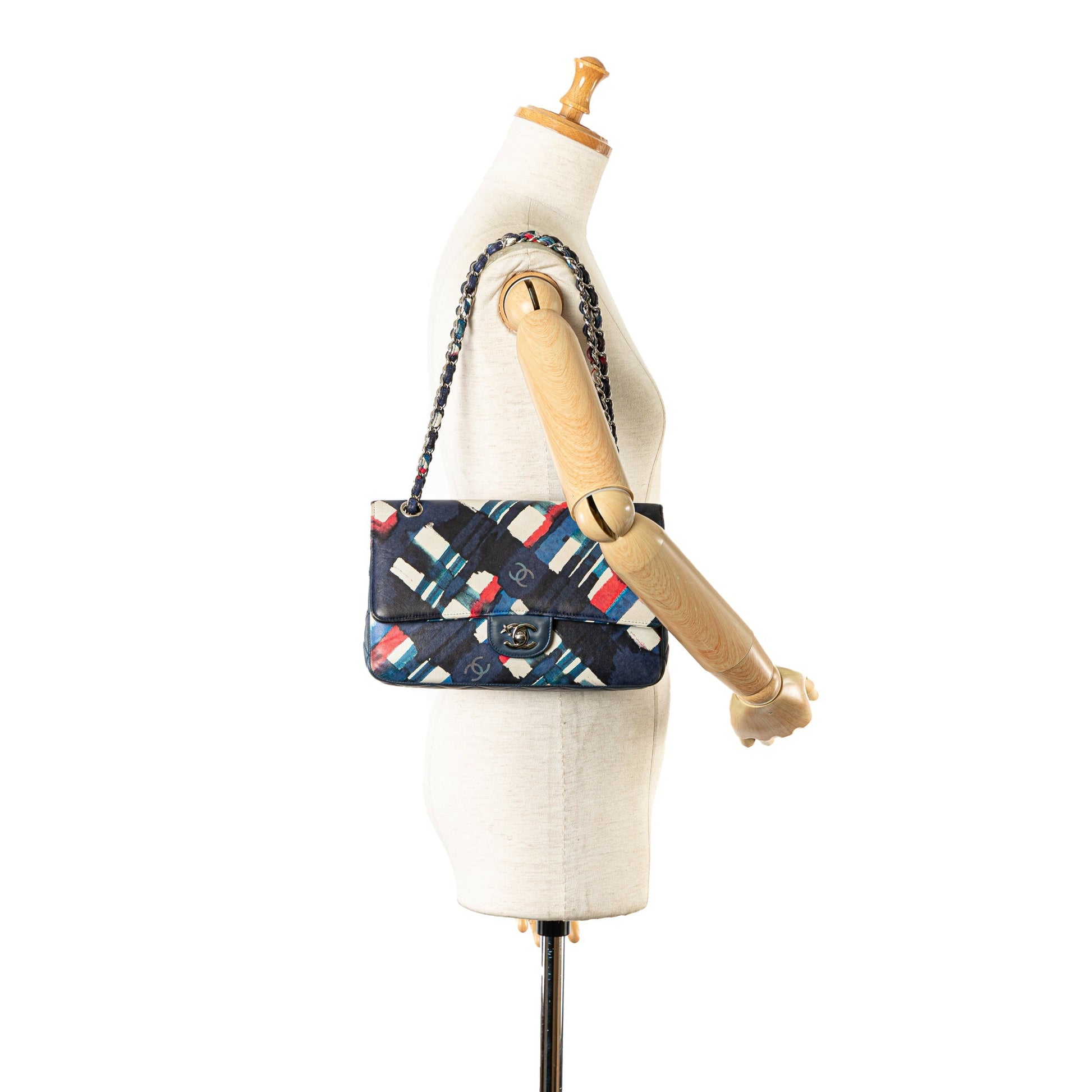 Product Details: Blue Chanel Medium Classic Lambskin Airlines Double Flap Shoulder Bag. This shoulder bag features a printed lambskin leather body, leather-woven chain straps, double front flaps with CC turn-lock closure, an exterior back slip pocket, and interior zip and slip pockets. 5.9" L x 10" W x 2.6" D, 9.4" drop. Serial number 22581716.