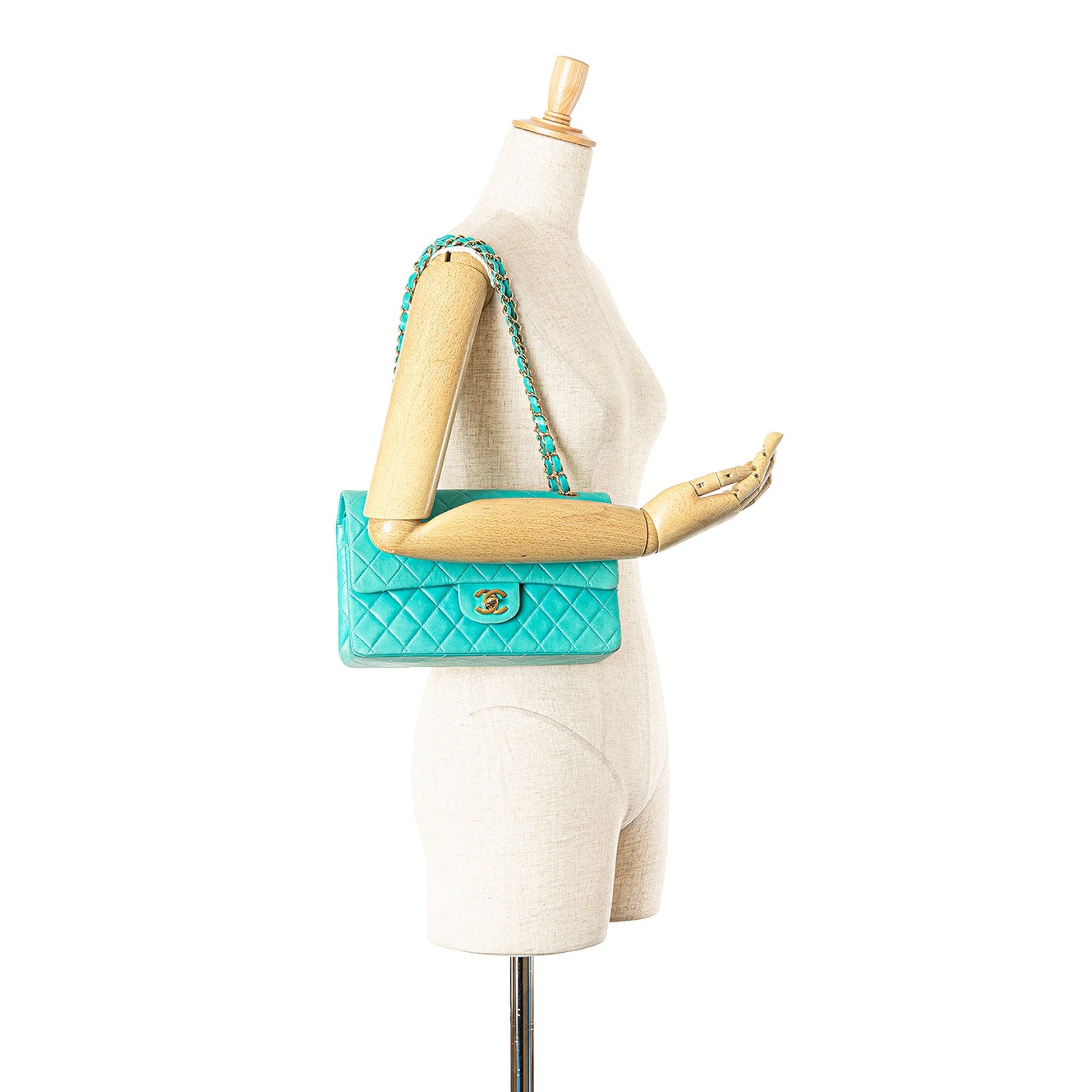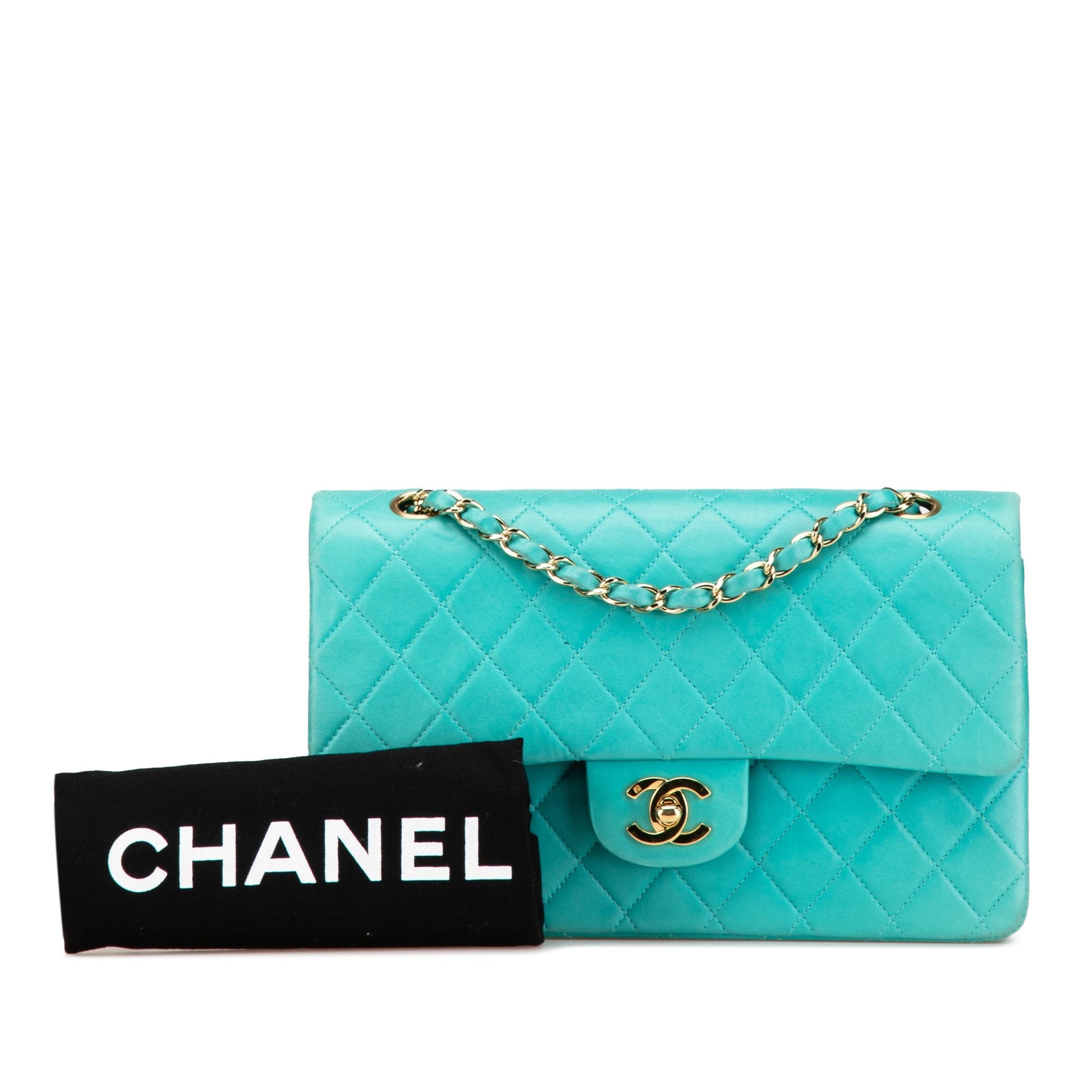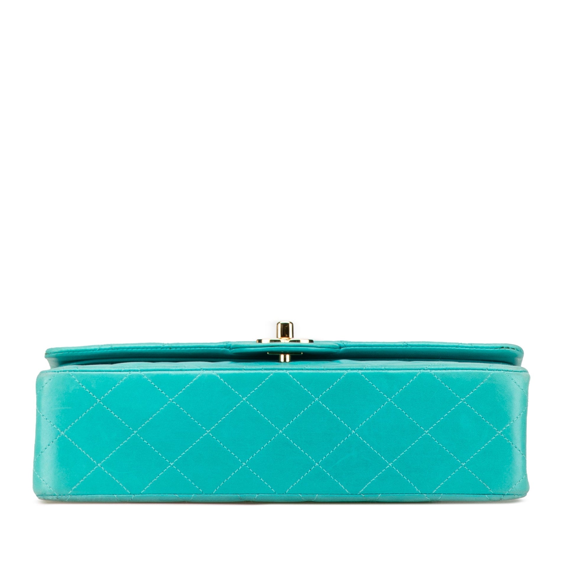 Product Details: Blue Chanel Medium Classic Lambskin Double Flap Shoulder Bag. This shoulder bag features a quilted lambskin body, leather woven chain straps, double front flaps with interlocking Cs and a twist lock closure, an exterior back slip pocket, and interior zip and slip pockets. 5.5" L x 9.8" W x 2.6" D, 9.1" drop. Serial number 6969735.