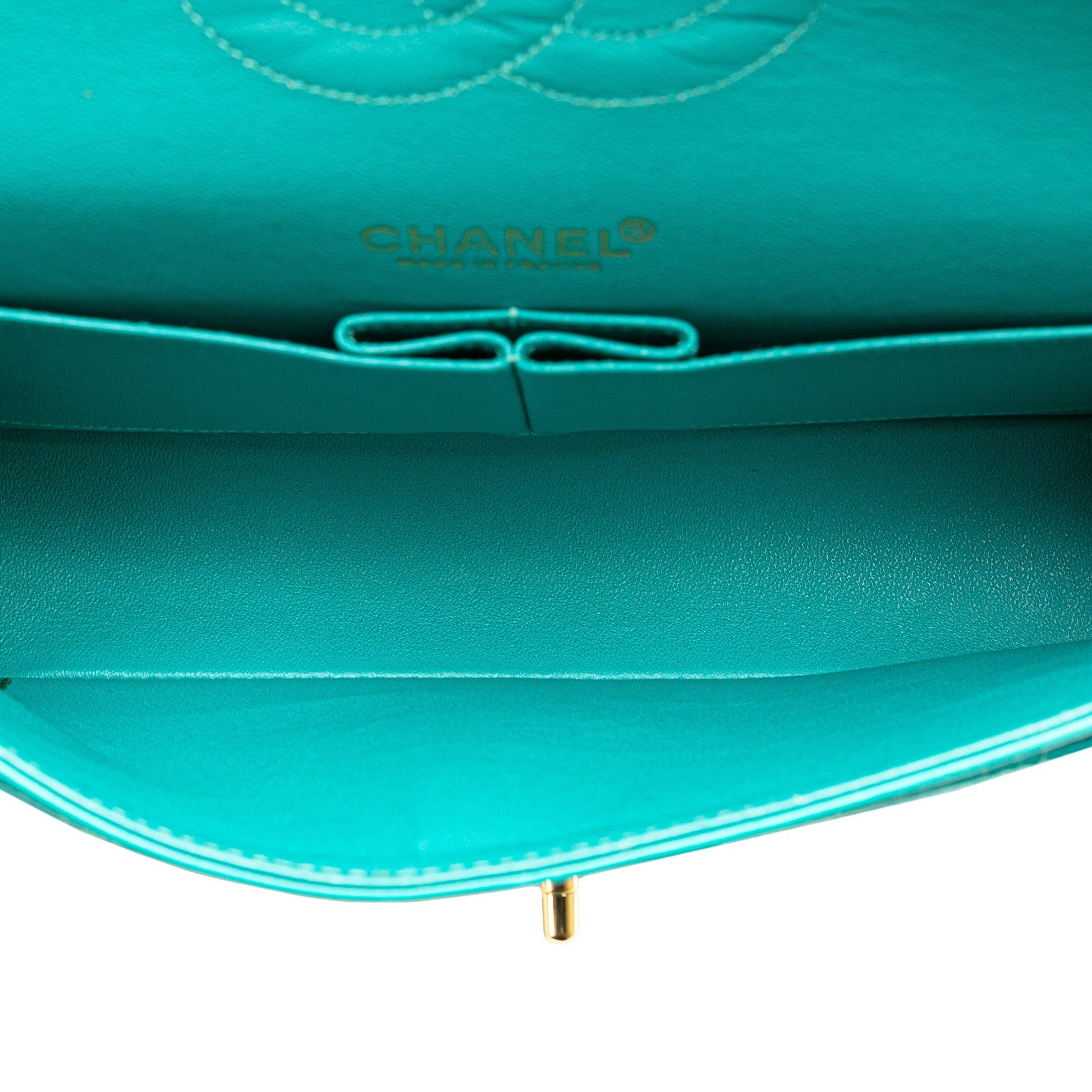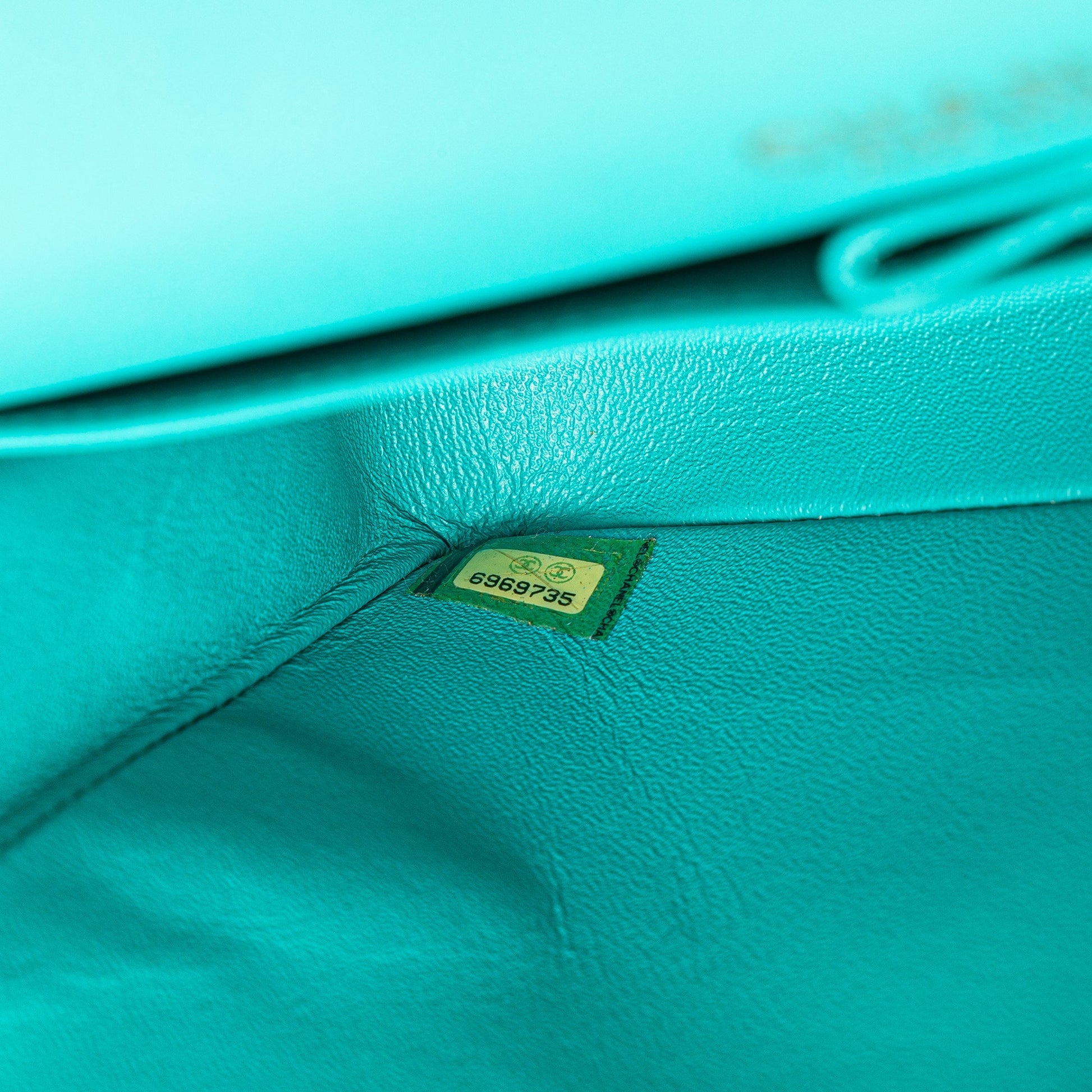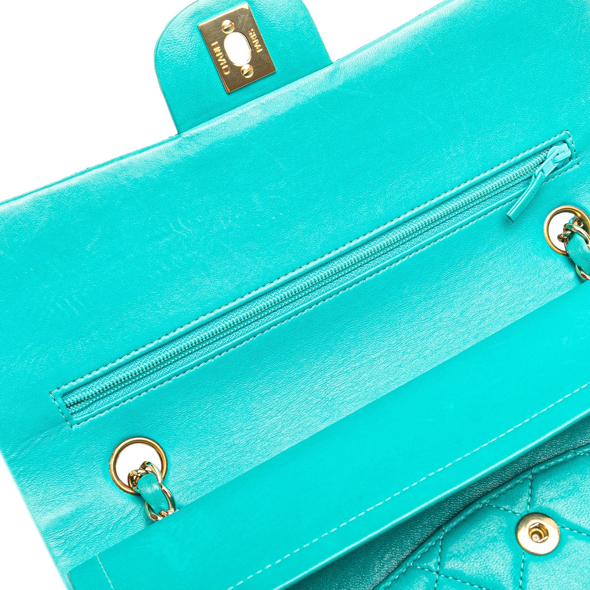 Product Details: Blue Chanel Medium Classic Lambskin Double Flap Shoulder Bag. This shoulder bag features a quilted lambskin body, leather woven chain straps, double front flaps with interlocking Cs and a twist lock closure, an exterior back slip pocket, and interior zip and slip pockets. 5.5" L x 9.8" W x 2.6" D, 9.1" drop. Serial number 6969735.