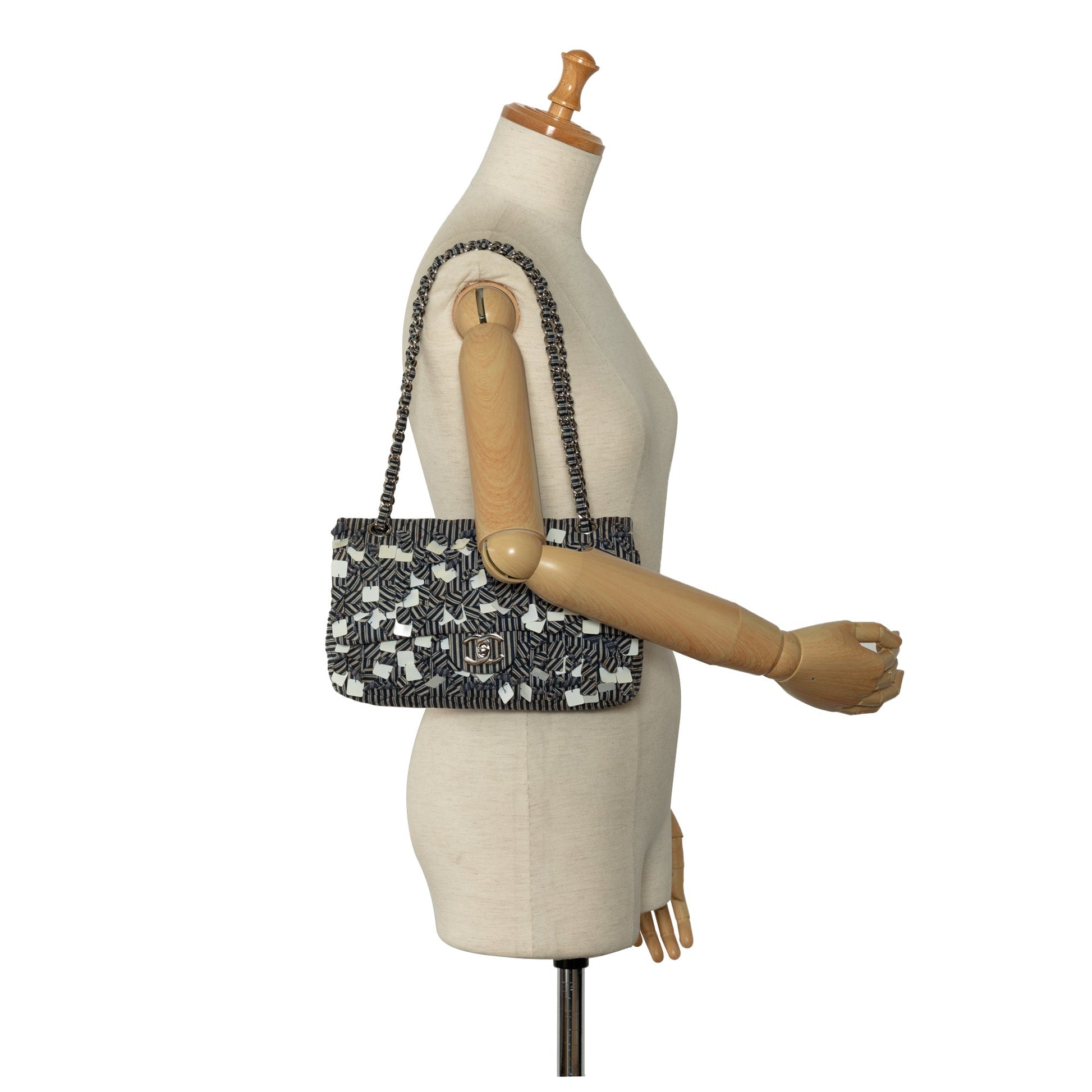 Product Details: Blue Chanel Medium Cotton Striped Double Flap Shoulder Bag. This shoulder bag features a fringe cotton body with plastic detail, silver-tone chain straps, a front flap with interlocking CC twist lock closure, an exterior slip pocket, and interior slip pockets. 5.9" L x 9.8" W x 2.4" D, 9.1" drop. Serial number 11972323.