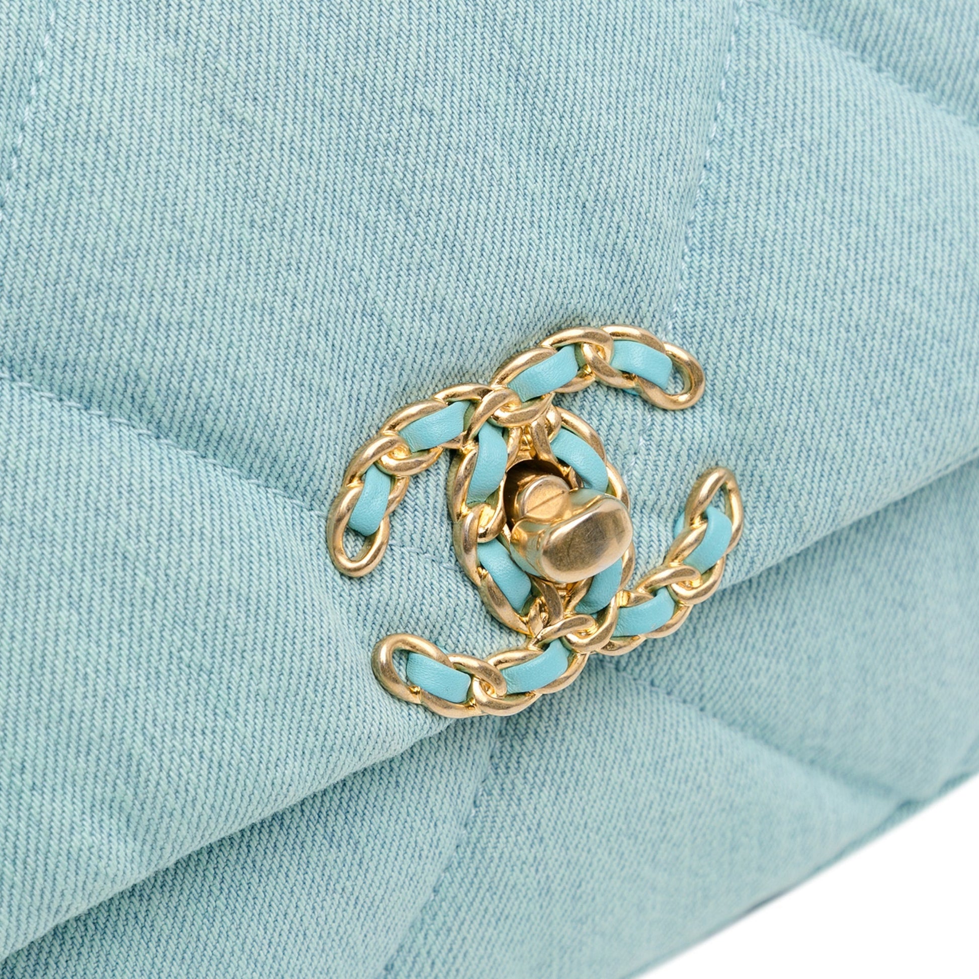 Product Details: Blue Chanel Medium Denim 19 Flap Satchel. The Medium 19 Flap bag features a quilted denim body, chain handle, a woven leather chain shoulder strap, a flap with a CC twist lock closure, an exterior slip pocket, and an interior zip pocket. 7.5" L x 10.2" W x 3.1" D, 3.1" drop. Serial number 31424118.