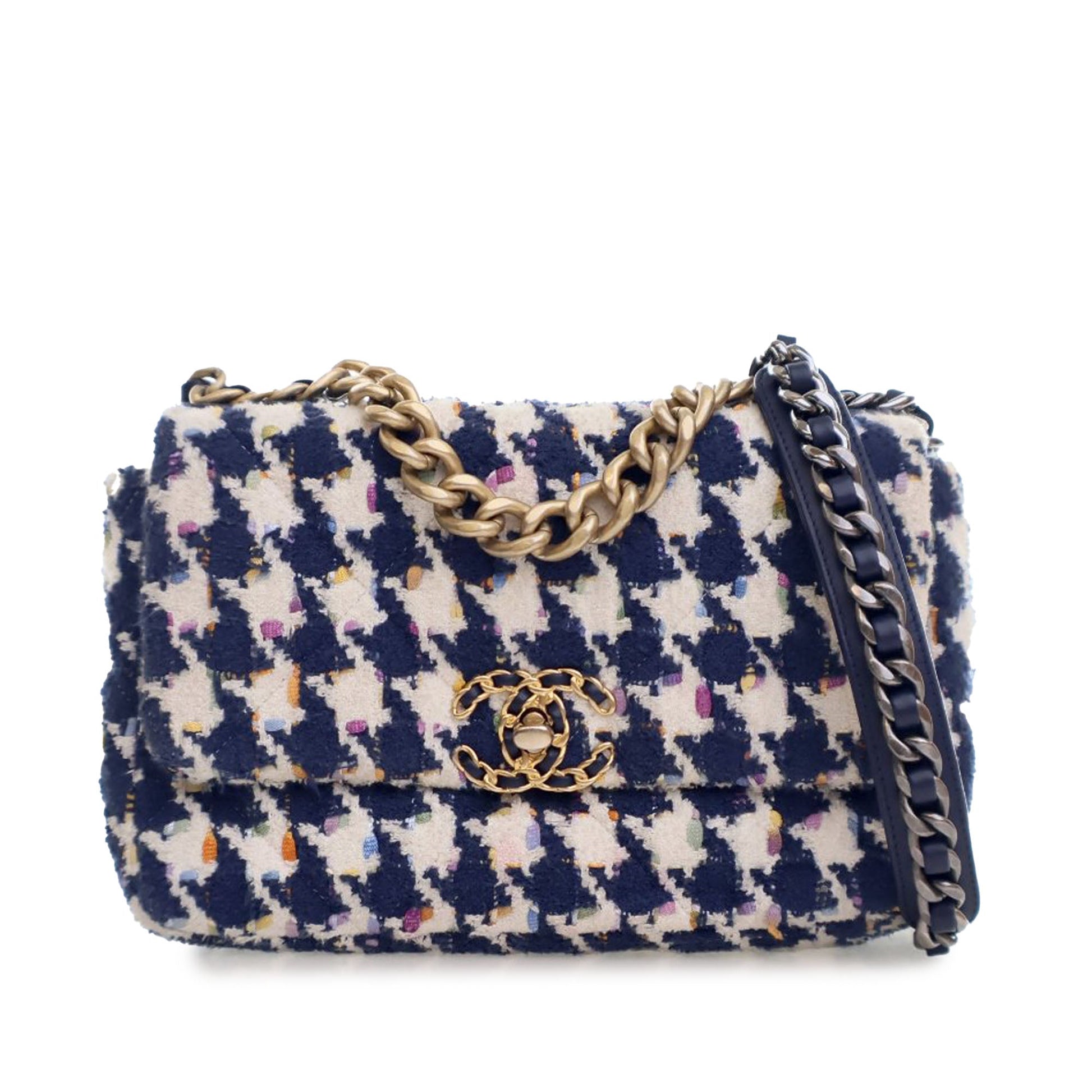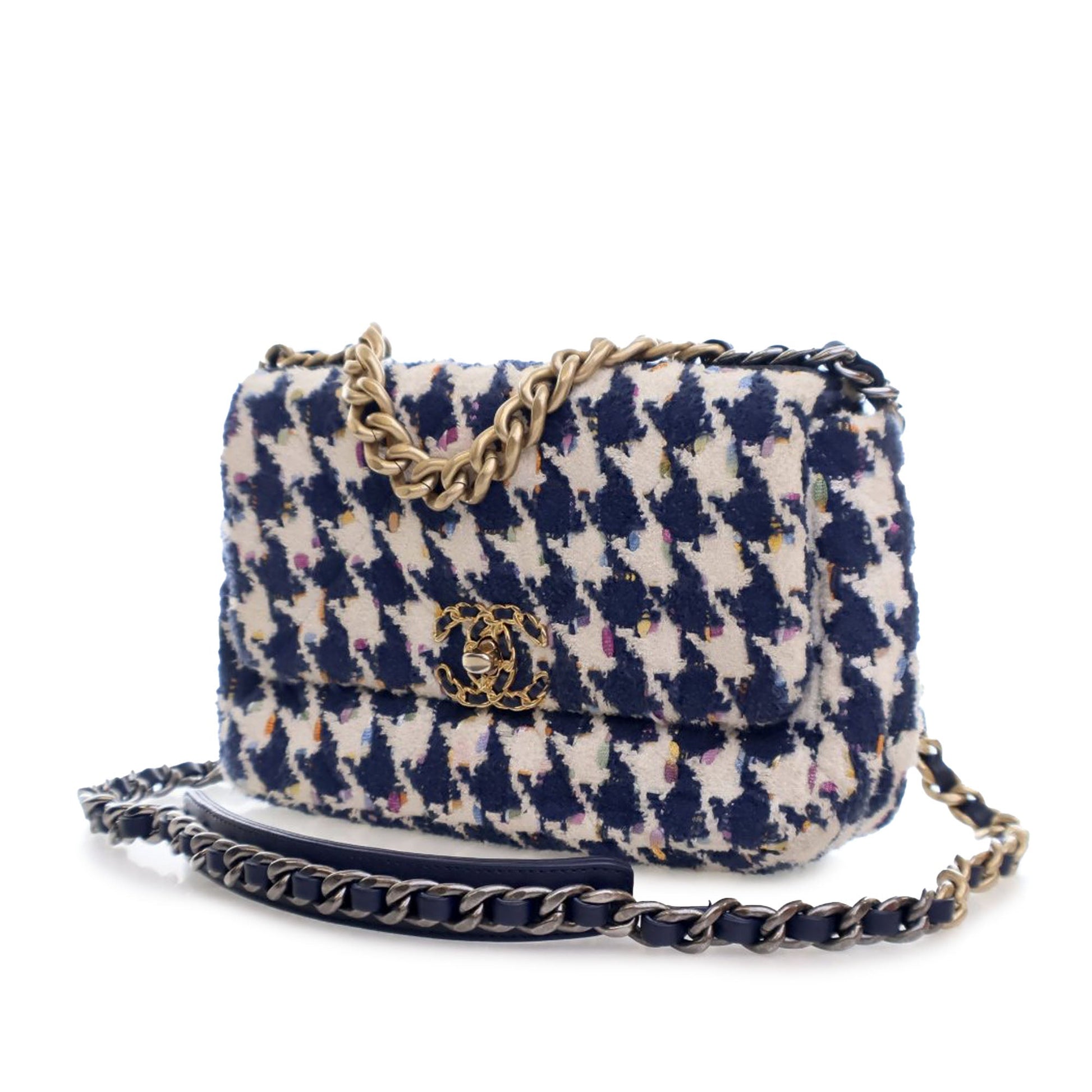 Product Details: Blue Chanel Medium Houndstooth Tweed 19 Flap Bag Satchel. The Medium 19 Flap bag features a tweed leather body, a gold-tone chain handle, a woven leather chain shoulder strap, a flap with a CC twist lock closure, an exterior slip pocket, and an interior zip pocket. 7.1" L x 9.8" W x 2.8" D, 3.5" drop. Serial number 3094xxxx.