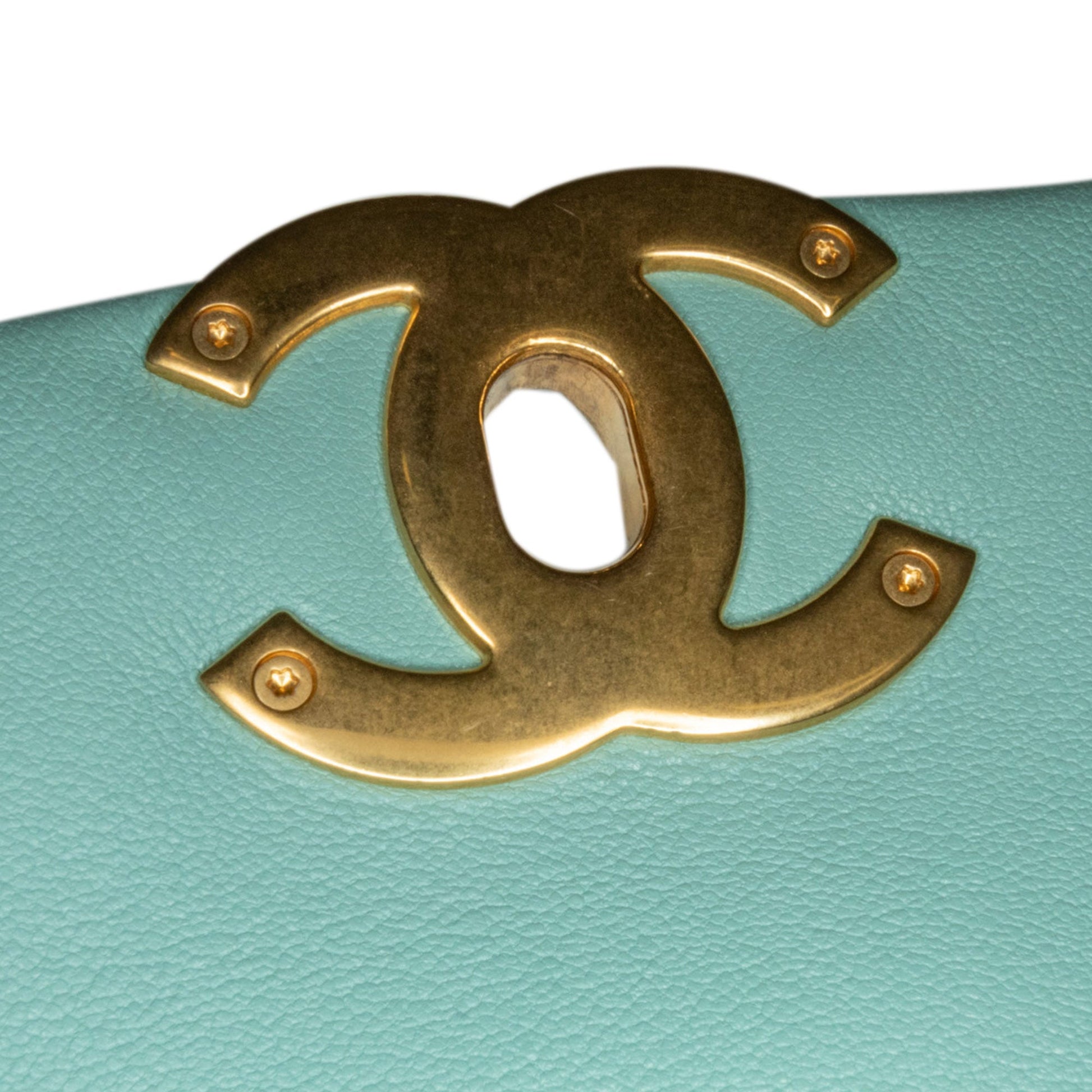 Product Details: Blue Chanel Medium Lambskin 19 Flap Satchel. The 19 Flap Bag features a quilted lambskin leather body, a chain link handle, a leather woven chain shoulder strap with leather guard, a front flap with twist-lock closure, an exterior back slip pocket, and an interior zip pocket. 7.3" L x 9.8" W x 3" D, 3.1" drop. Serial number 29190503.