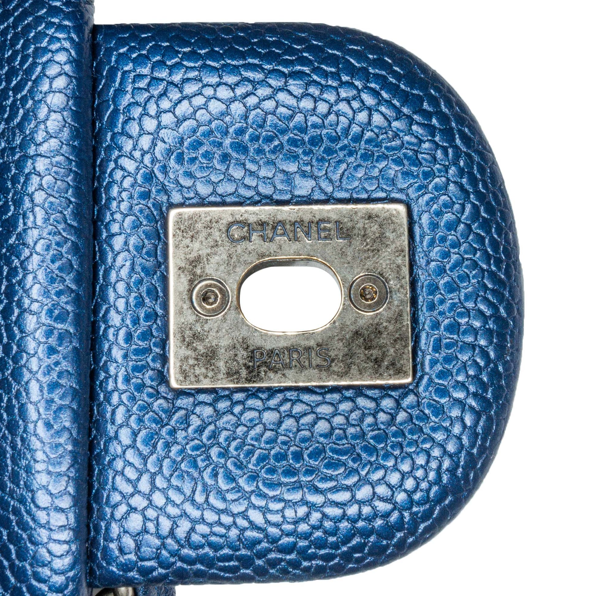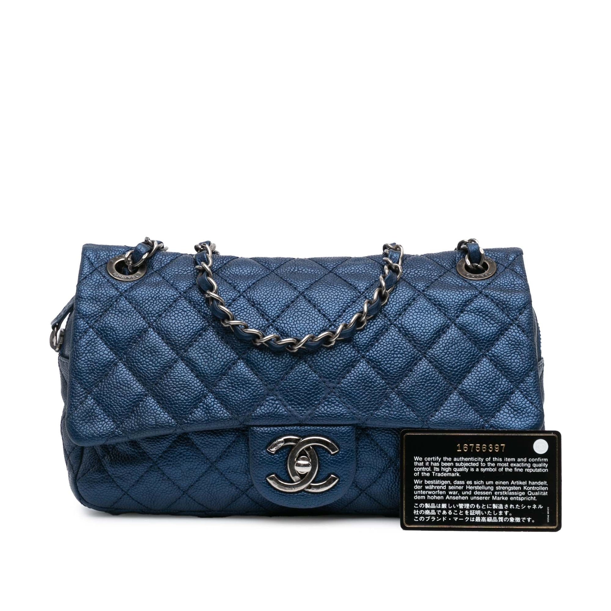 Product Details: Blue Chanel Medium Quilted Iridescent Caviar Easy Flap Shoulder Bag. This crossbody bag features a quilted caviar leather body, a leather woven chain strap, a flap with CC turn-lock closure, a top zip closure, and an interior zip pocket. 6.3" L x 10" W x 2.2" D, 9.4" drop. Serial number 16756397.