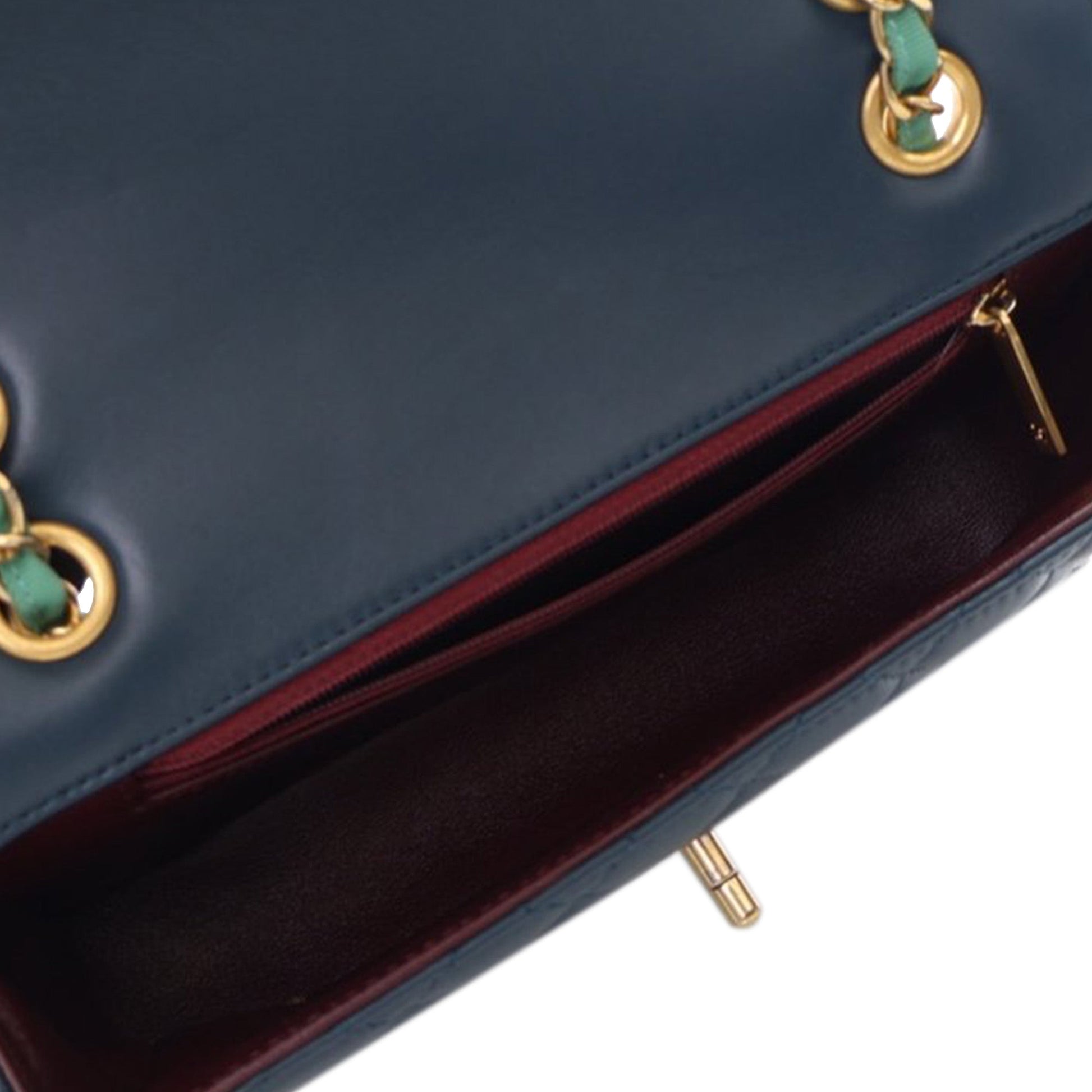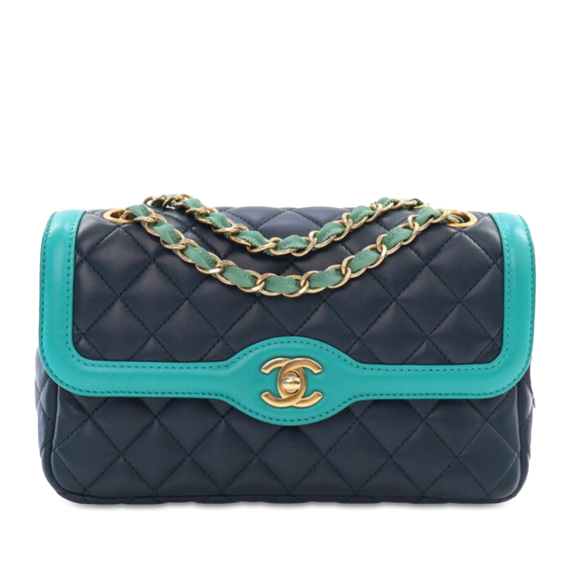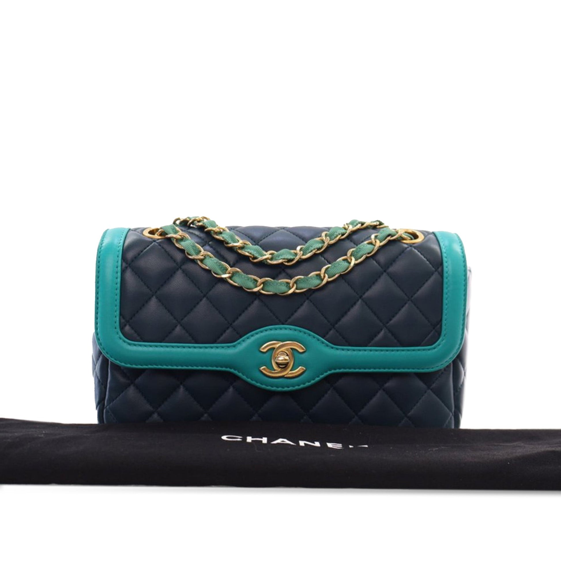 Product Details: Blue Chanel Medium Quilted Lambskin Two-Tone Day Flap Crossbody Bag. This crossbody bag features a quilted lambskin leather body, leather woven chain straps, a front flap with twist lock closure, an exterior back slip pocket, and interior zip and slip pockets. 6.7" L x 10.2" W x 2.8" D. Serial number 2375xxxx.