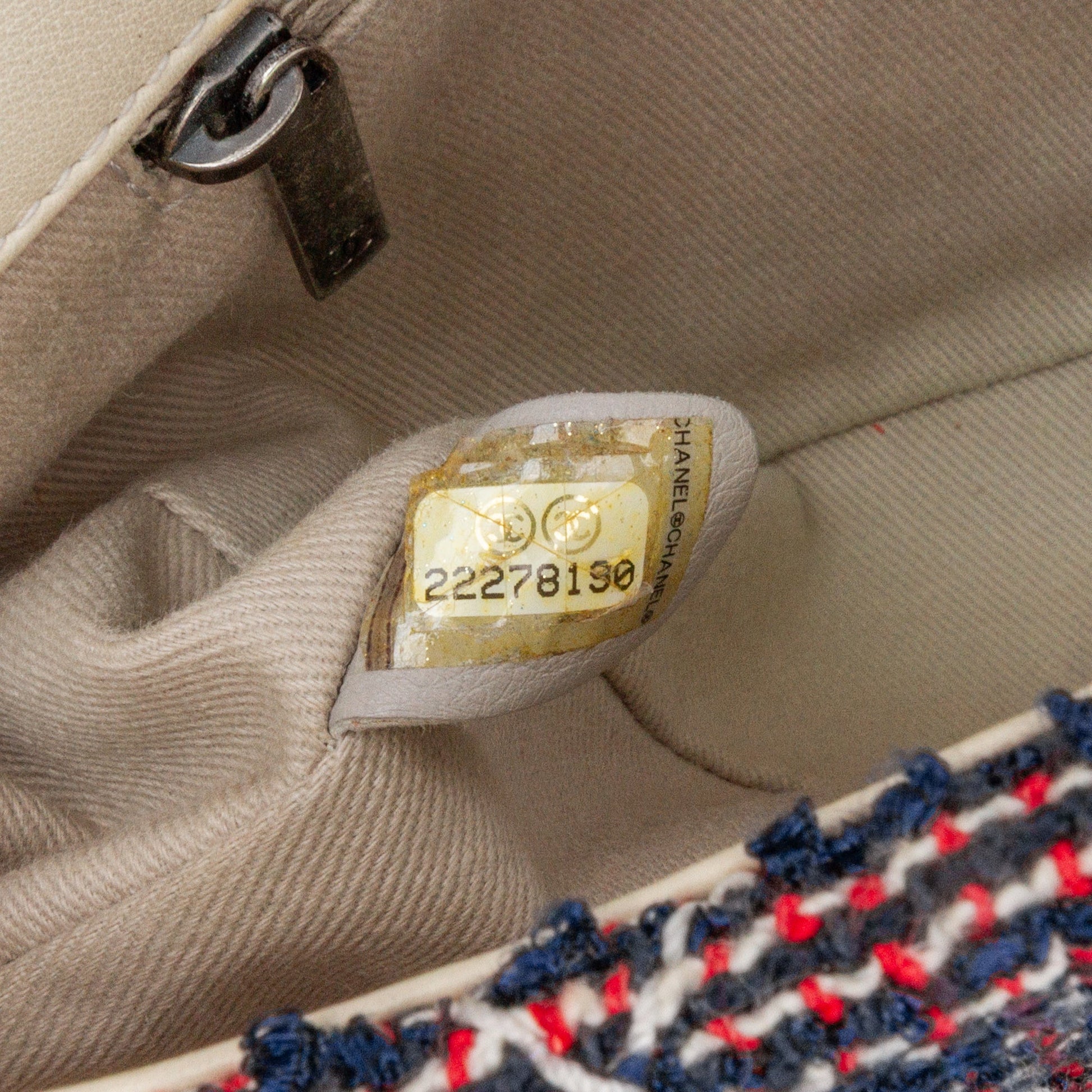 Product Details: Blue Chanel Medium Tweed Single Flap Crossbody Bag. This crossbody bag features a tweed body, a chain strap with a leather shoulder guard, a front flap with chain CC logo turn lock closure, and an interior zip pocket. 5.5" L x 10.2" W x 2.6" D, 12.2" drop. Serial number 22278190.