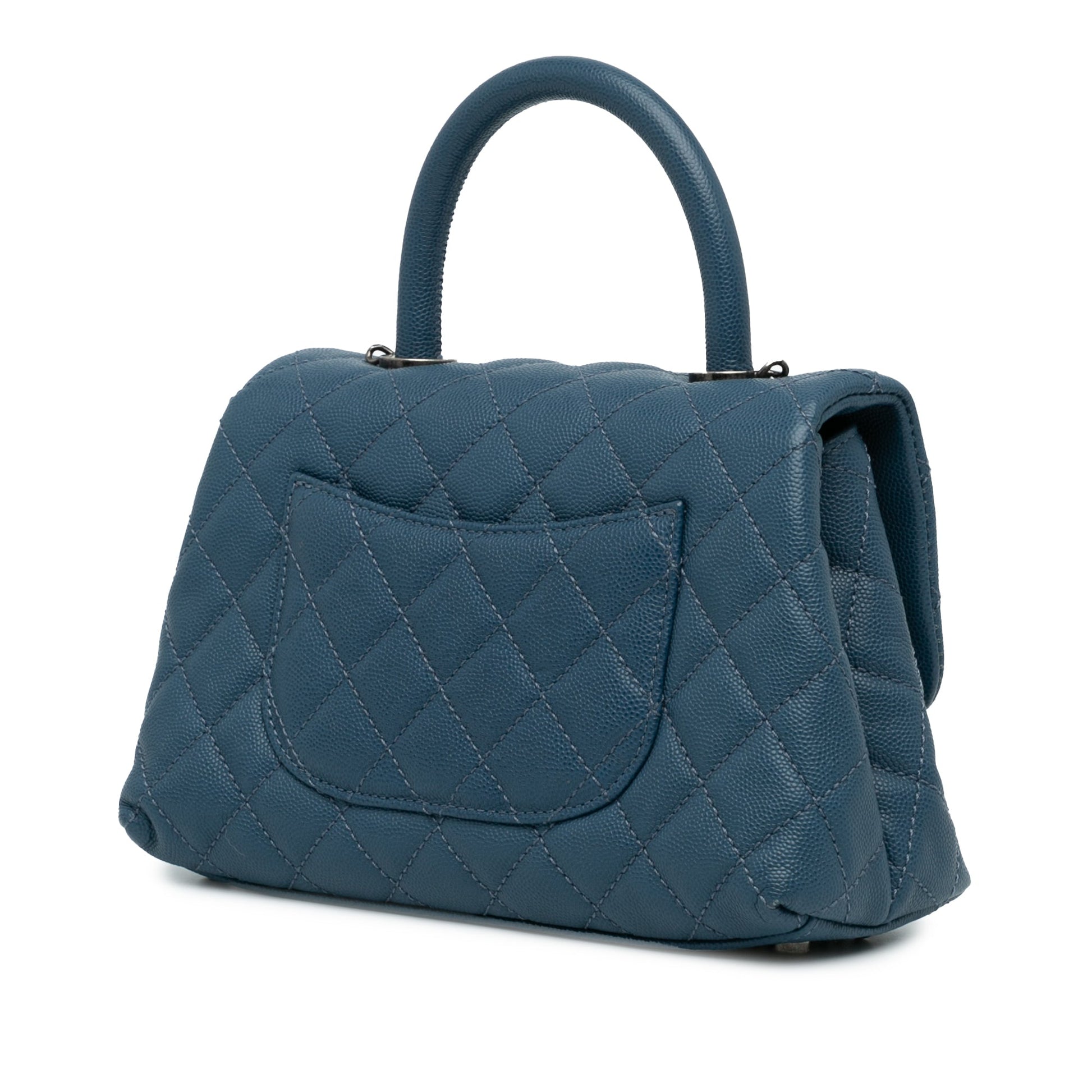 Product Details: Blue Chanel Mini Quilted Caviar Coco Top Handle Bag Satchel. This satchel features a quilted caviar leather body, a rolled top handle, a detachable leather woven chain strap with leather guard, a front flap with CC turn lock closure, an exterior back slip pocket, and interior zip and slip pockets. 5.5" L x 9.1" W x 3.1" D, 3.1" drop. Serial number 23444972.