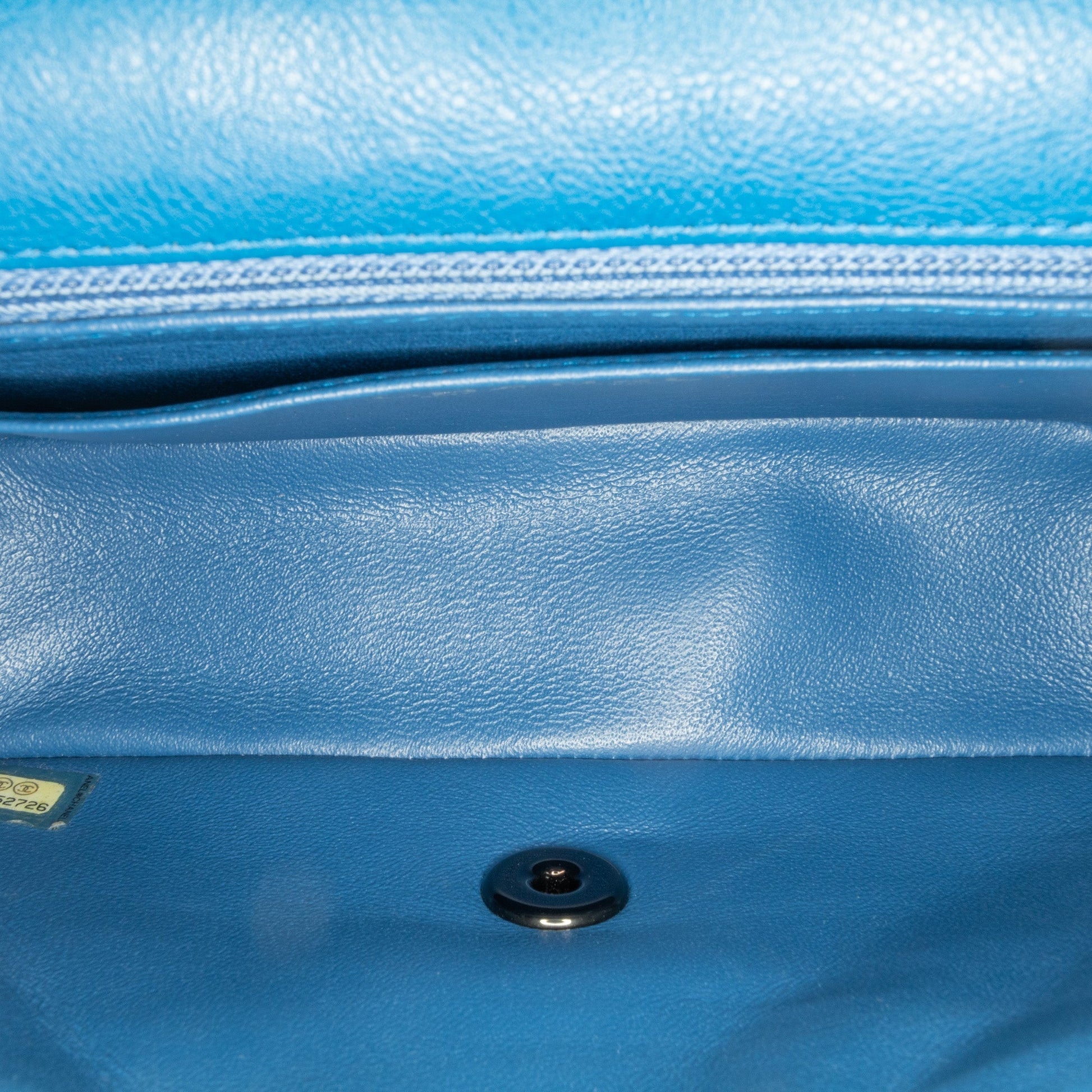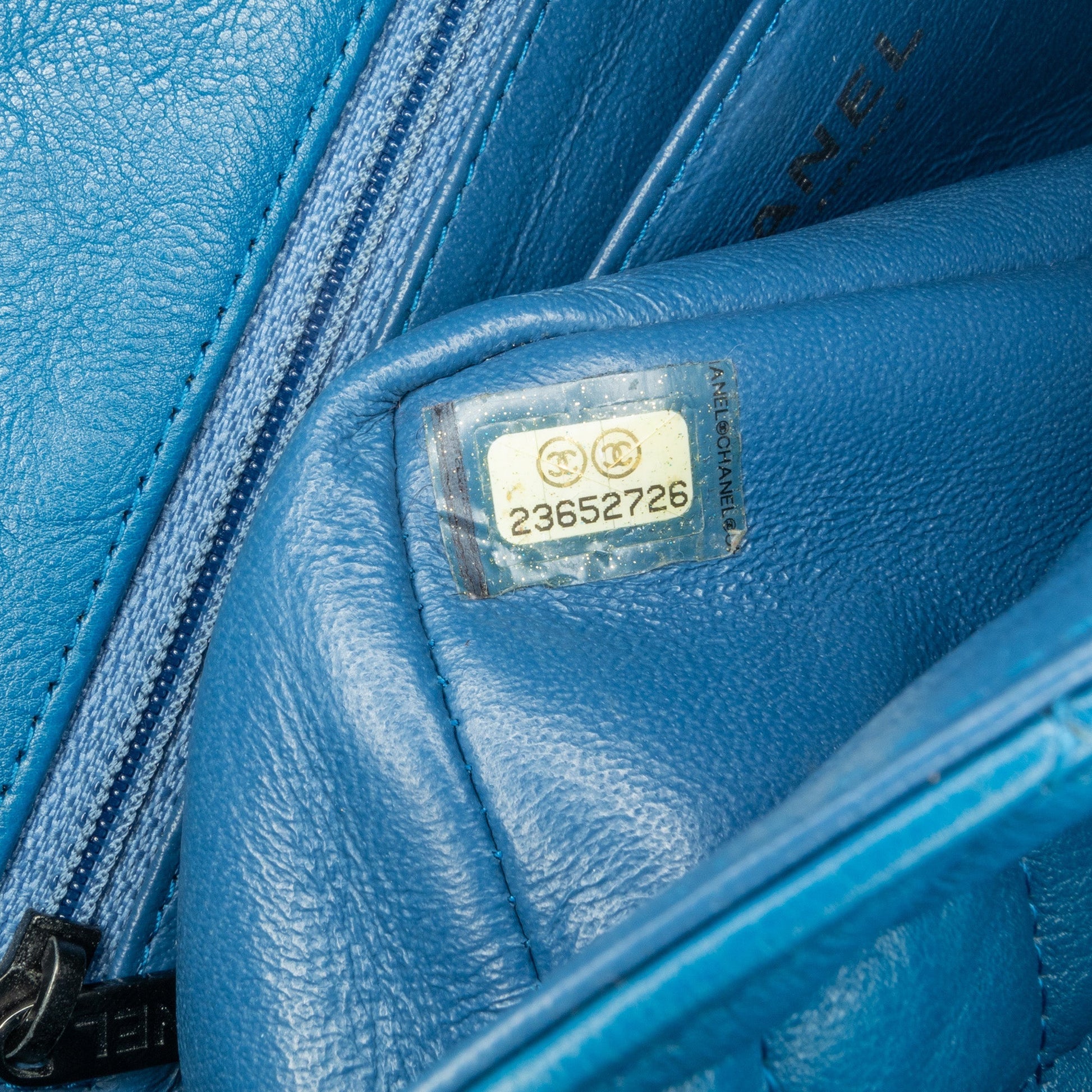 Product Details: Blue Chanel Mini Rectangular Classic Lambskin Single Flap Crossbody Bag. This crossbody bag features a quilted lambskin body, a leather woven chain shoulder strap, a front flap with a twist lock closure, an exterior back slip pocket, and interior zip and slip pockets. 5.1" L x 7.9" W x 2.4" D. Serial number 23652726.