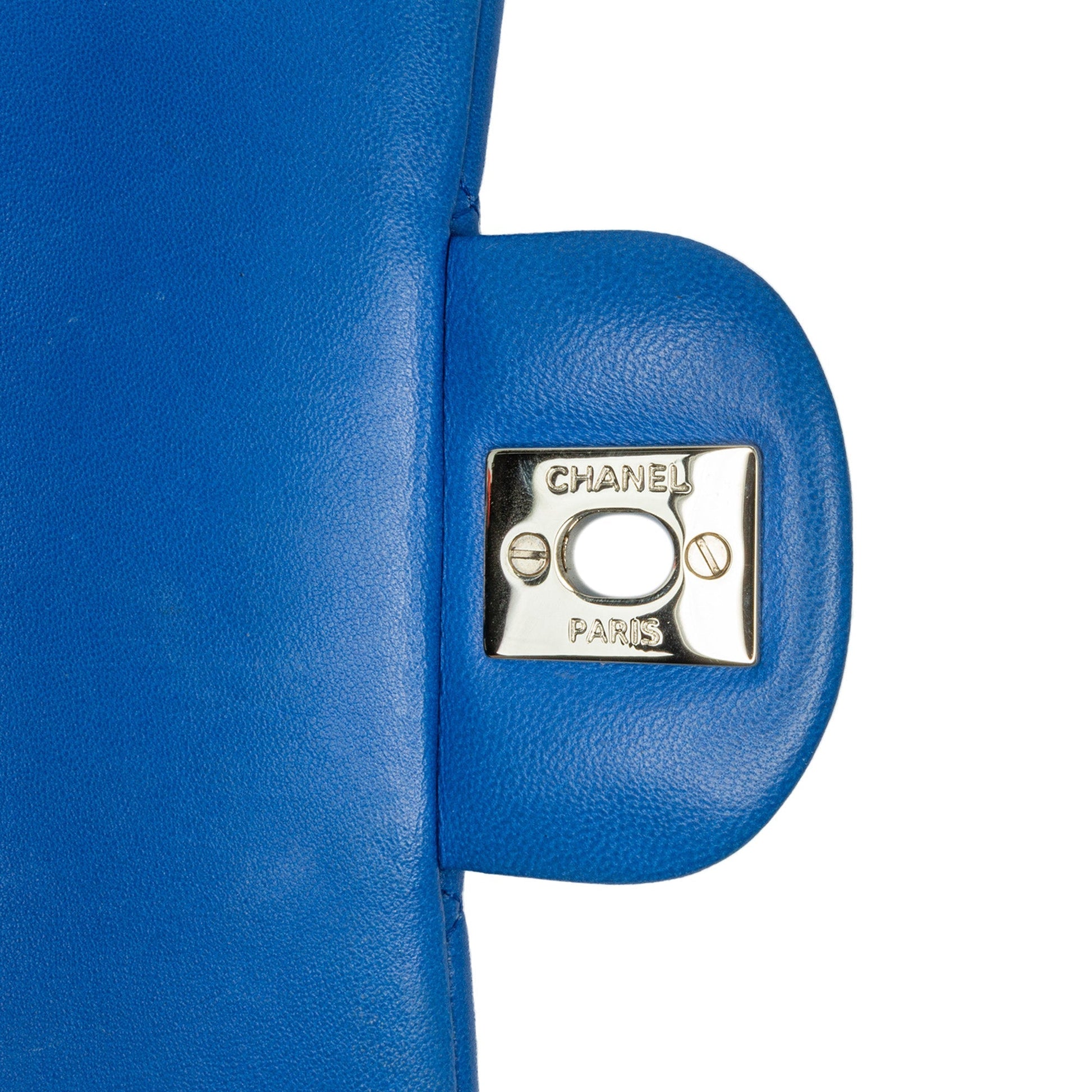 Product Details: Blue Chanel Mini Rectangular Classic Lambskin Single Flap Crossbody Bag. This crossbody bag features a quilted lambskin body, a leather woven chain shoulder strap, a front flap with a twist lock closure, an exterior back slip pocket, and interior zip and slip pockets. 4.7" L x 7.9" W x 2.6" D. Serial number 21863633.