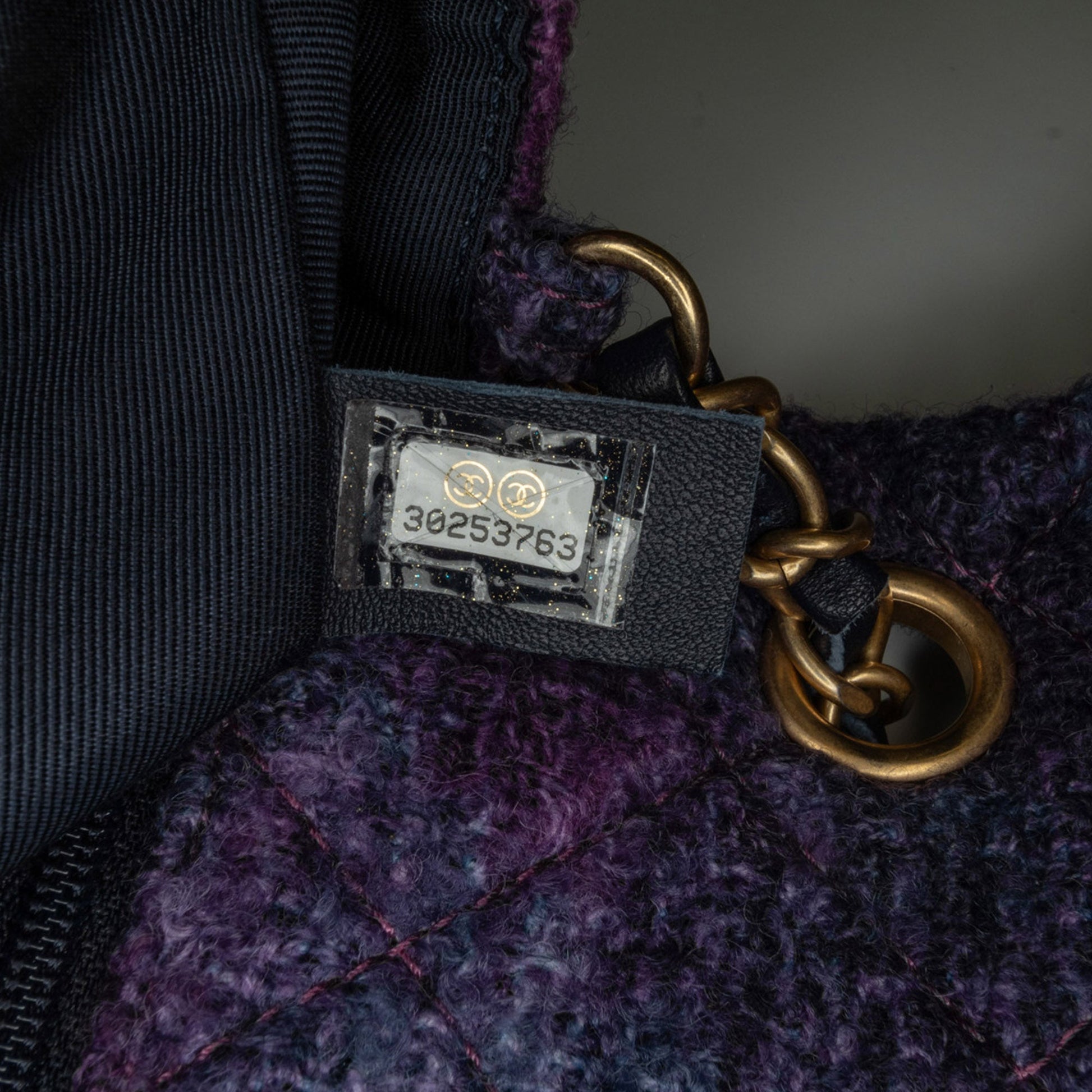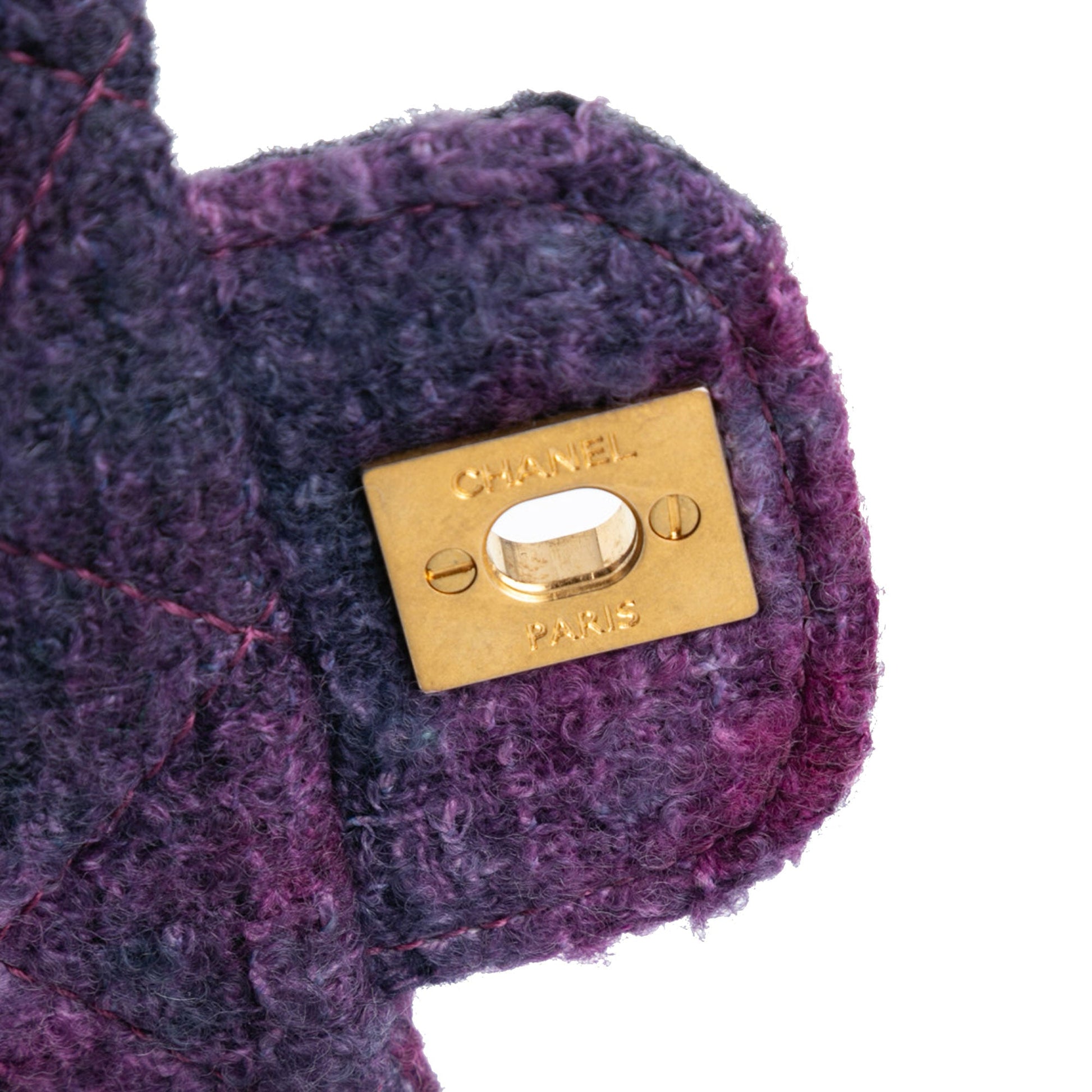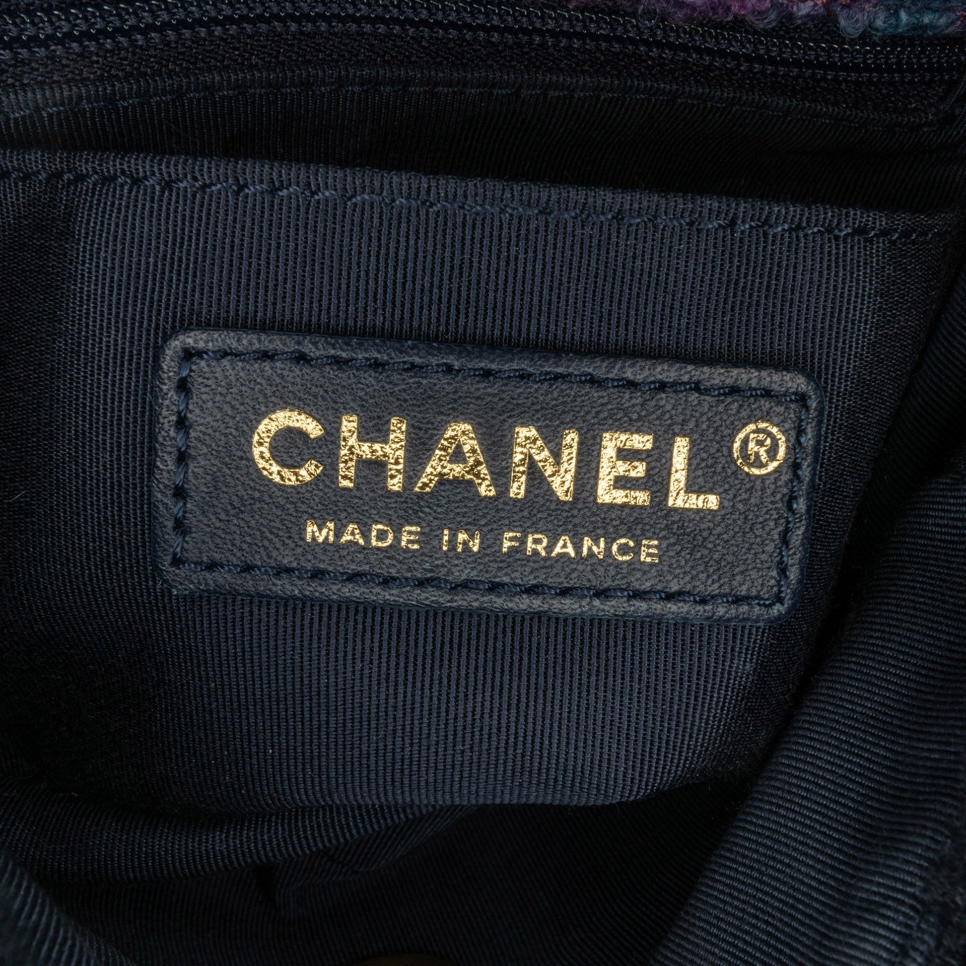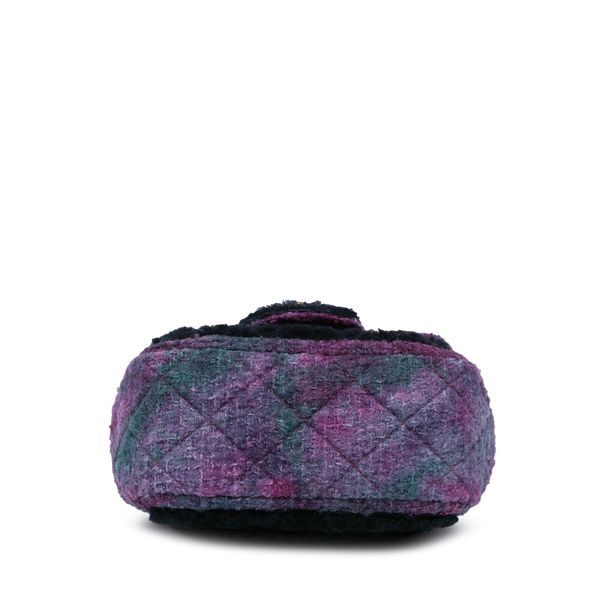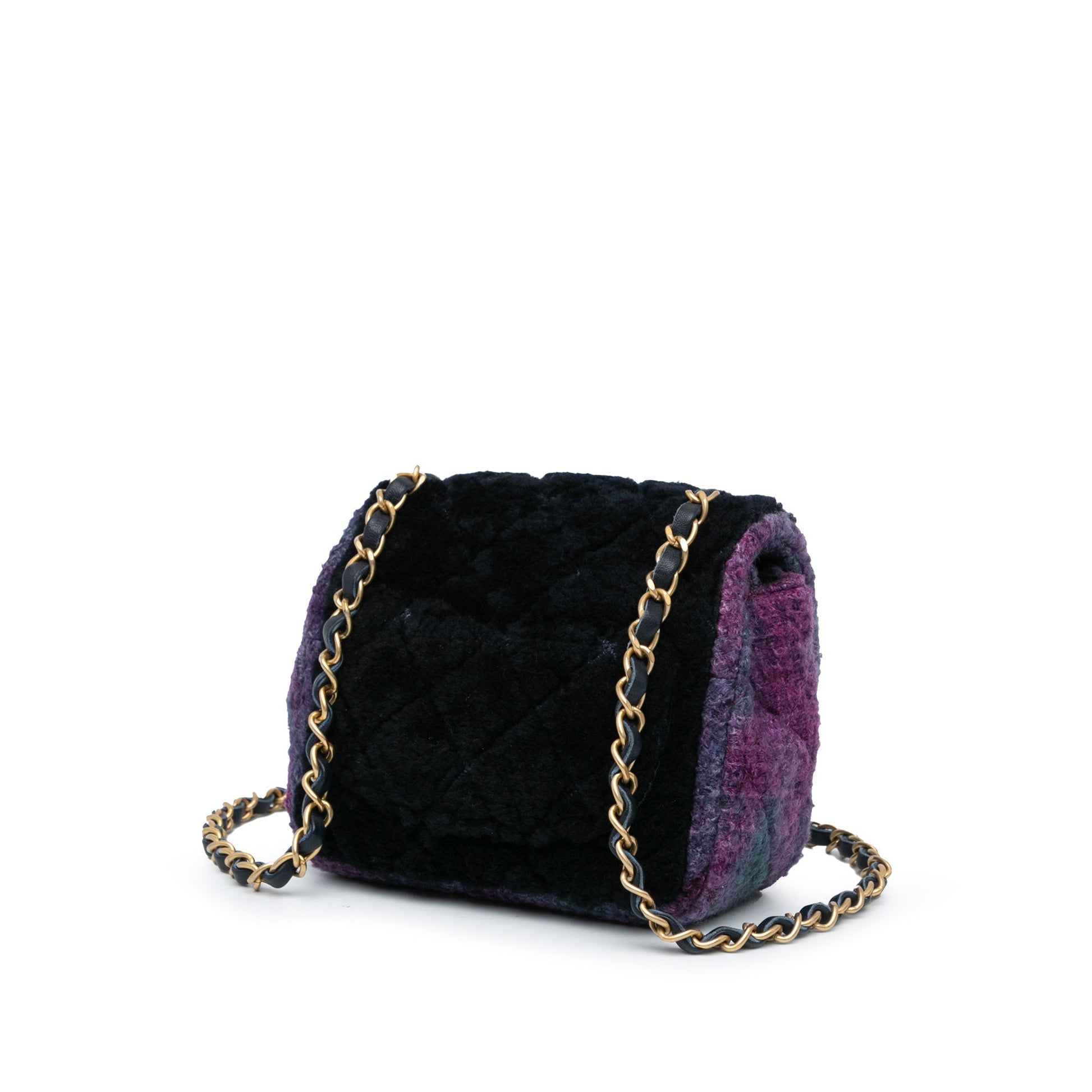 Product Details: Blue Chanel Mini Square Classic Multicolor Shearling Single Flap Crossbody Bag. This flap bag features a shearling body with tweed trim, a leather woven chain shoulder strap, a front flap with turn lock closure, and interior zip and slip pockets. 5.1" L x 6.3" W x 2.8" D. Serial number 30253763.