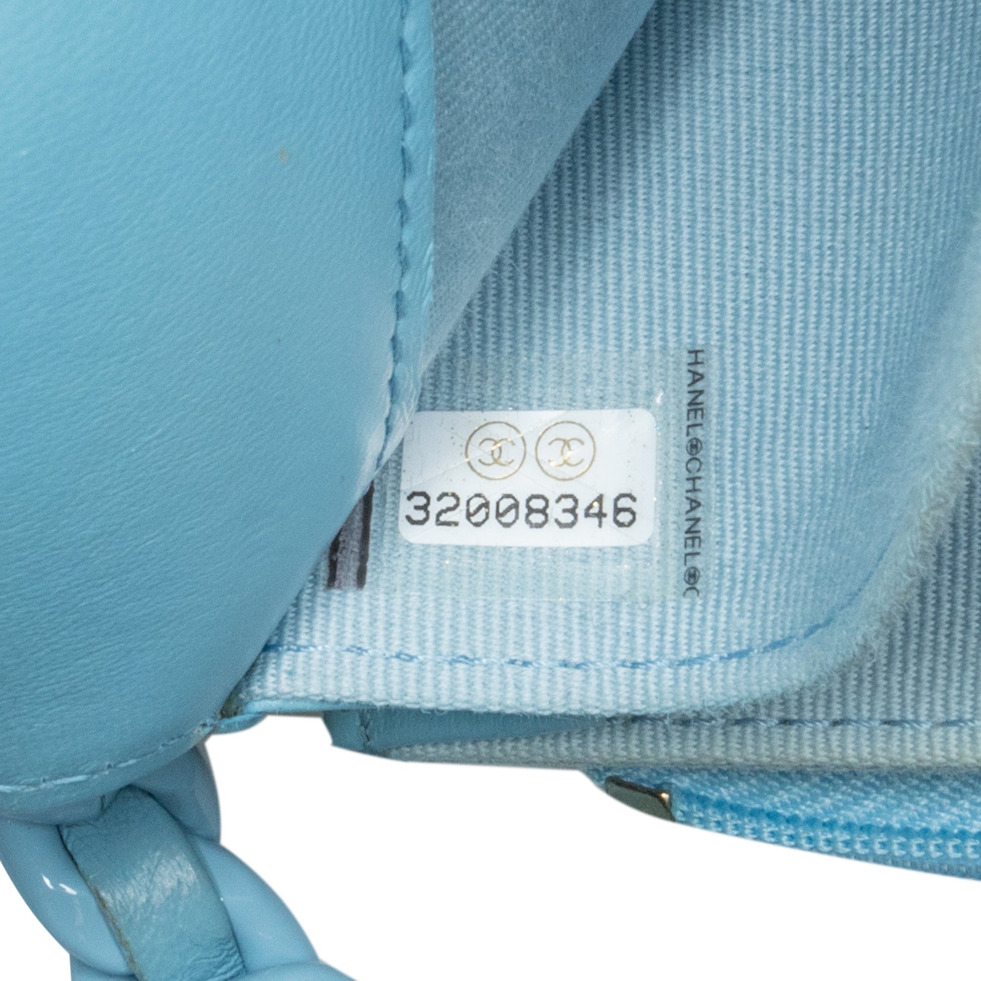 Product Details: Blue Chanel Quilted Lambskin Candy Chain Wallet Crossbody Bag. This wallet on chain features a quilted lambskin leather body, a leather-woven lacquered chain strap, a flap with magnetic snap closure, an exterior back zip pocket, an interior zip compartment, and interior slip pockets. The bag has been refinished. 4.3" L x 5.9" W x 1.6" D. Serial number 32008346.
