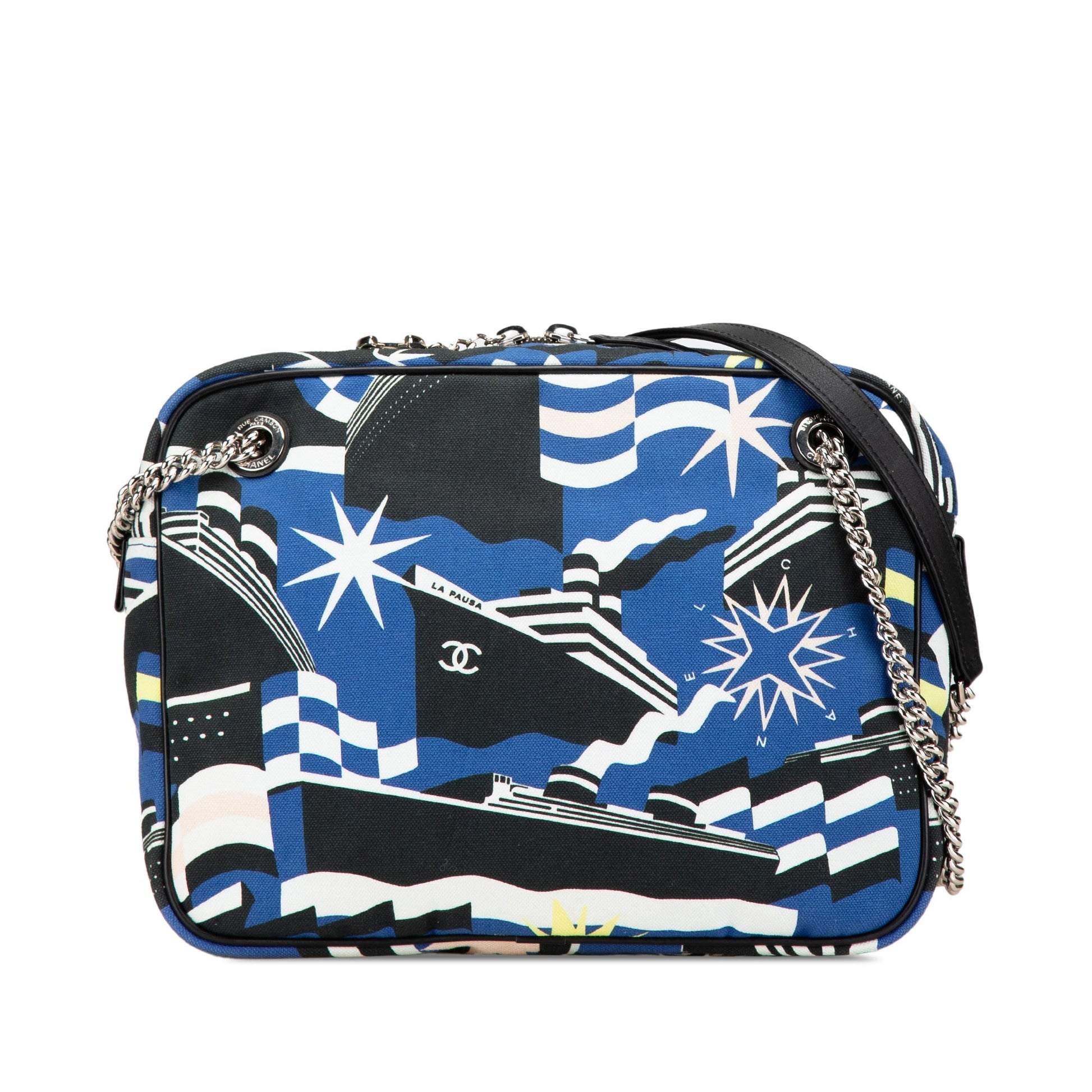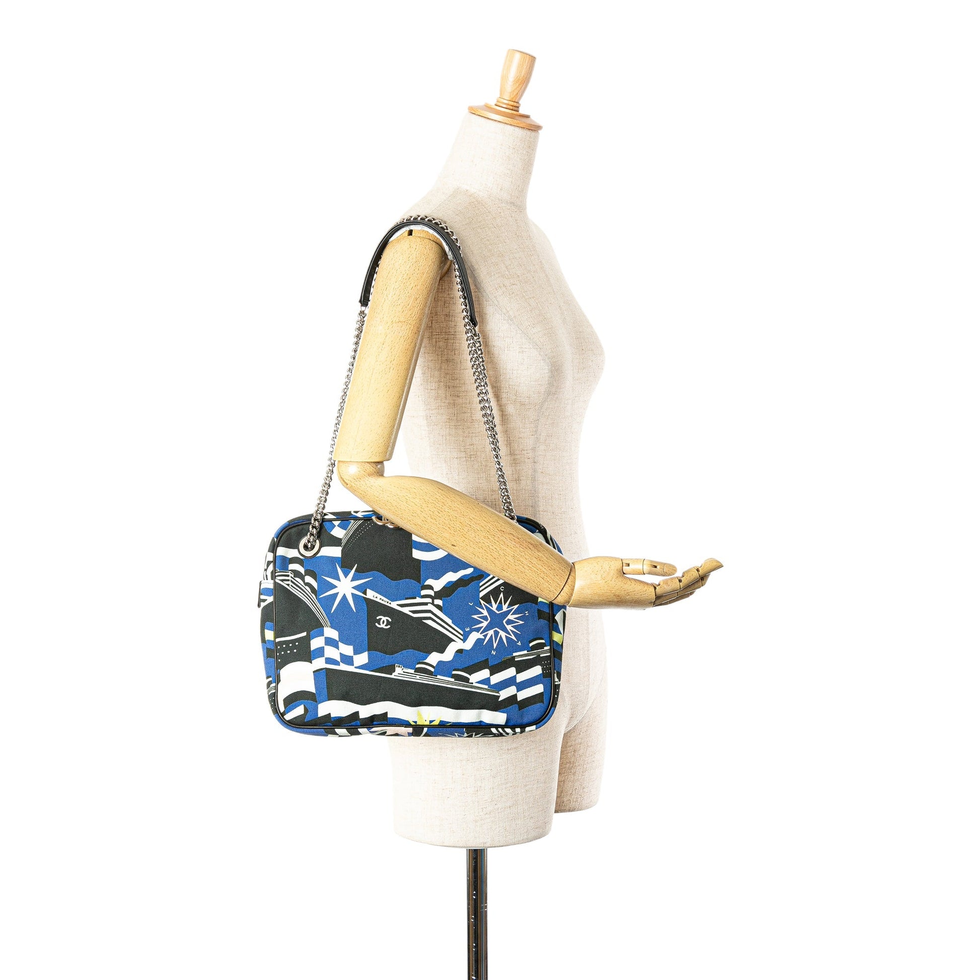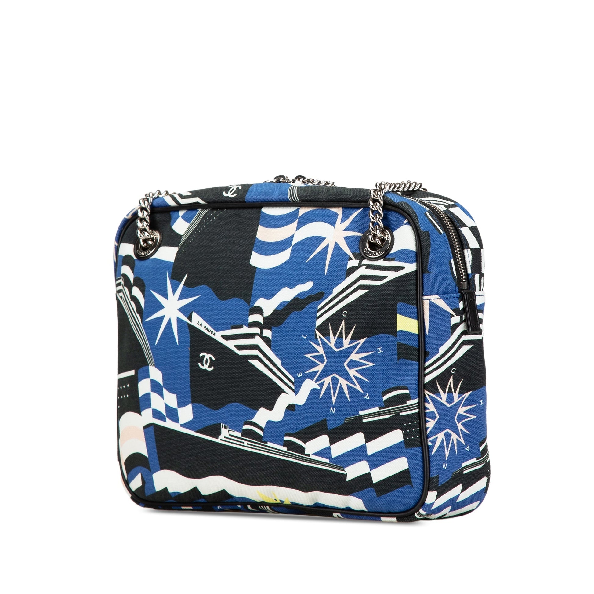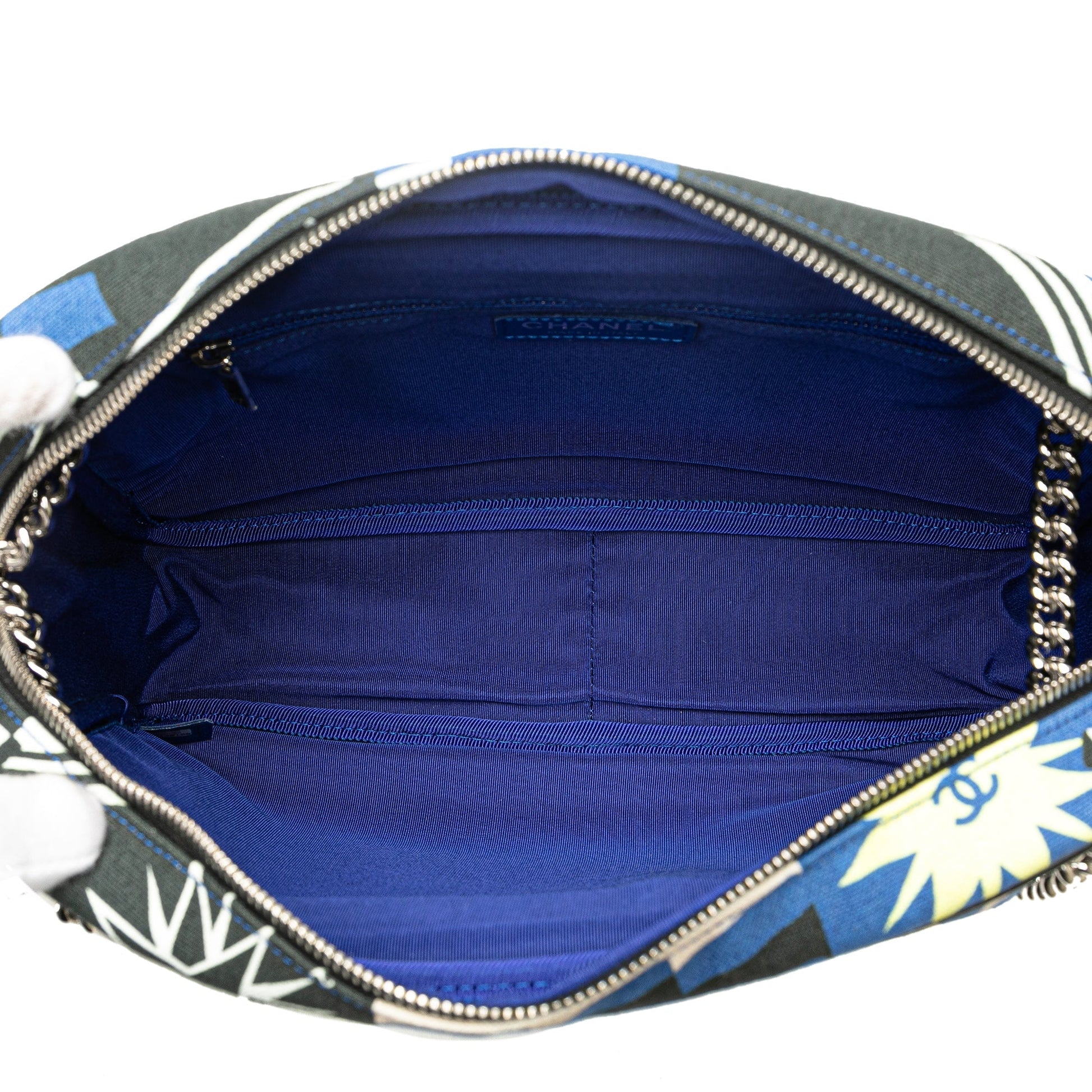 Product Details: Blue Chanel Small Canvas La Pausa Bay Camera Bag. This shoulder bag features a printed canvas body, a chain link strap with leather guard, a top zip closure, and an interior zip pocket. 8.7" L x 11" W x 2.8" D, 11.8" drop. Serial number 27140199.