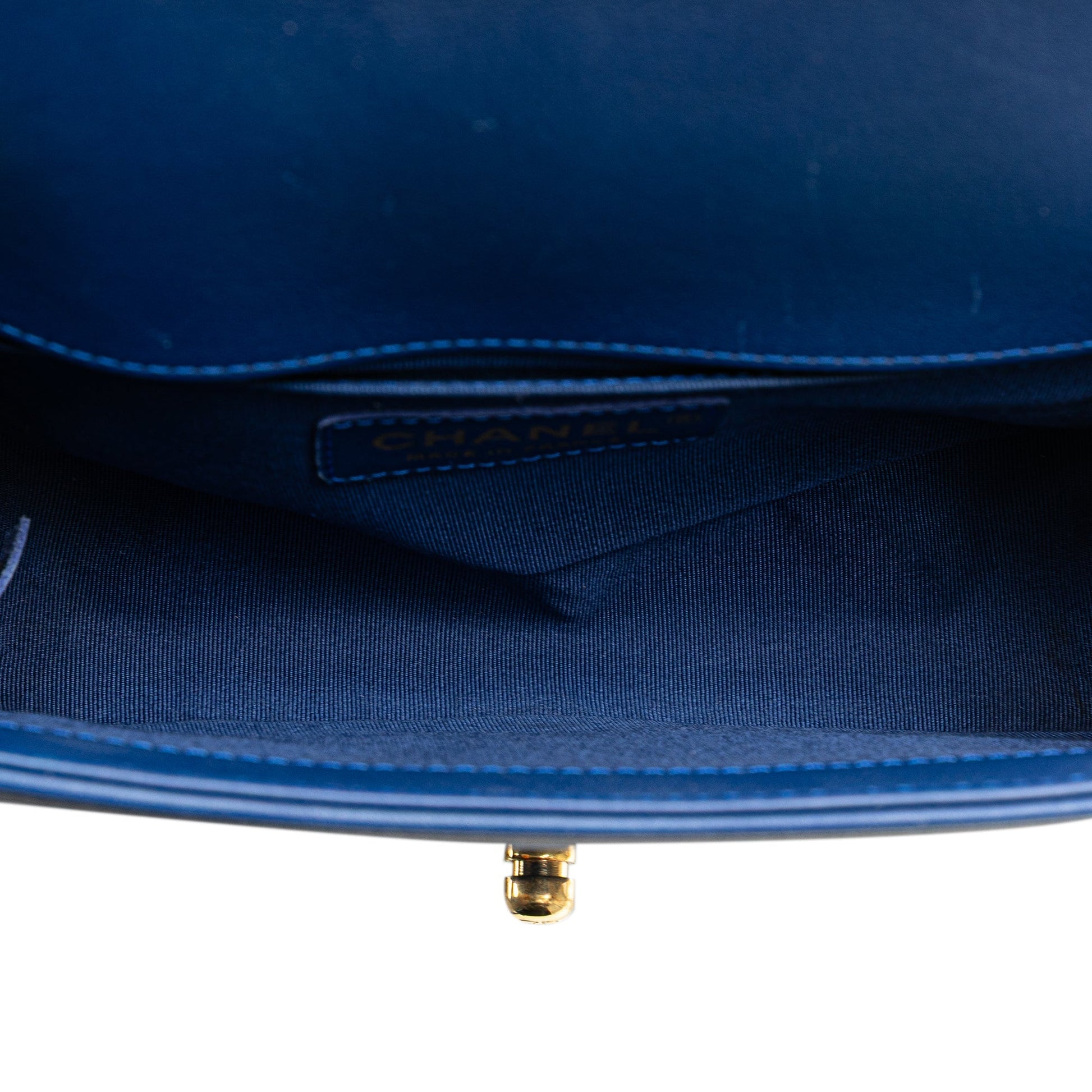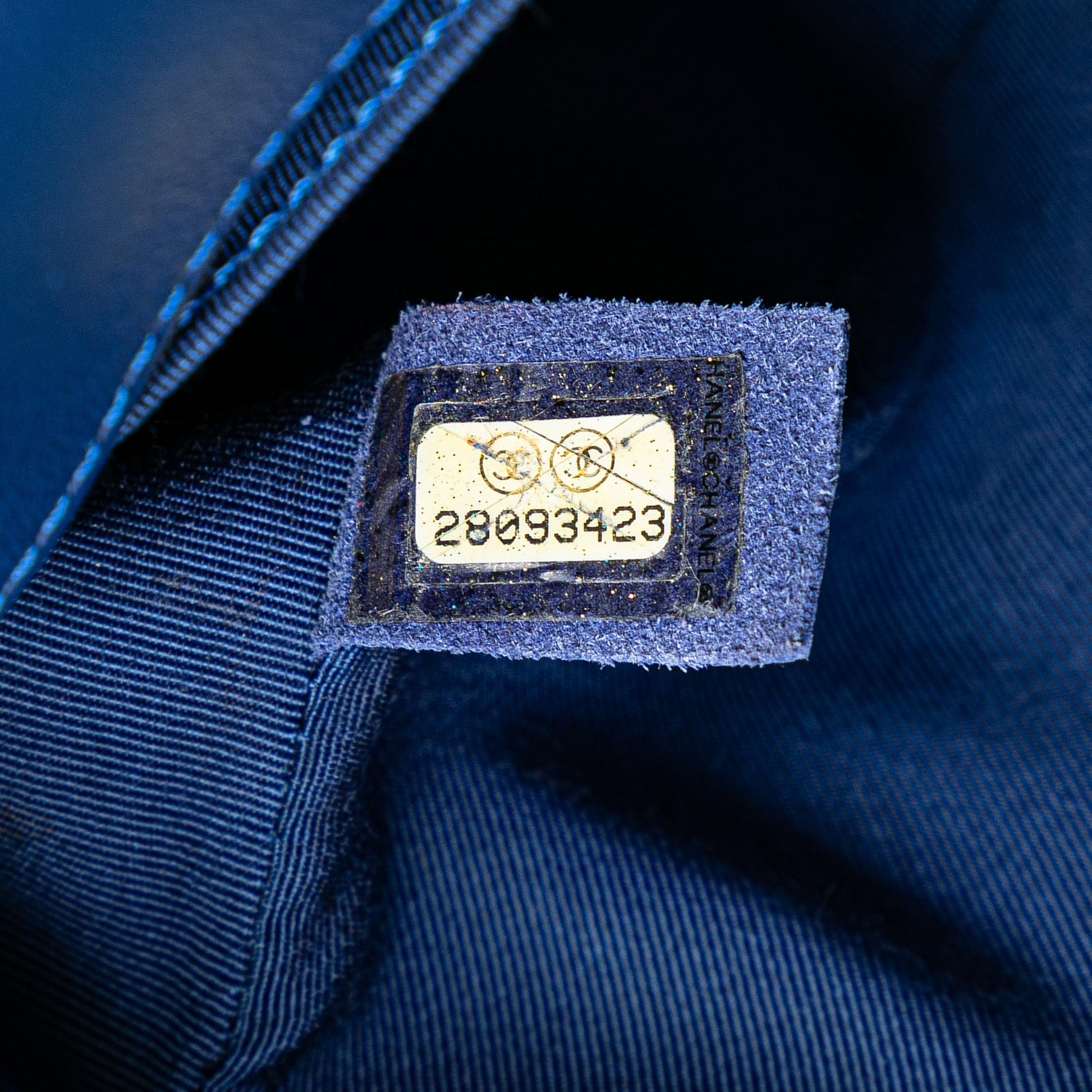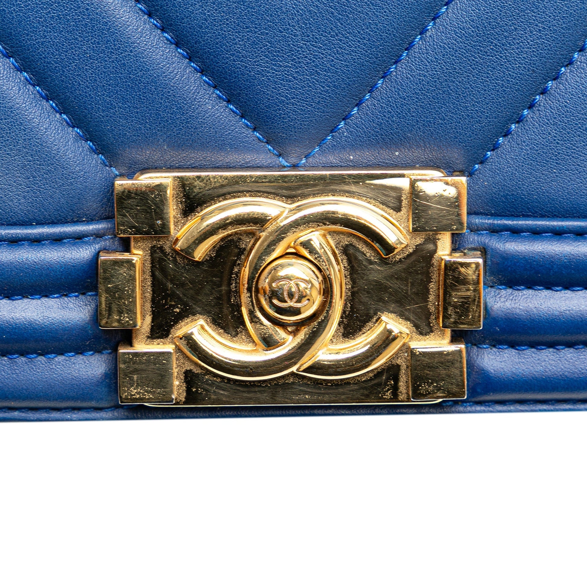Product Details: Blue Chanel Small Chevron Lambskin Boy Flap Shoulder Bag. The Boy flap bag features a quilted lambskin leather body, a curb chain and flat leather shoulder strap, a front flap with push-lock closure, and an interior slip pocket. 4.9" L x 7.9" W x 2.4" D. Serial number 28093423.