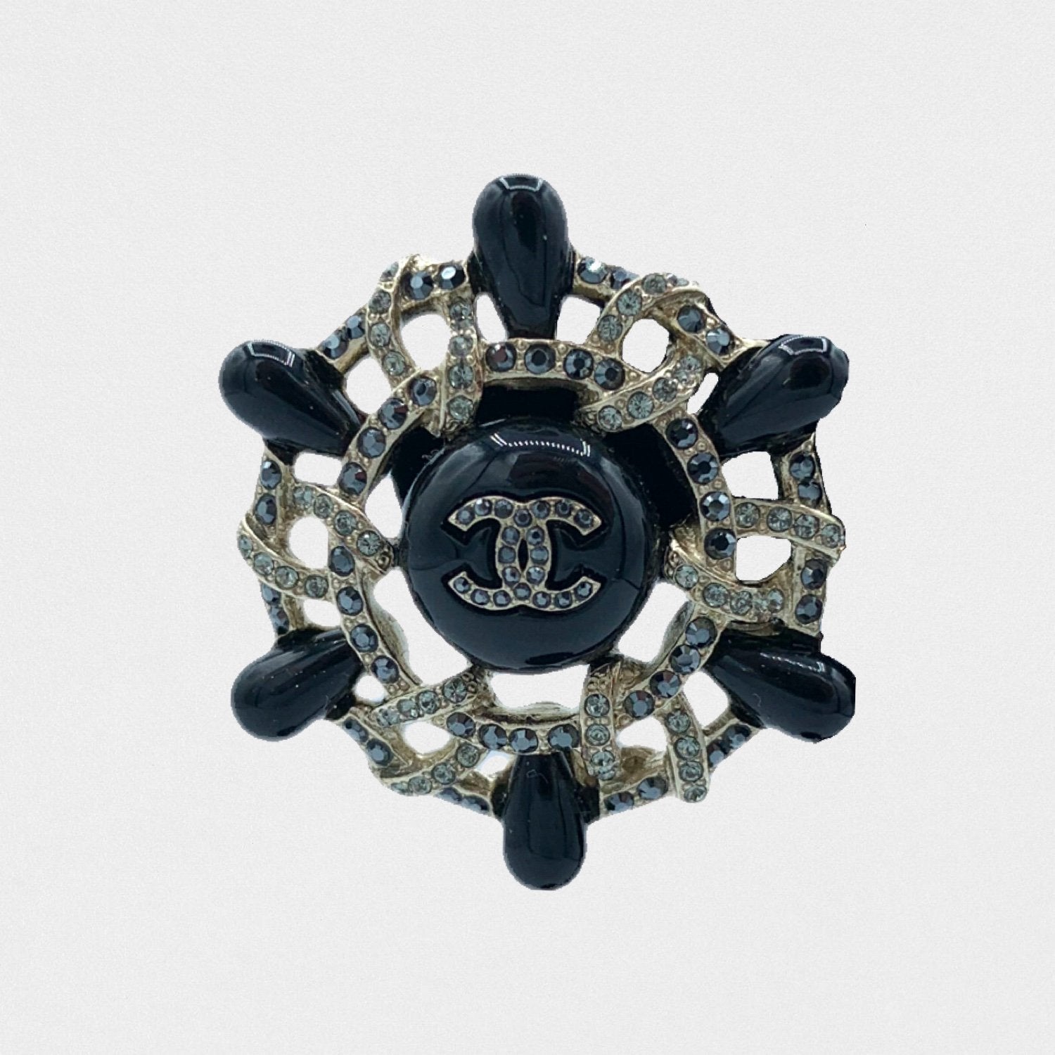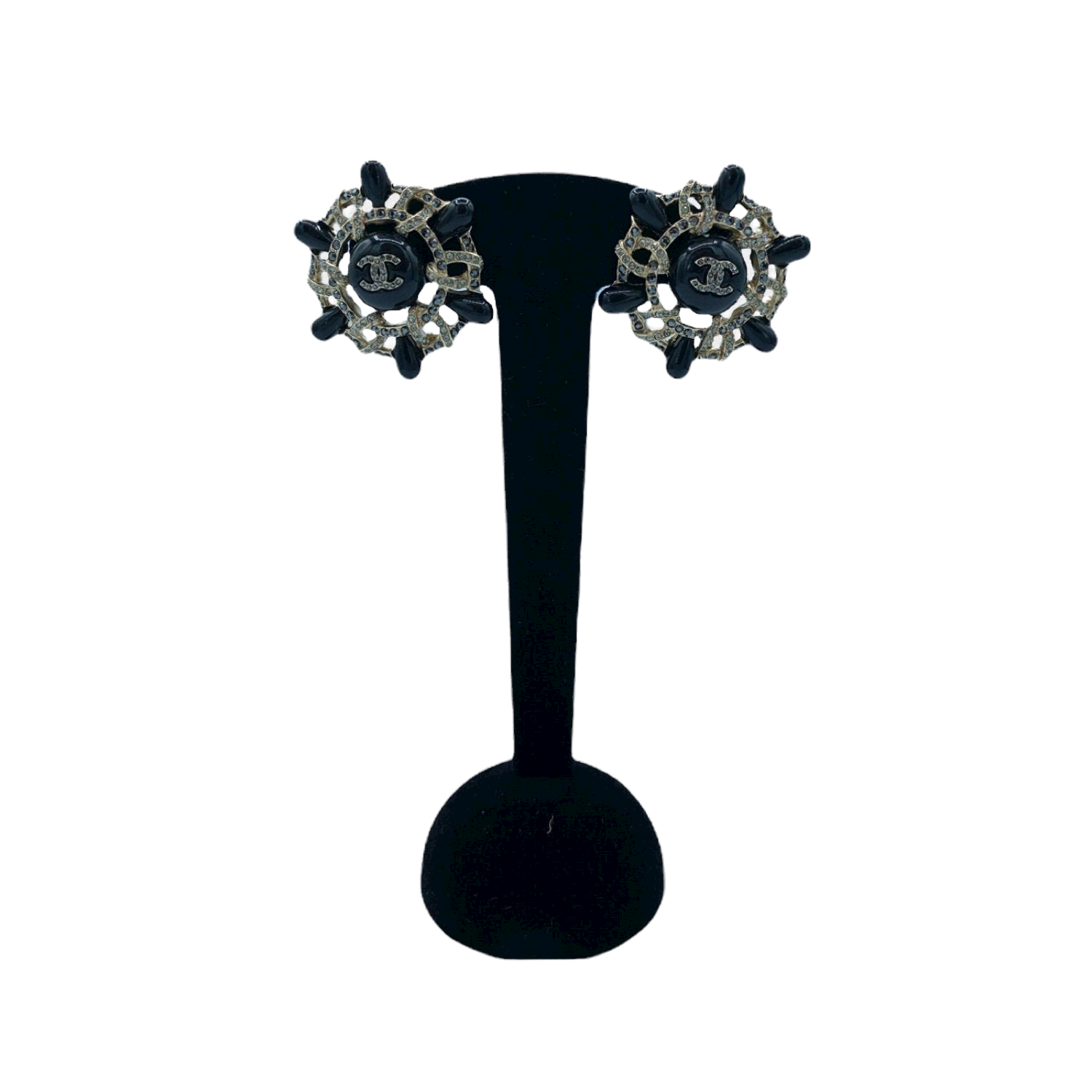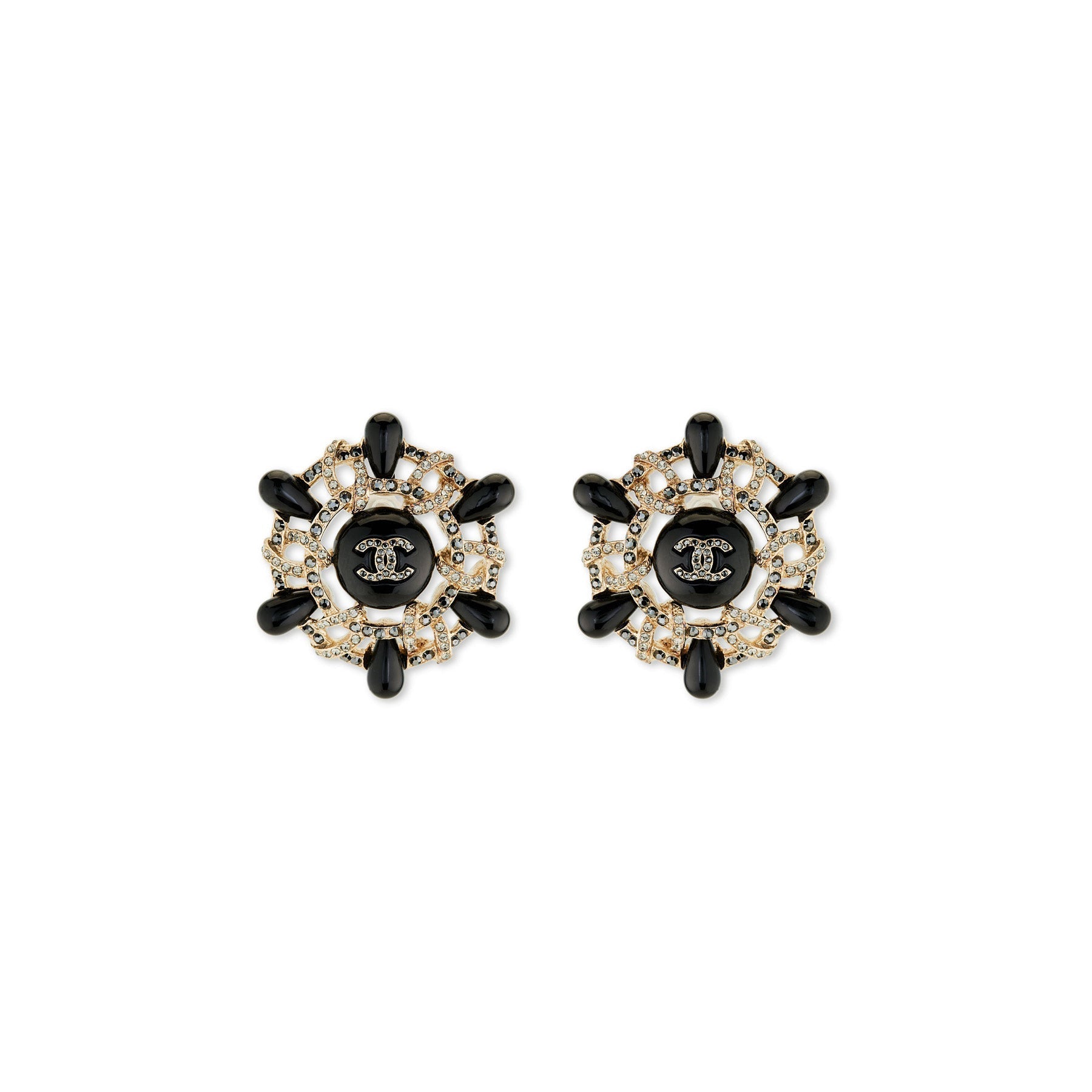DESCRIPTION: Chanel earrings from Mtiers d'art Hambourg 2017 /2018. Round metal earrings embellished with resin cabochons, rhinestones and the CC logo.