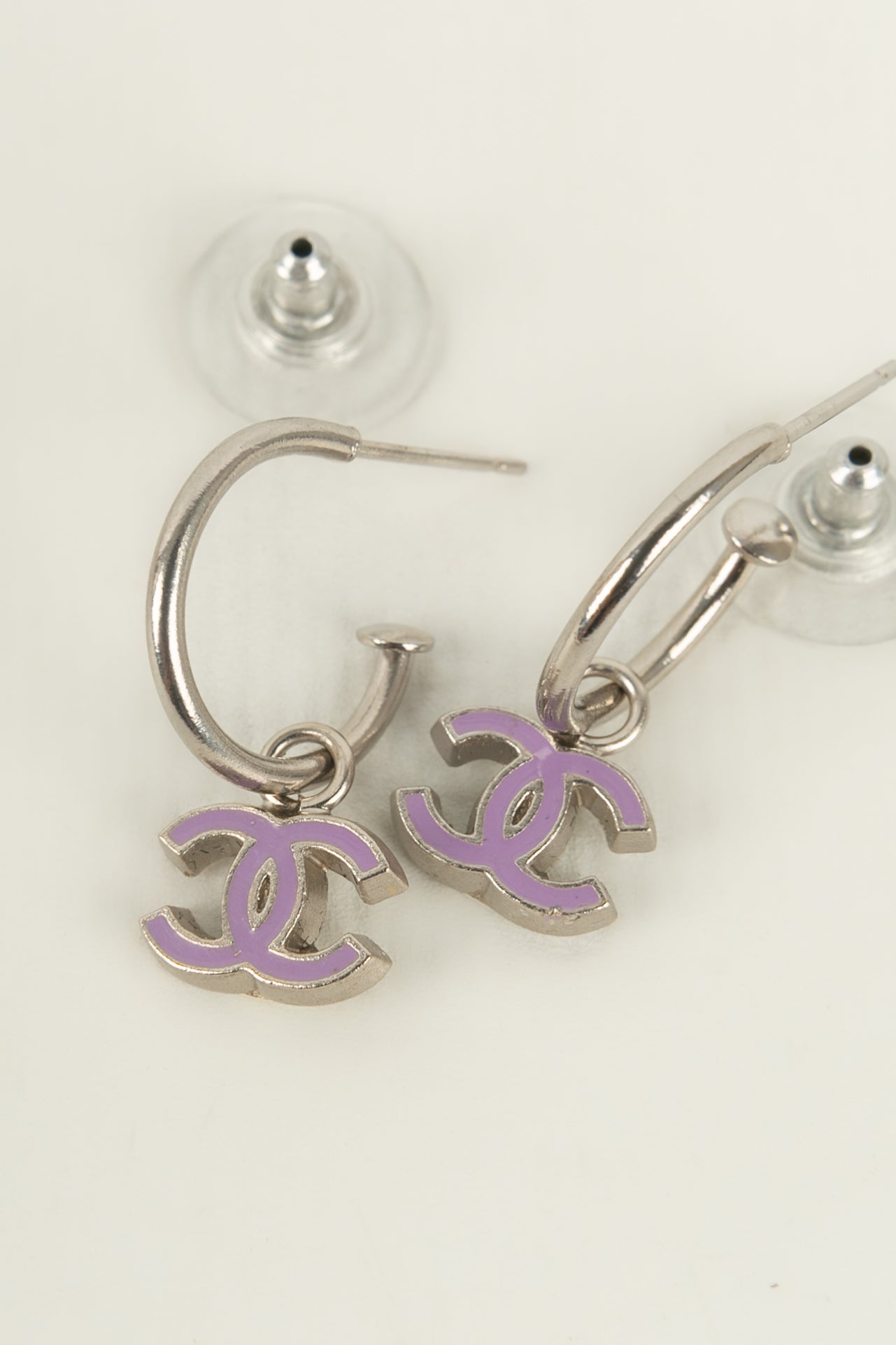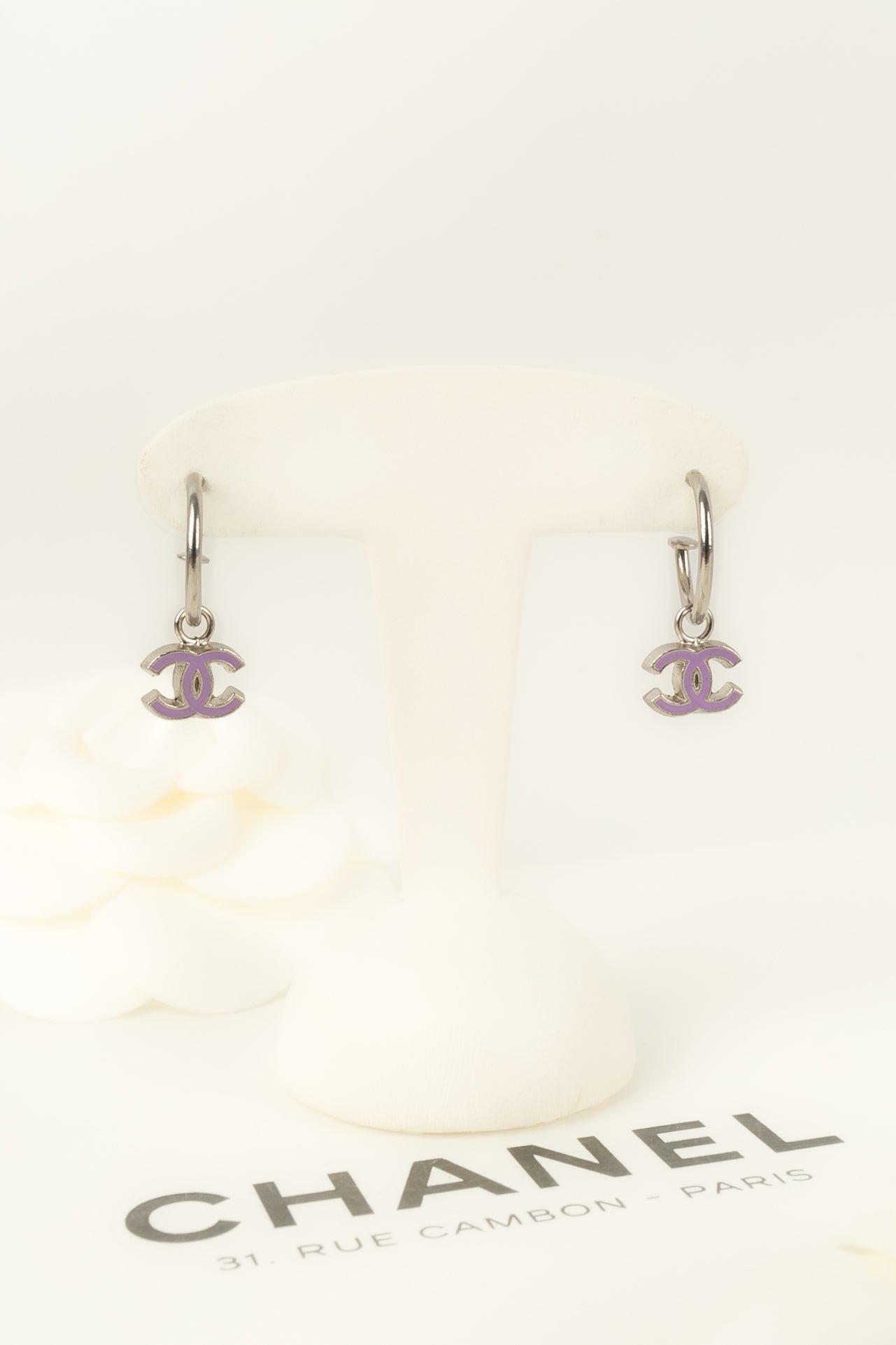 CHANEL - (Made in France) Boucles d'oreilles en mtal argent et breloque cc maille de violet. Collection Automne-Hiver 2004.