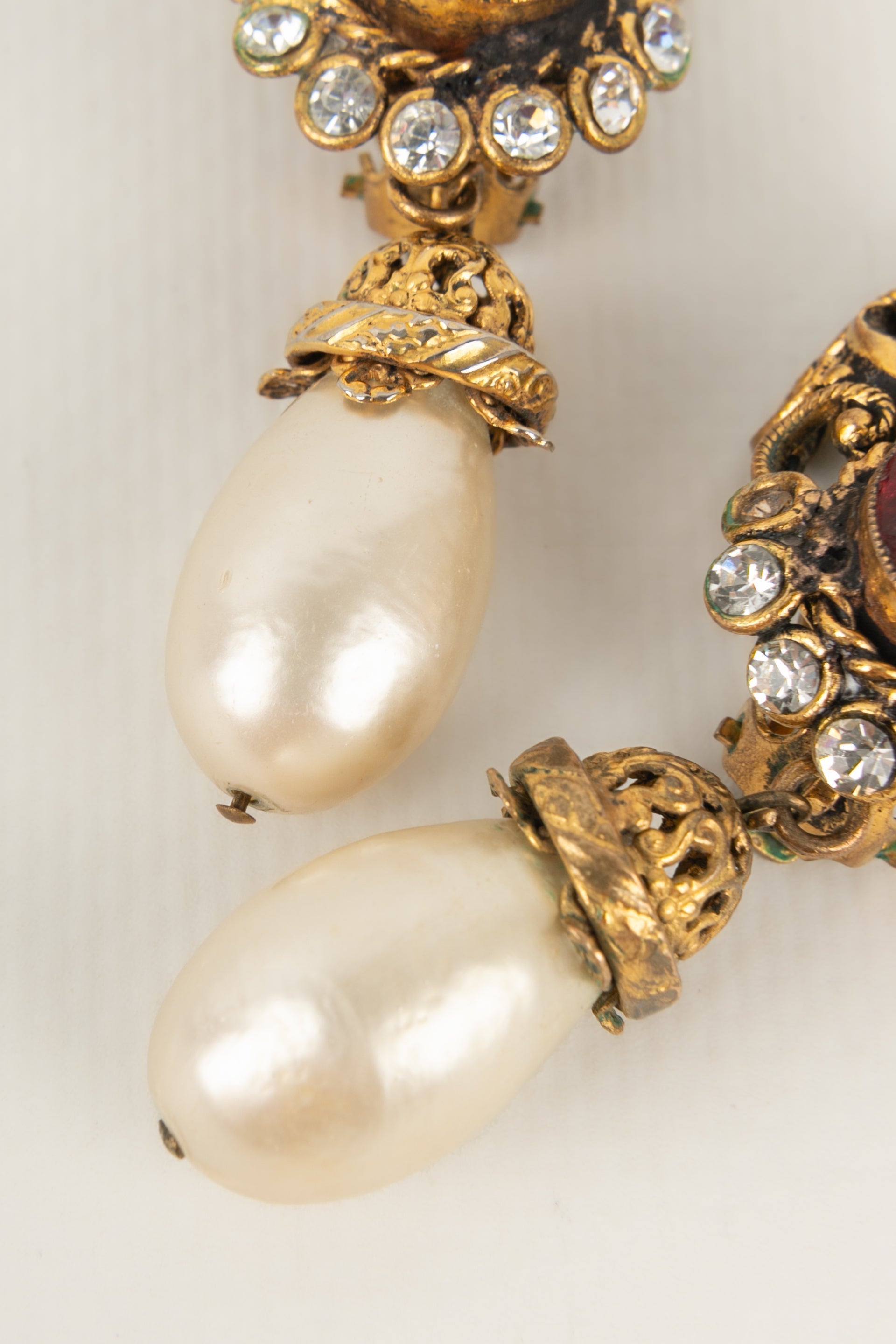 CHANEL - Boucles d'oreilles en mtal dor, strass et pte de verre. Collection 1983.