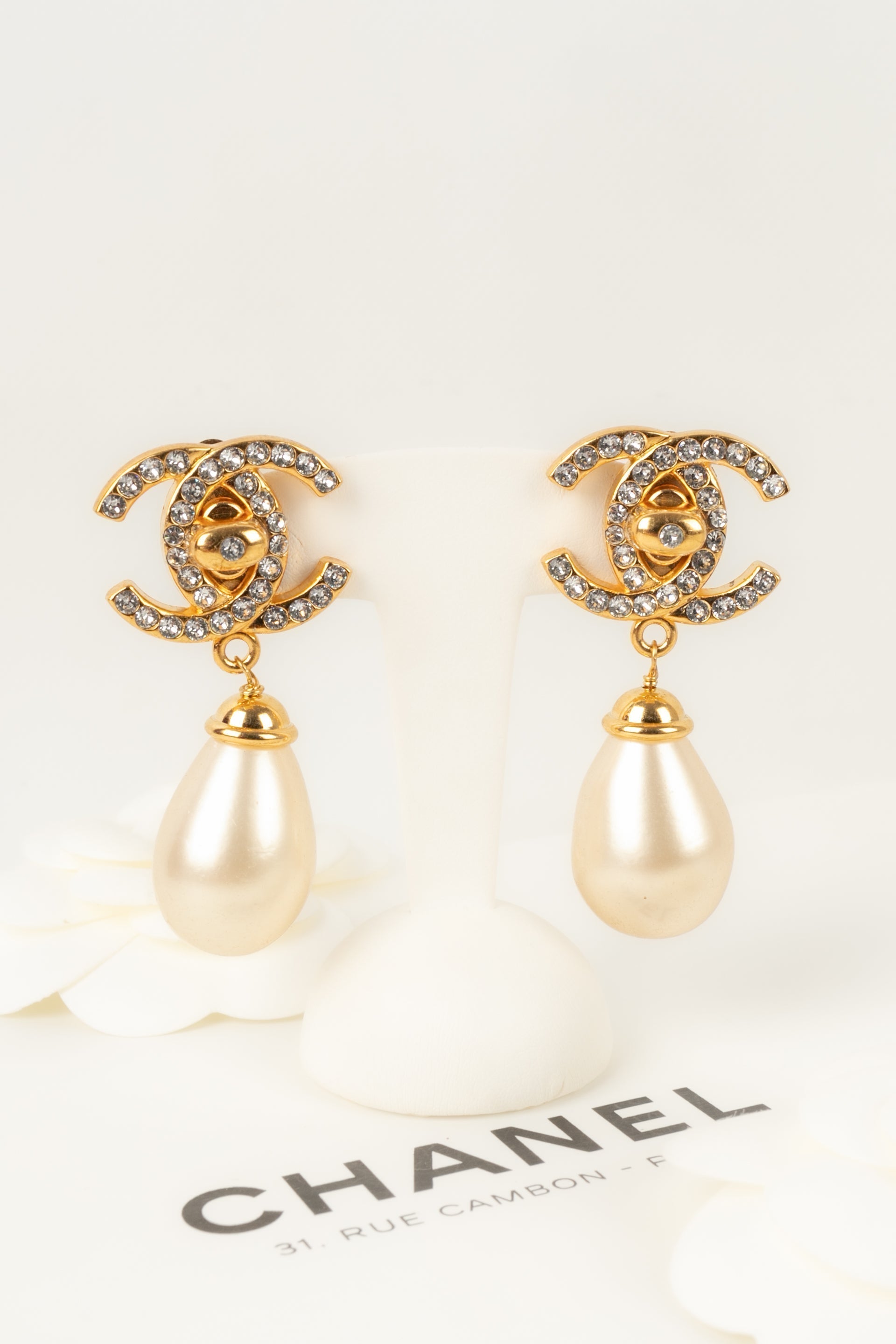 CHANEL - (Made in France) Boucles d'oreilles cc turnlock en mtal dor pav de strass retenant une goutte de nacre. Collection Automne/Hiver 1996.
