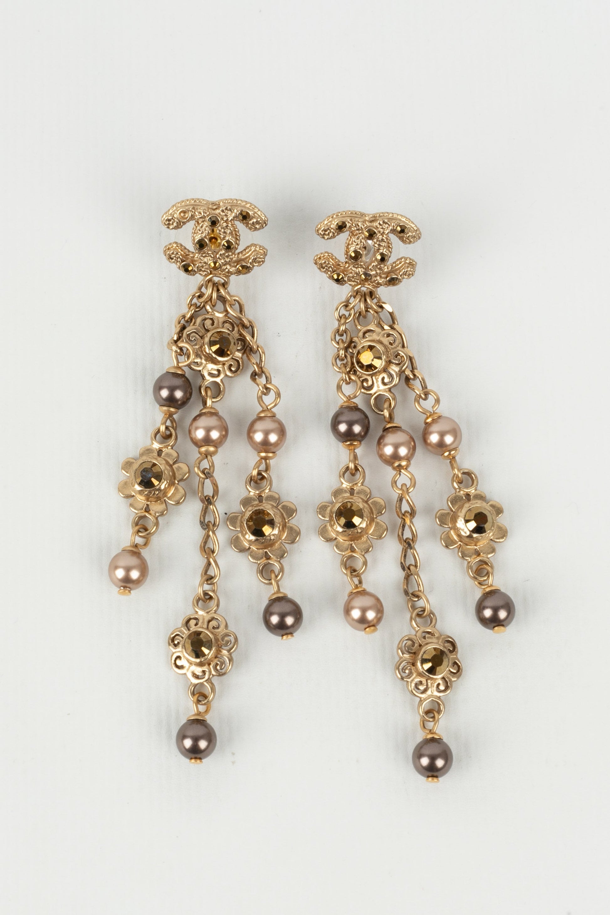 CHANEL - (Made in Italy) Boucles d'oreilles en mtal dor, perles et strass. Collection Automne-Hiver 2006.