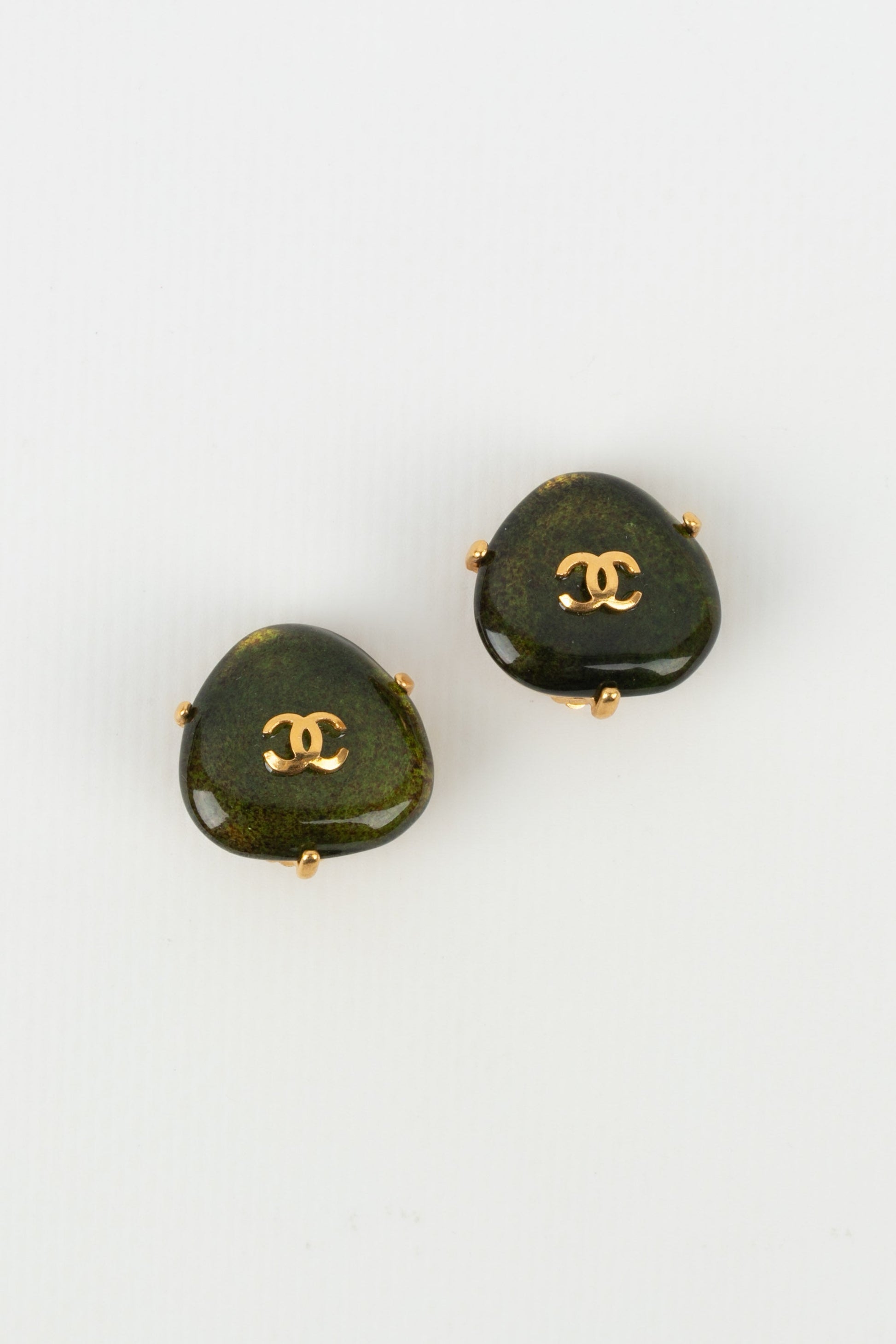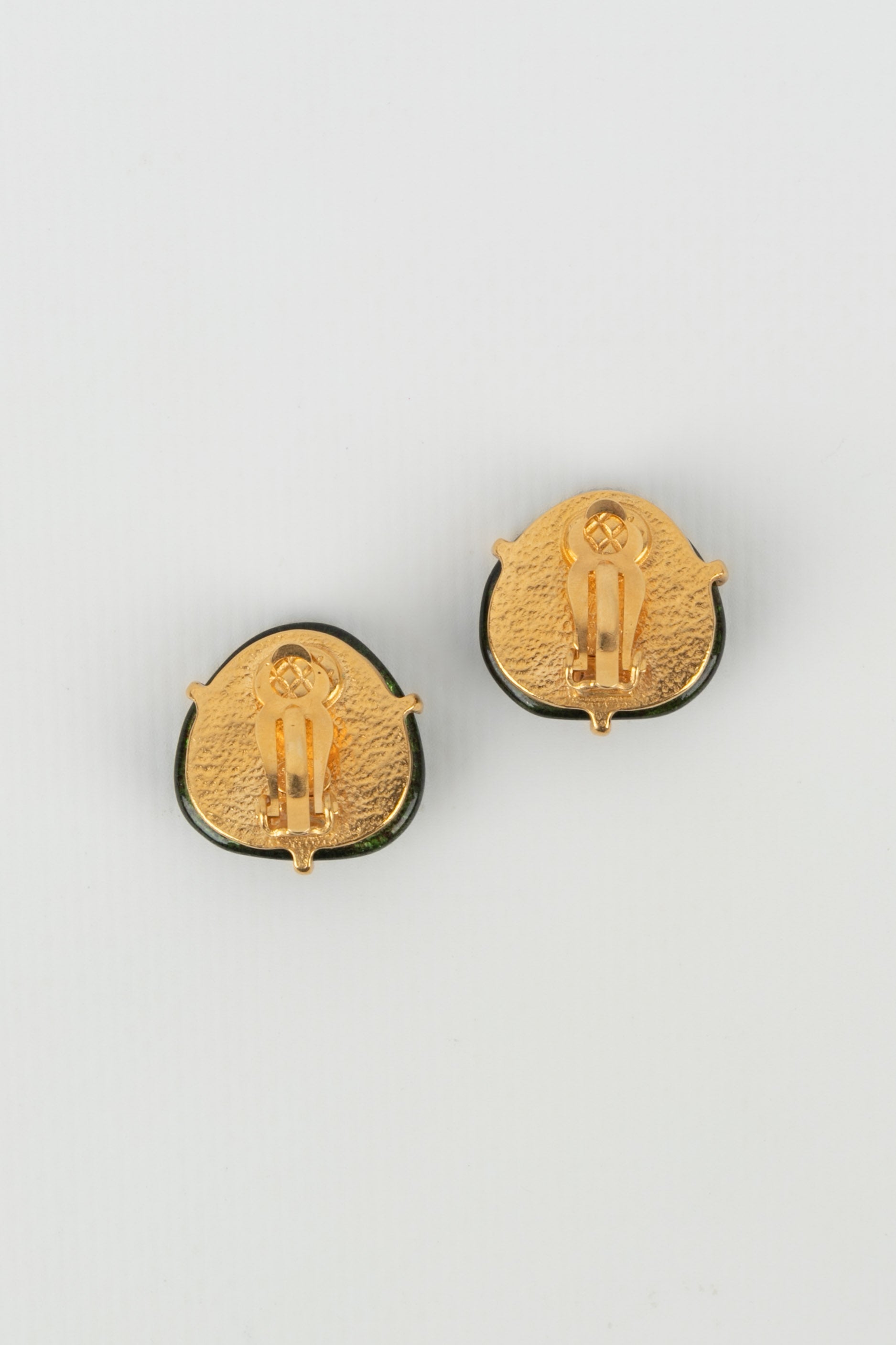 CHANEL - (Made in France) Boucles d'oreilles en mtal dor et pte de verre verte. Collection Prt--Porter Automne-Hiver 1997.