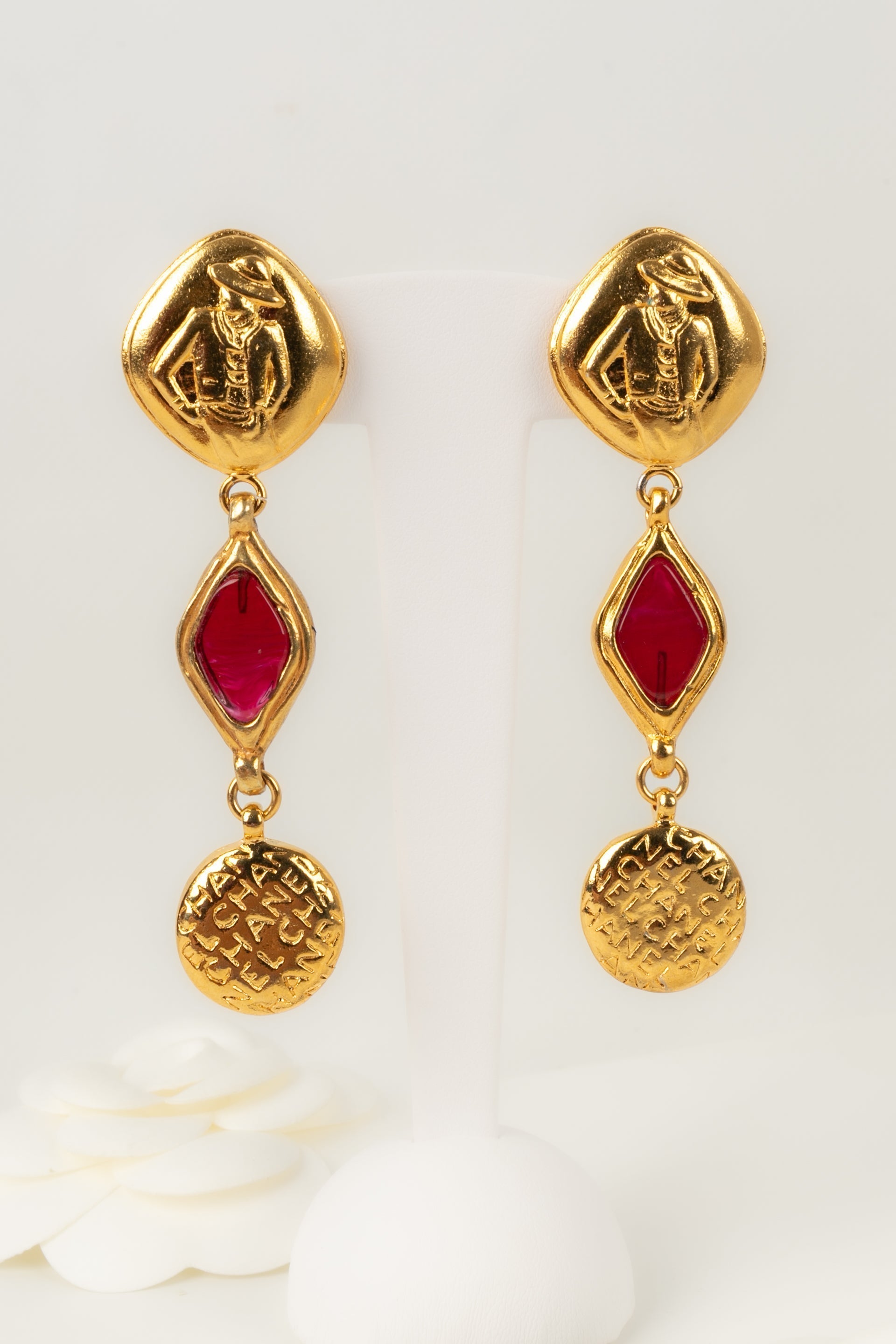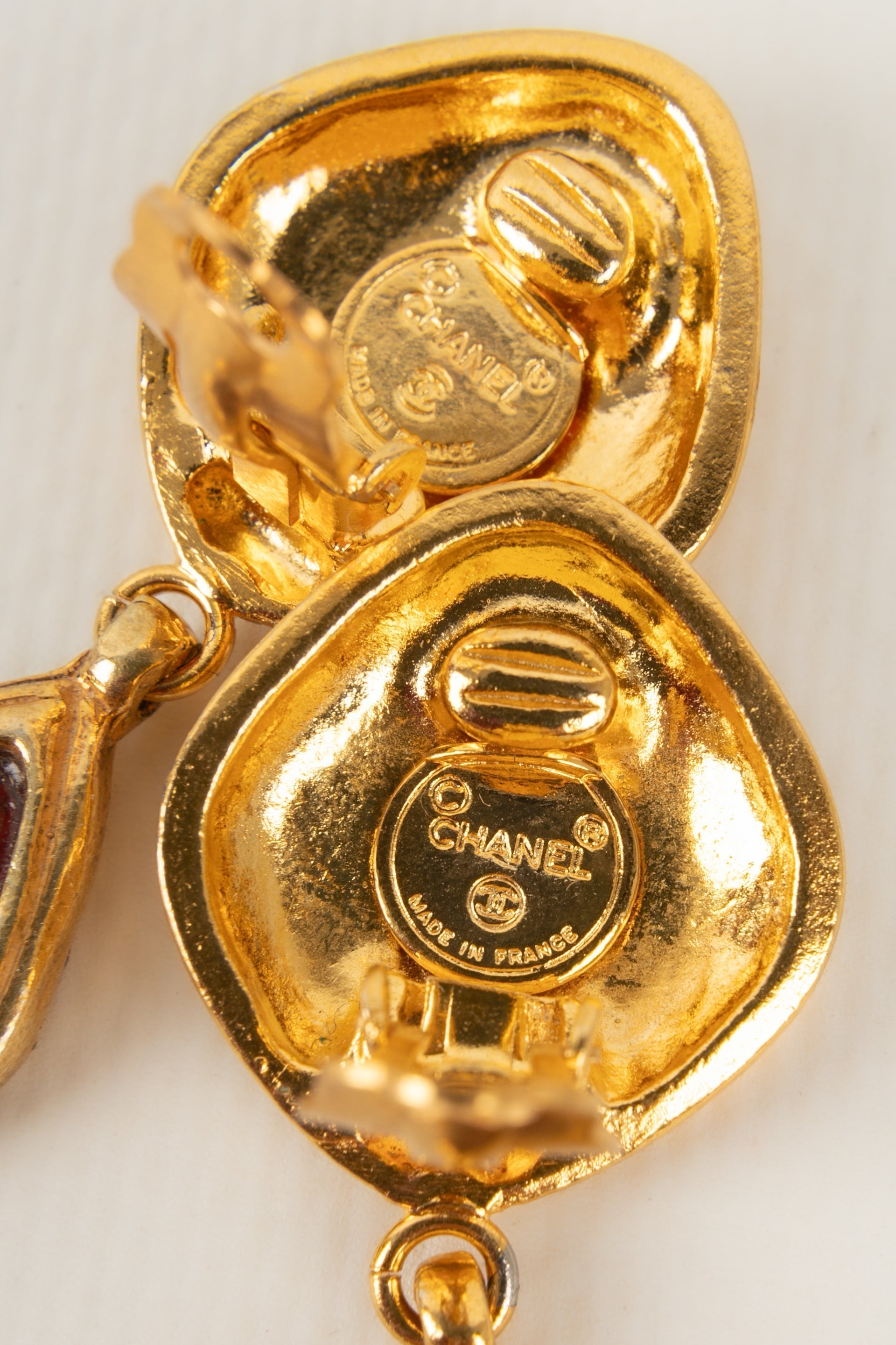 CHANEL - (Made in France) Boucles d'oreilles en mtal dor et pte de verre rouge. Bijou datant du dbut des annes 1990.