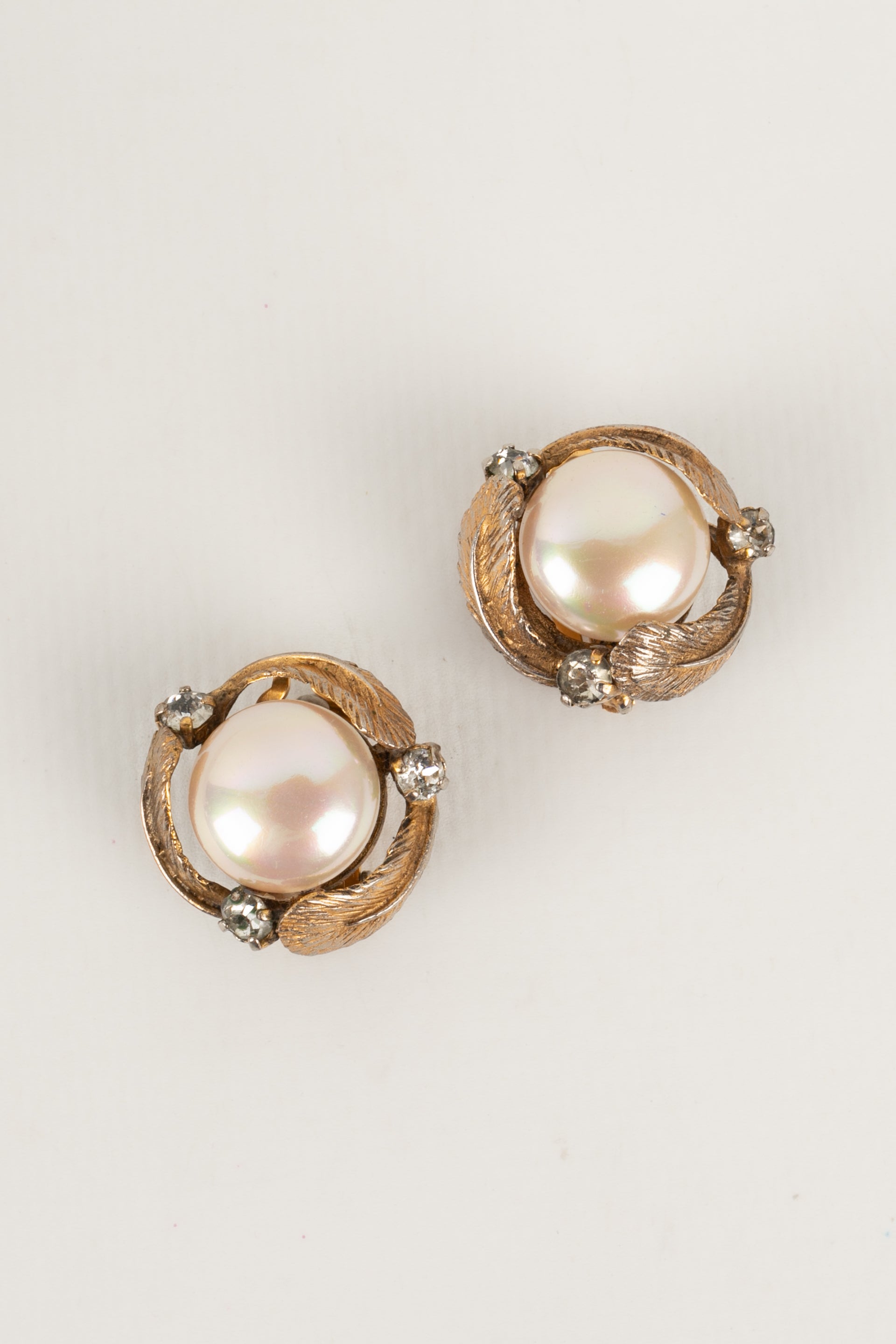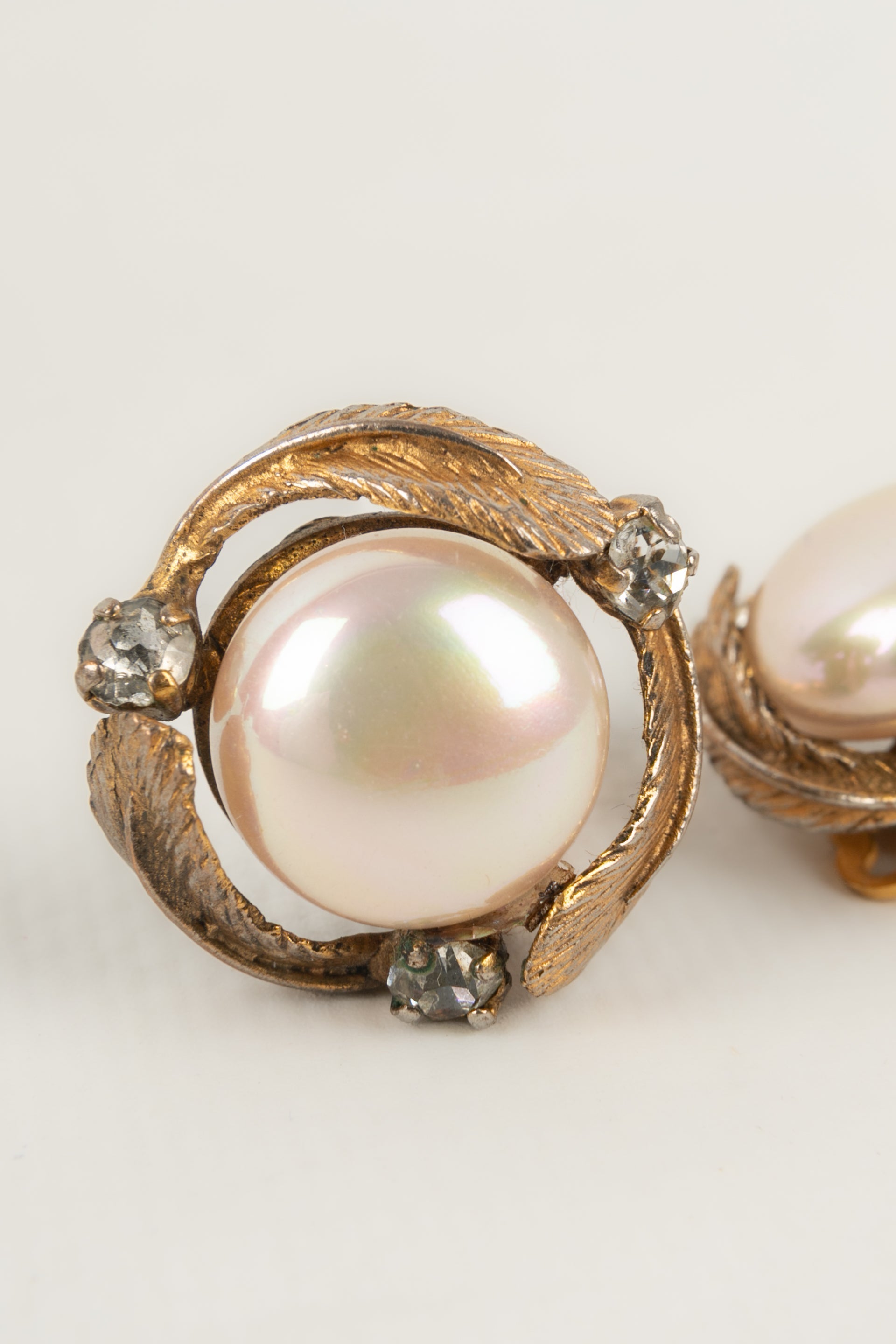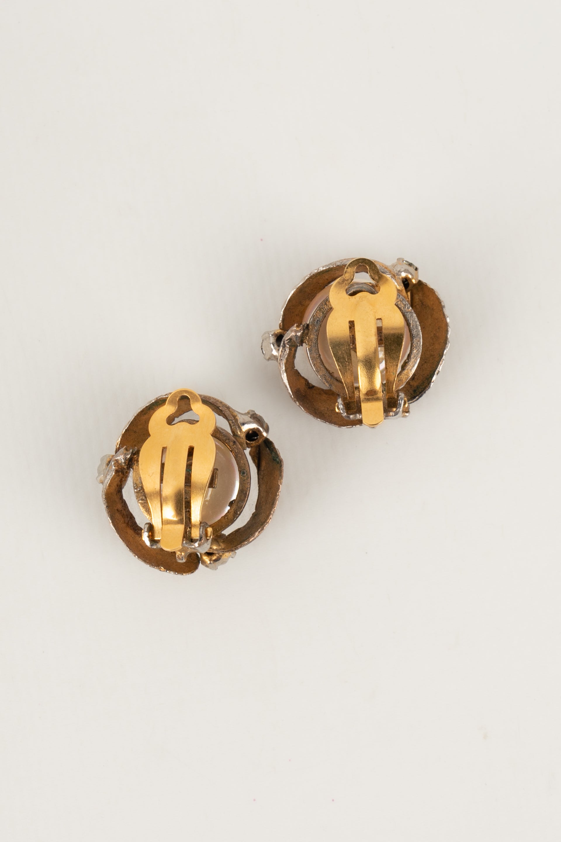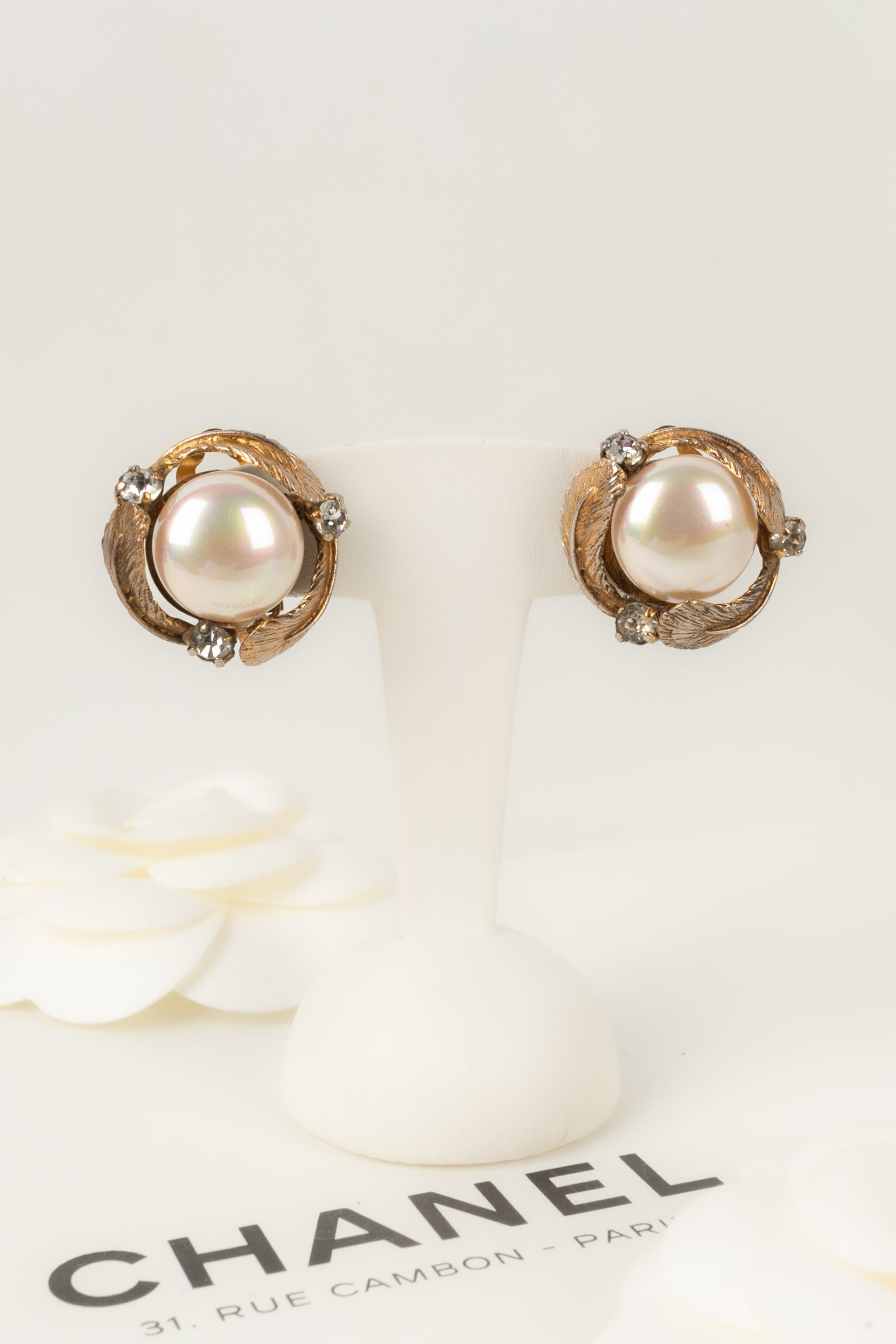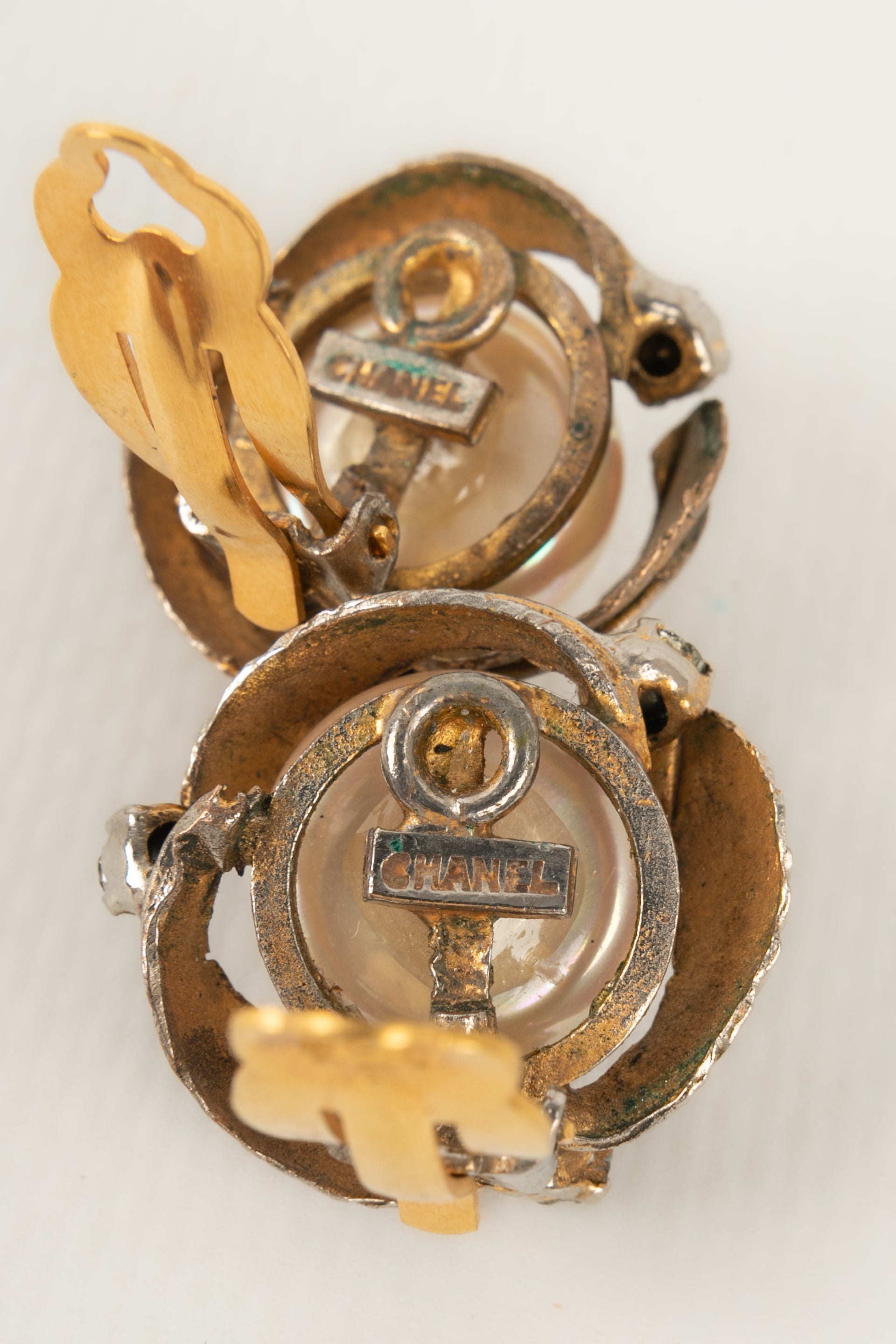 CHANEL - Boucles d'oreilles en mtal dor et cabochon nacr fantaisie.