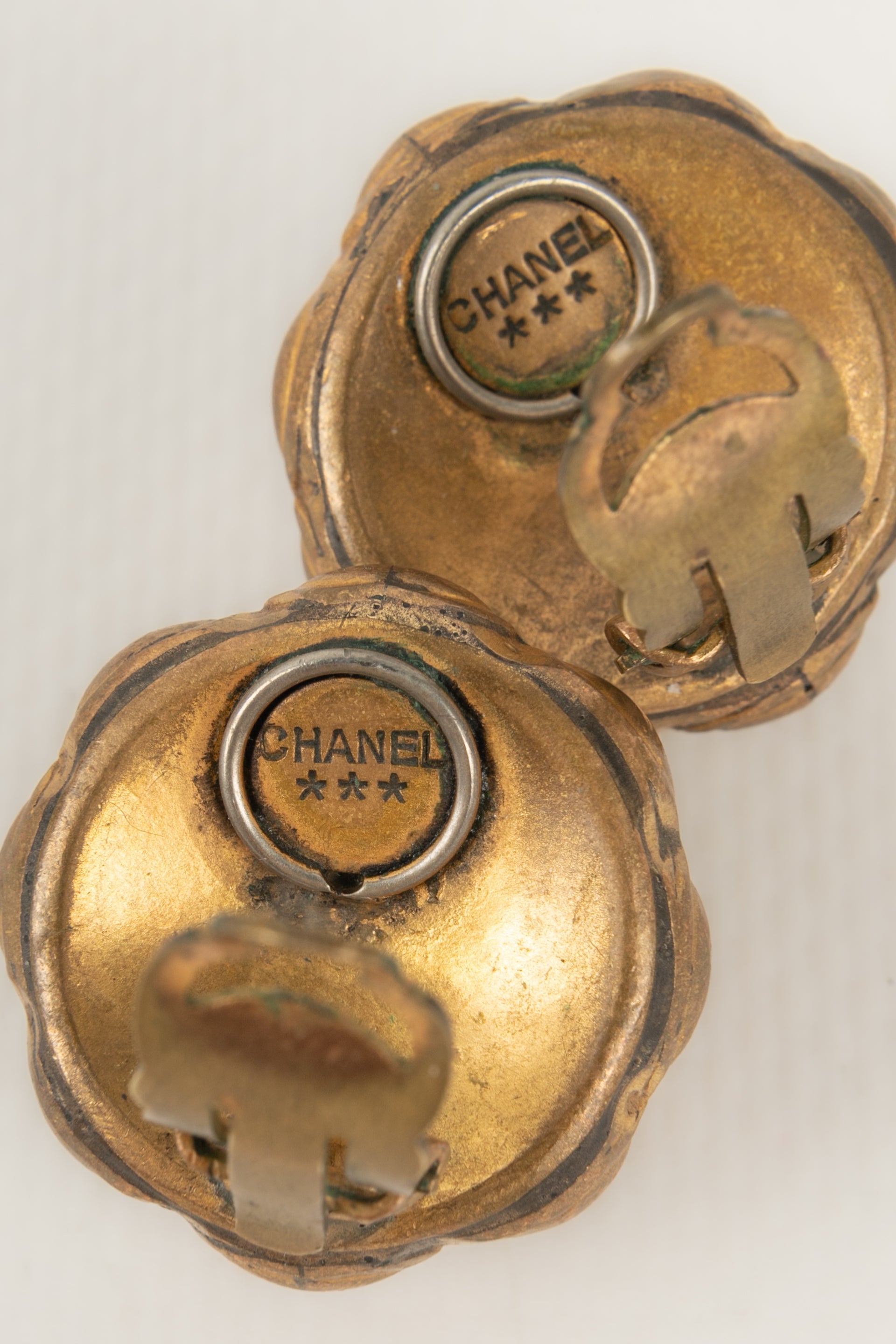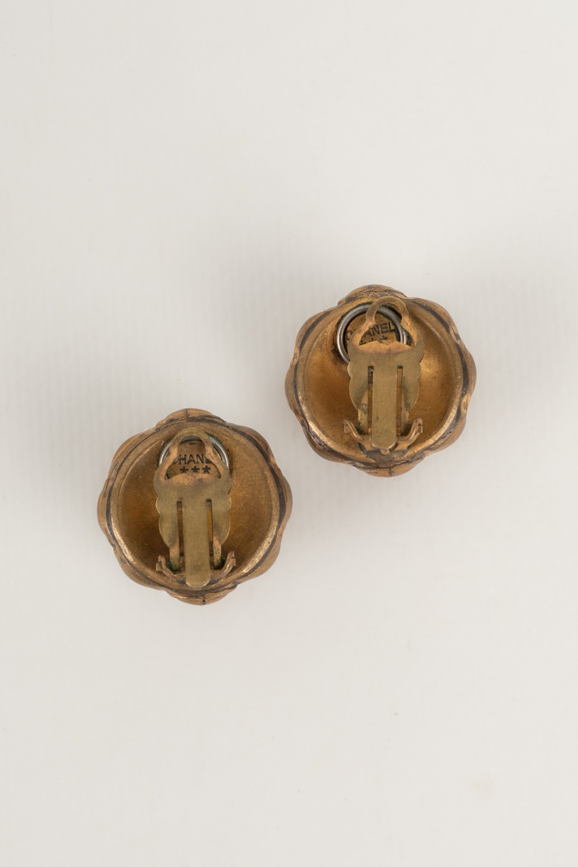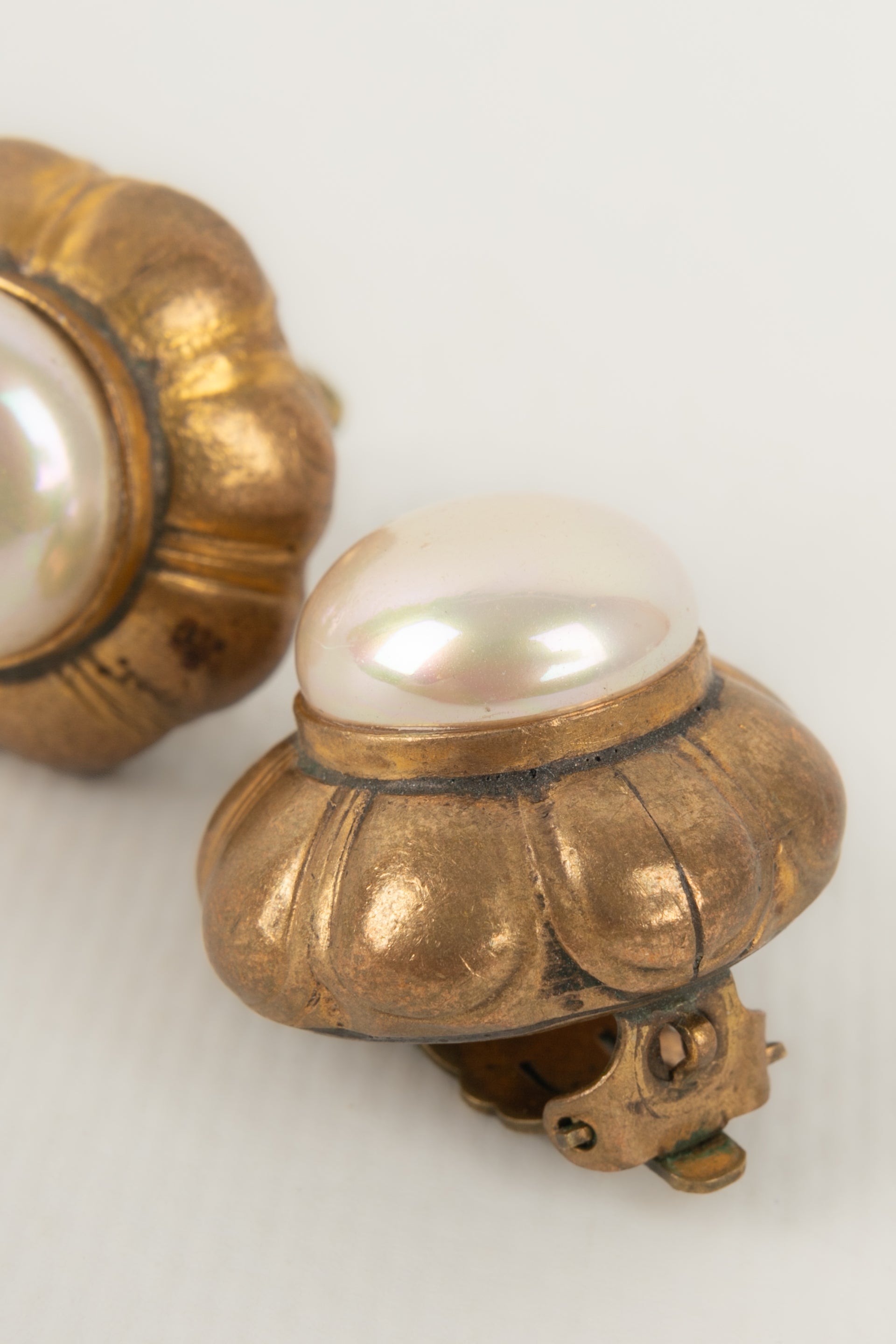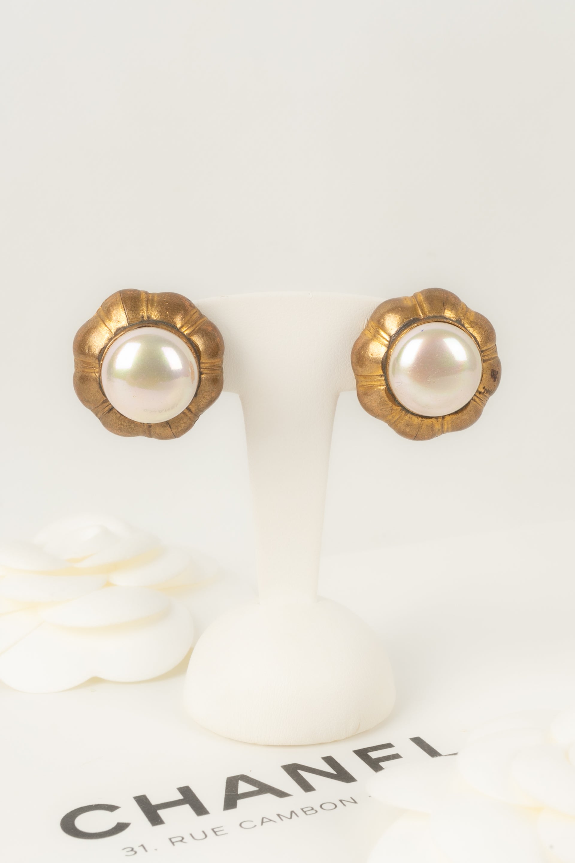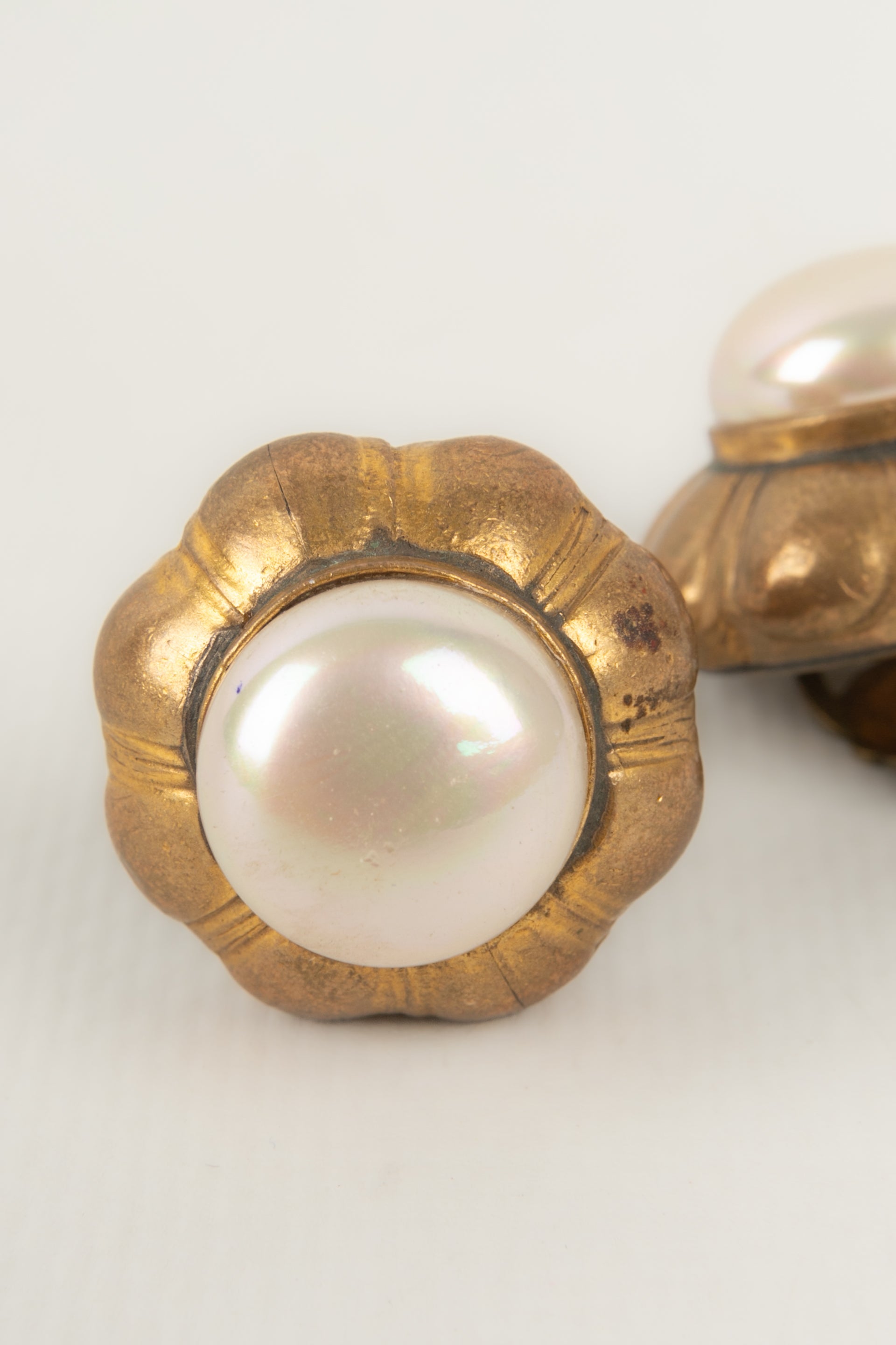 CHANEL - Boucles d'oreilles en mtal dor et cabochon nacr fantaisie.