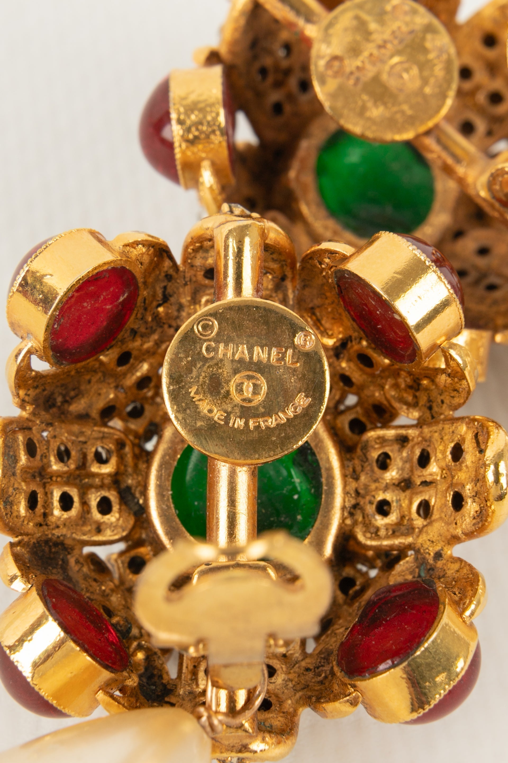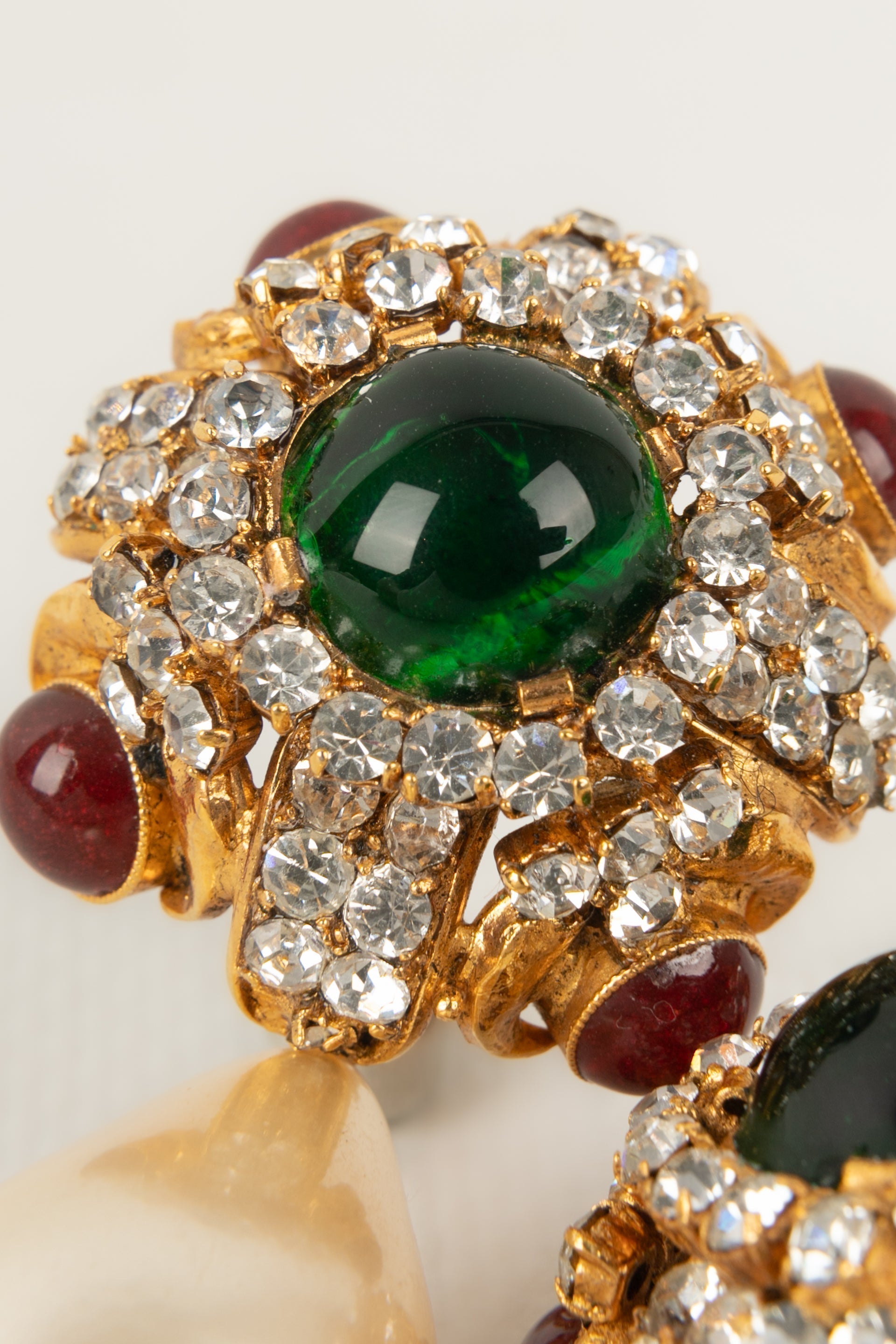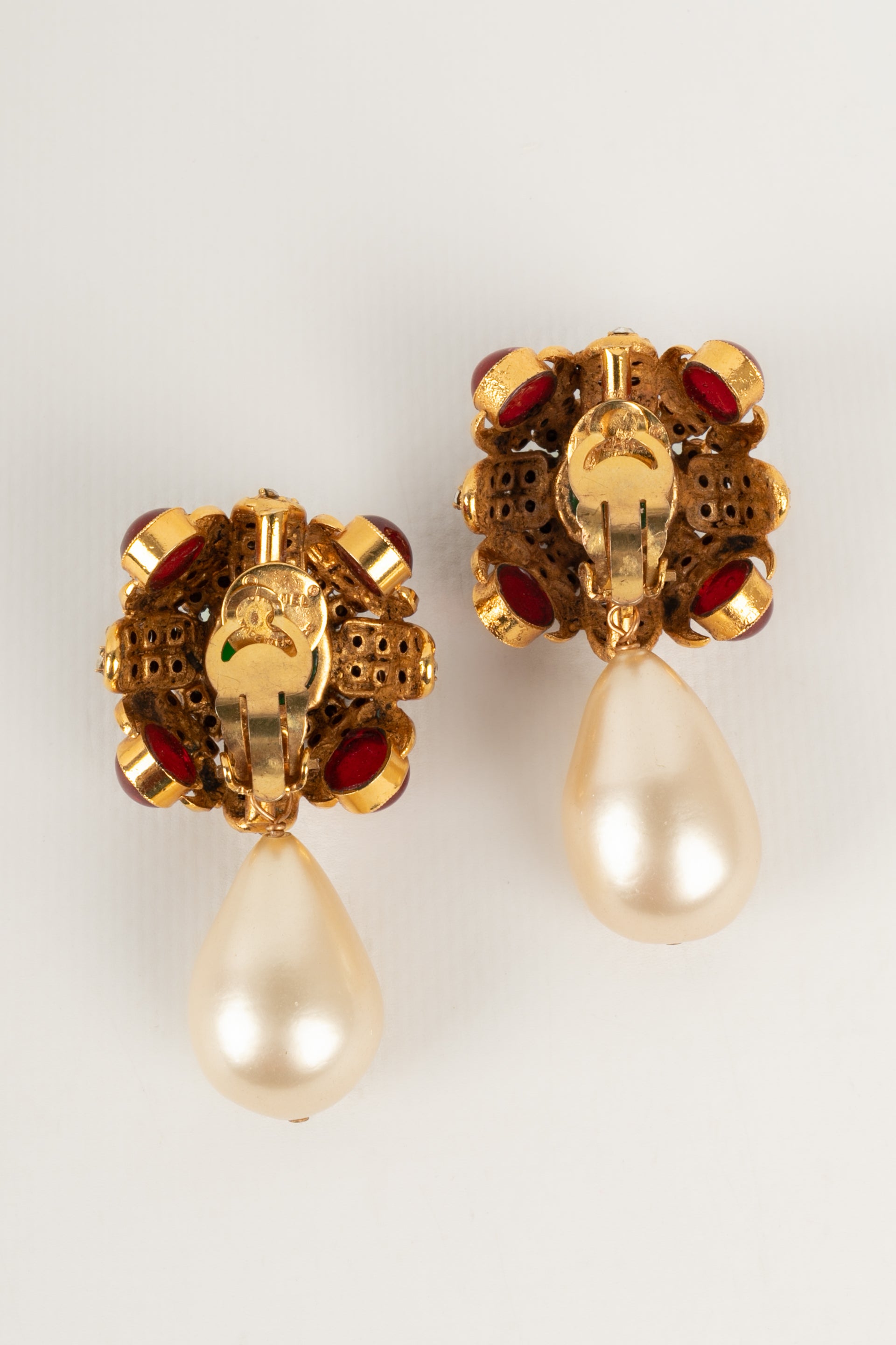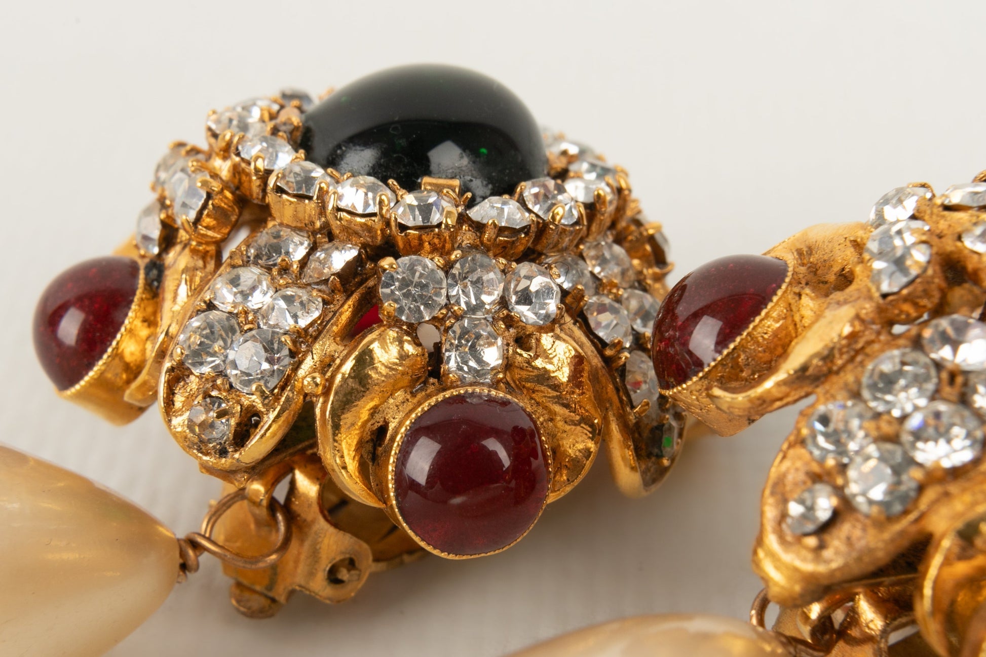CHANEL - (Made in France) Boucles d'oreilles en mtal dor paves de strass de Swarovski, cabochons en pte de verre et retenant une goutte de nacre.