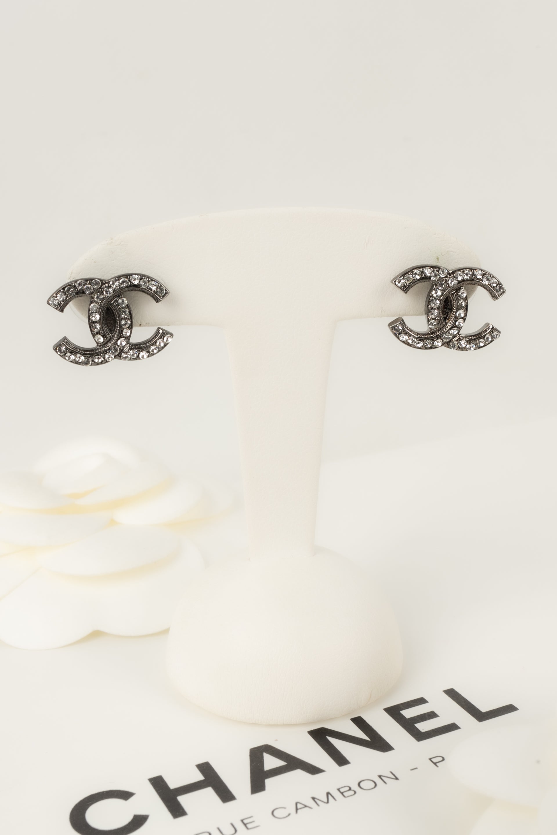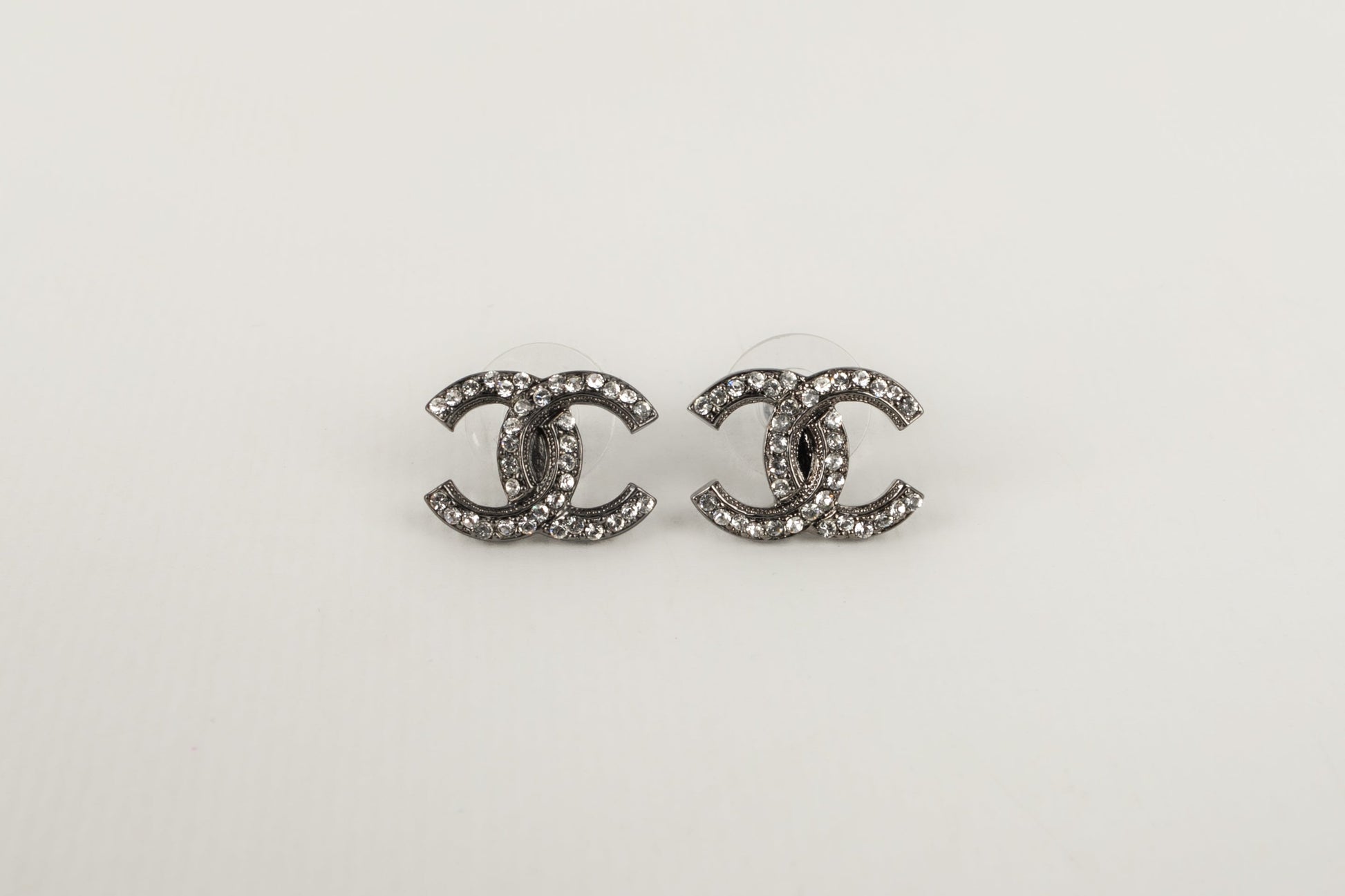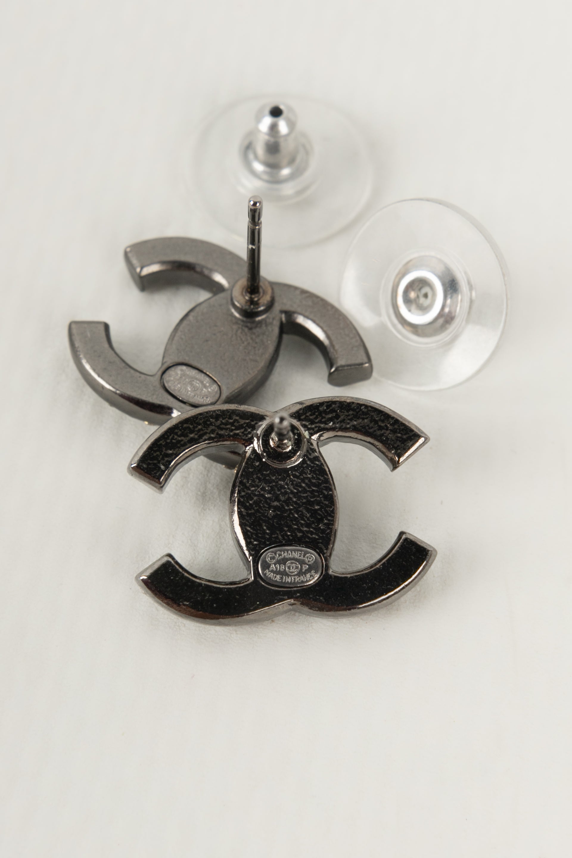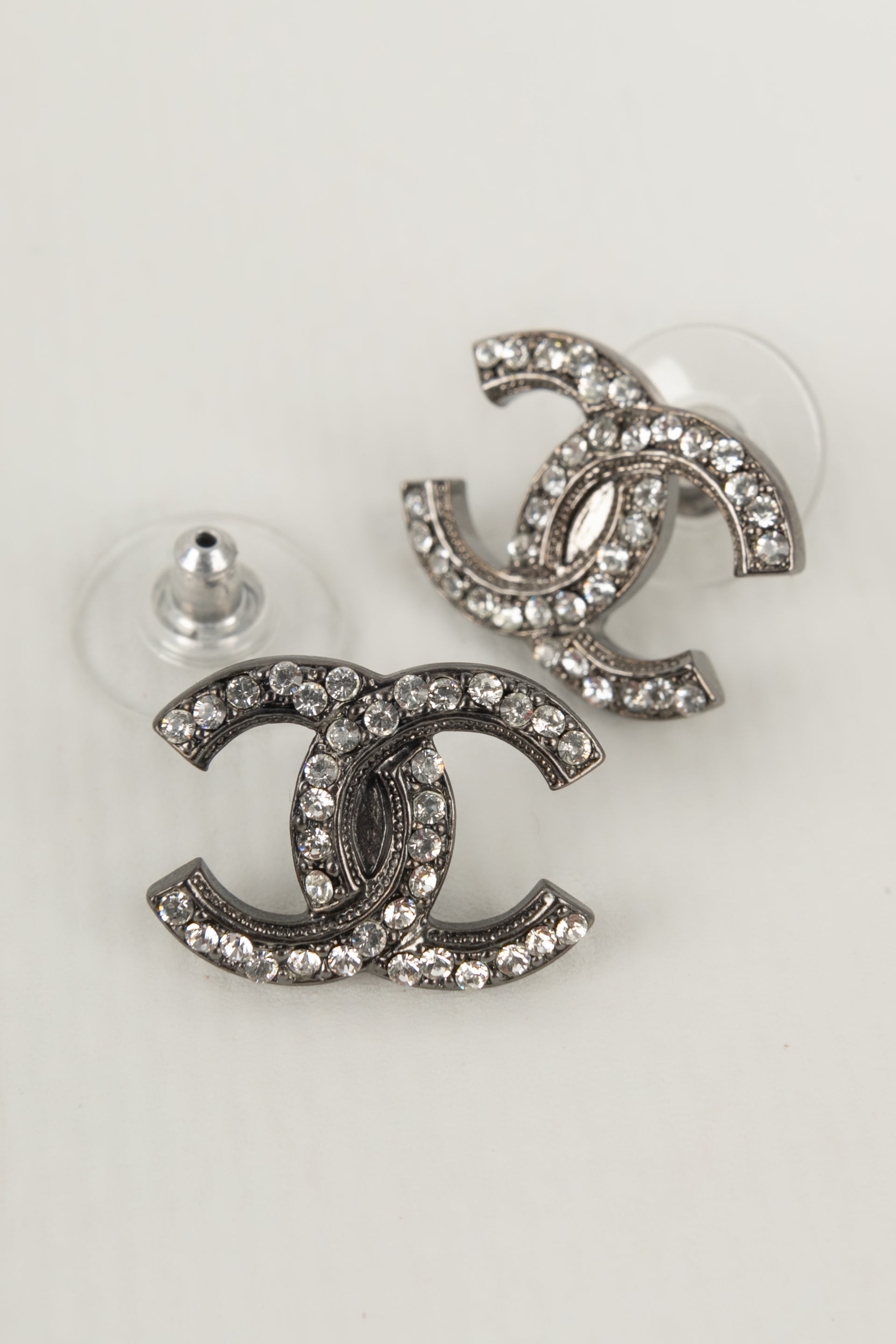 CHANEL - (Made in France) Boucles d'oreilles cc en mtal argent fonc pav de strass. Collection 2018.
