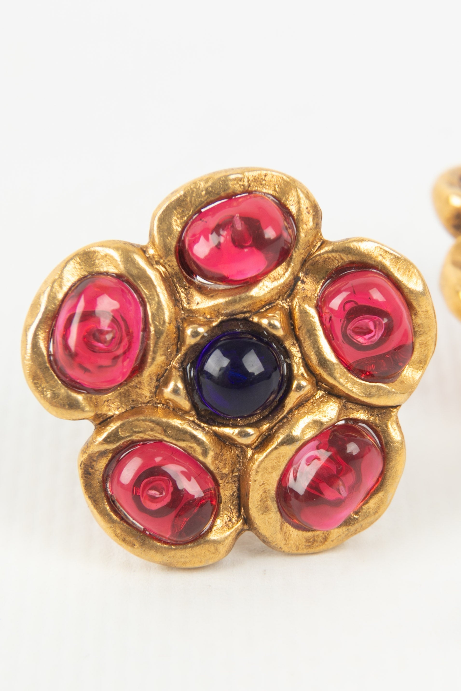 CHANEL - (Made in France) Boucles d'oreilles fleur en mtal dor et pte de verre. Bijou datant du dbut des annes 1980.