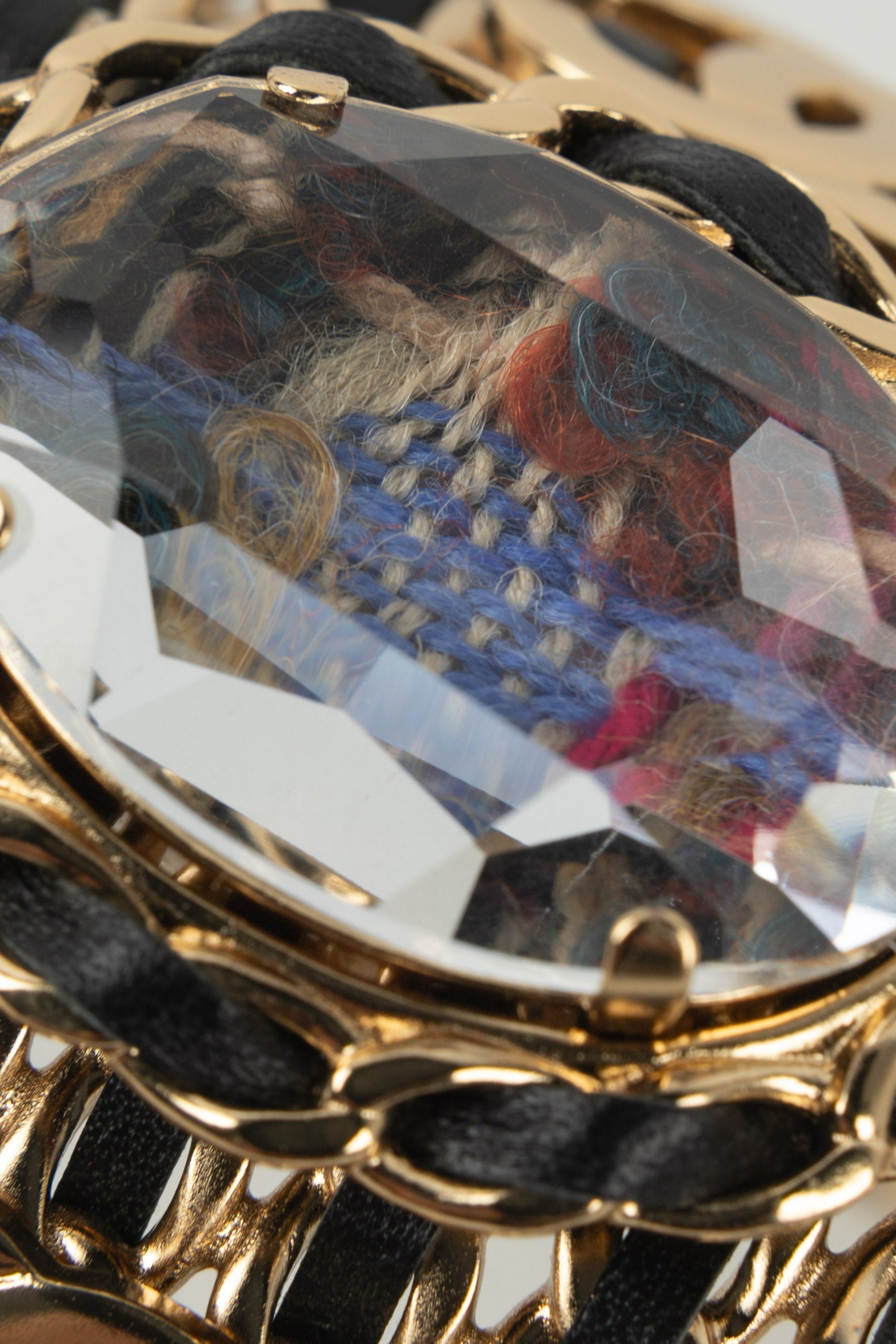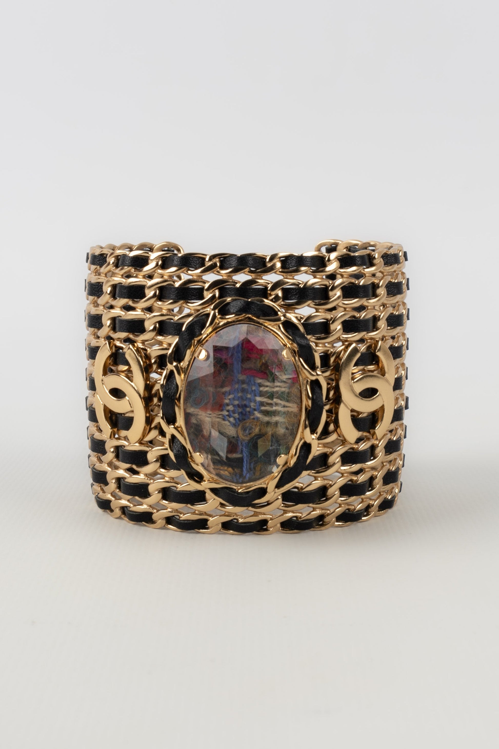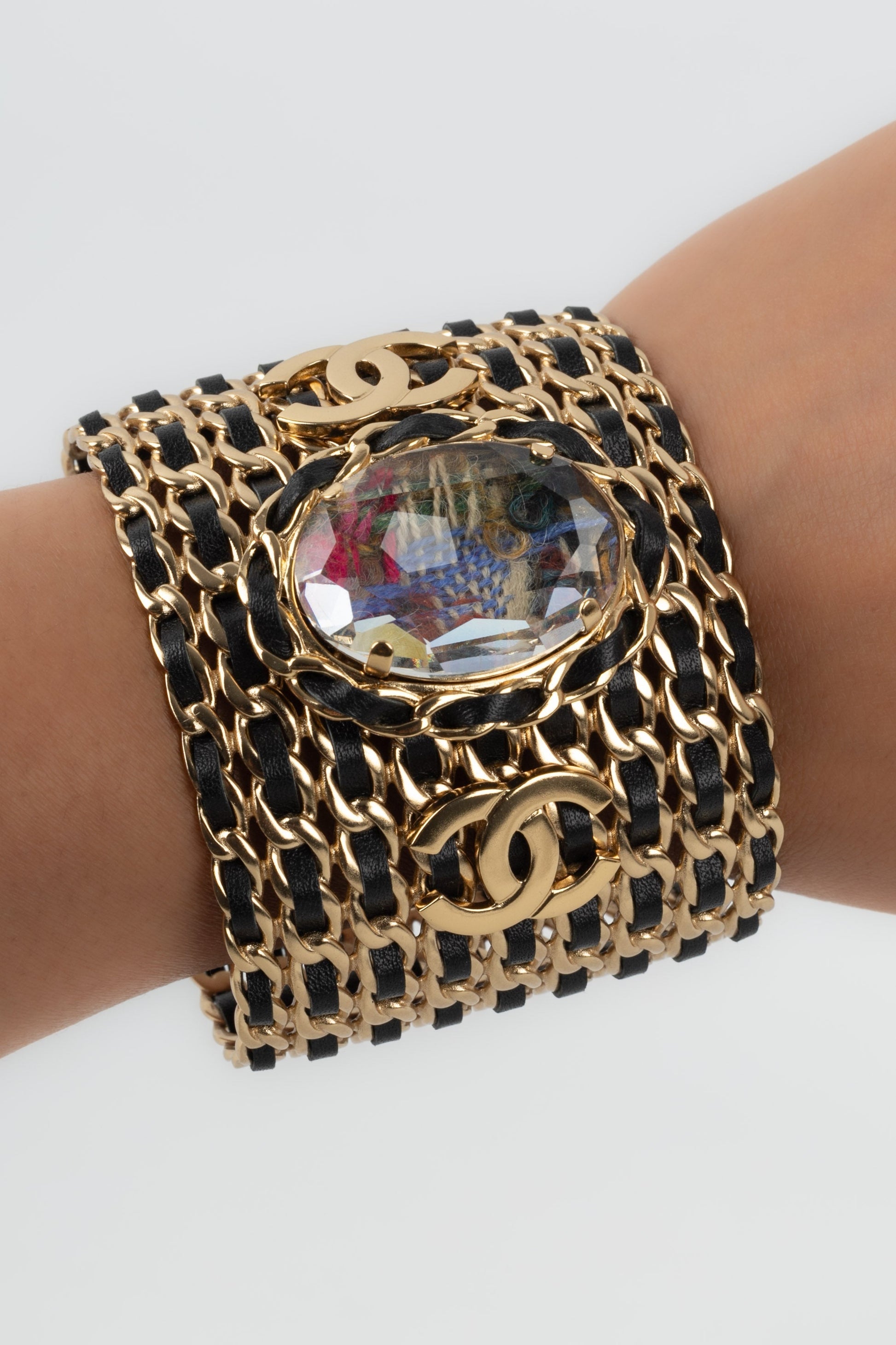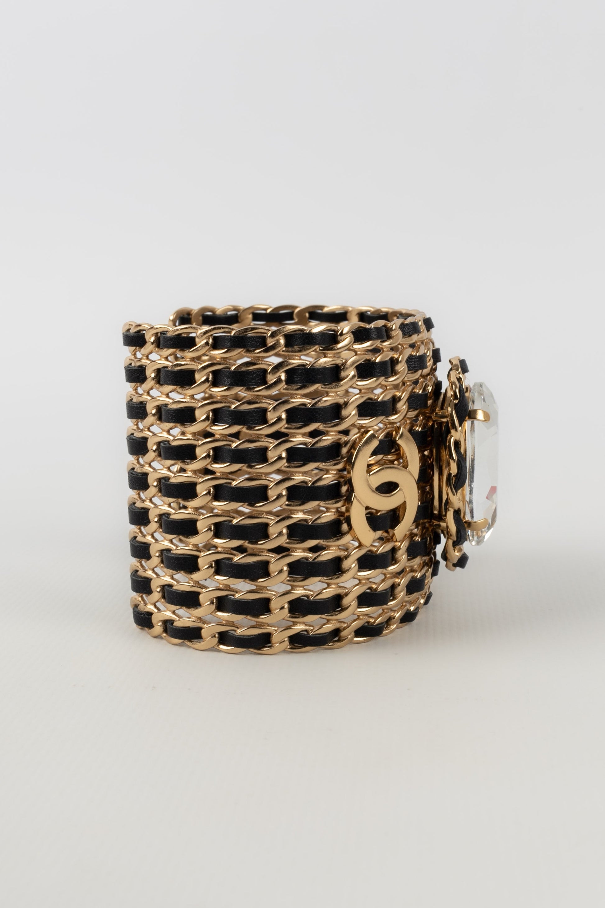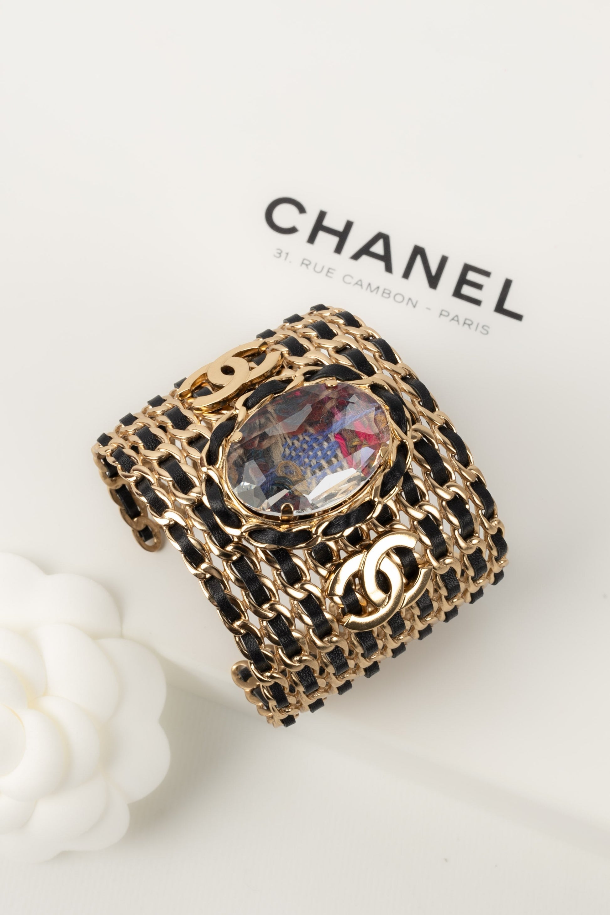 CHANEL - (Made in France) Manchette en mtal dor entrelace de cuir noir et surmonte d'un imposant strass transparent. Collection 2022.