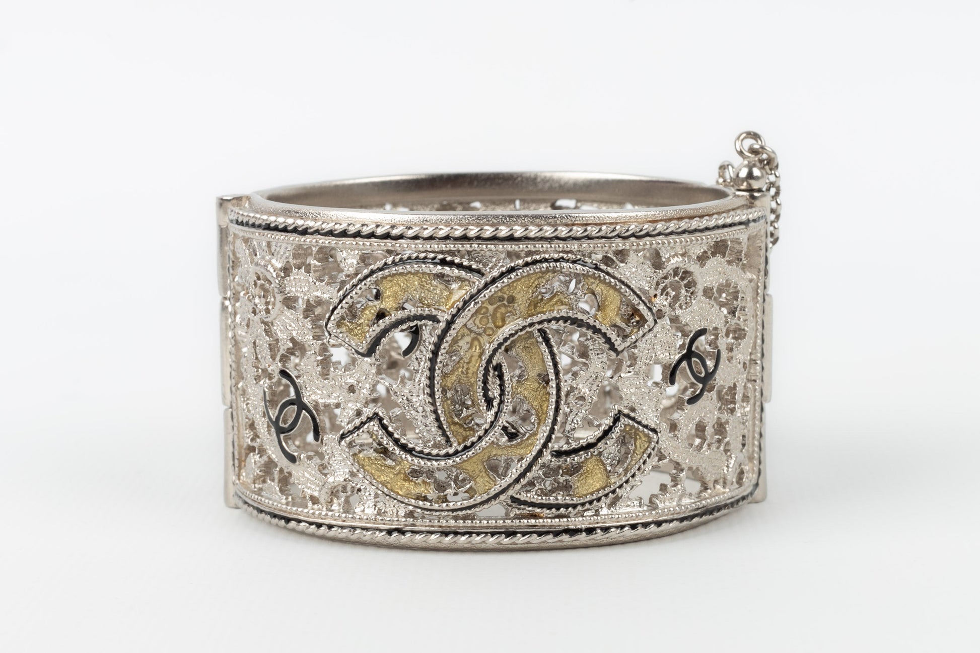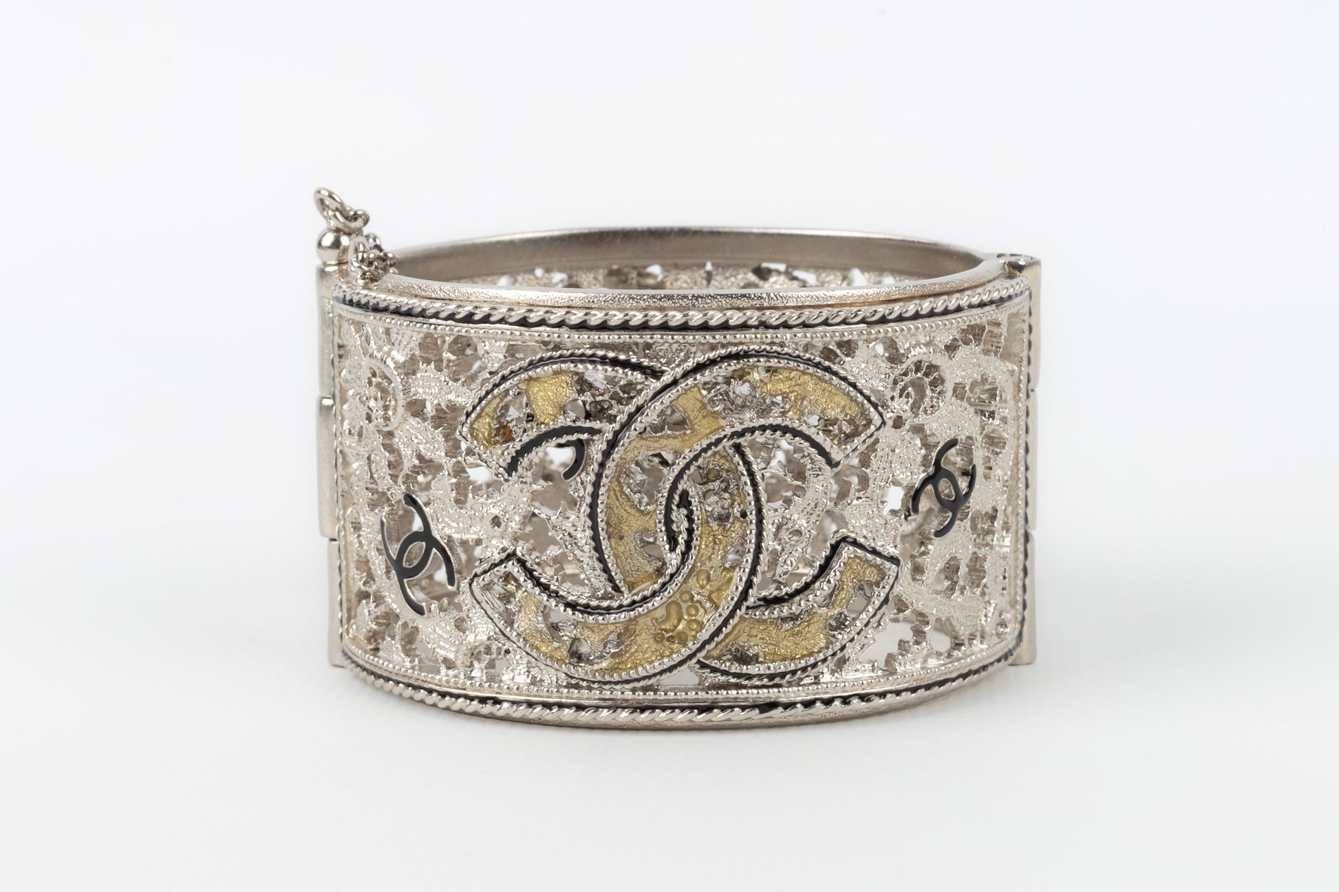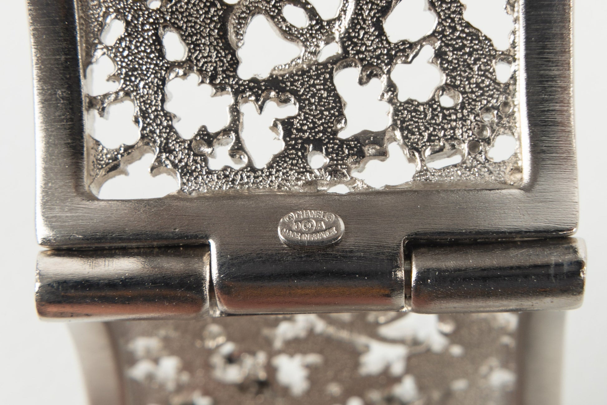 CHANEL - (Made in France) Bracelet manchette en mtal argent ajour. Collection Prt--Porter Automne-Hiver 2010.