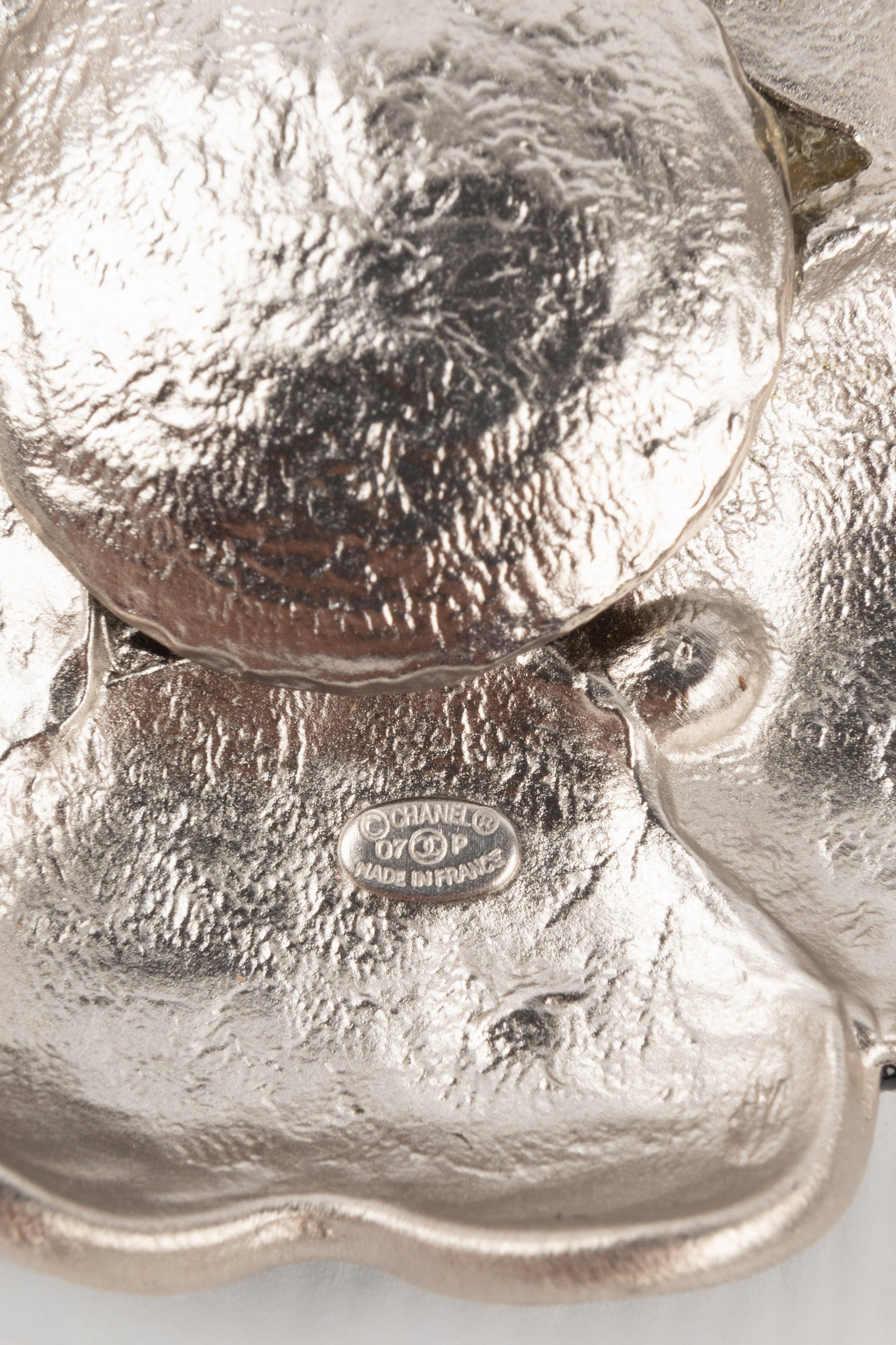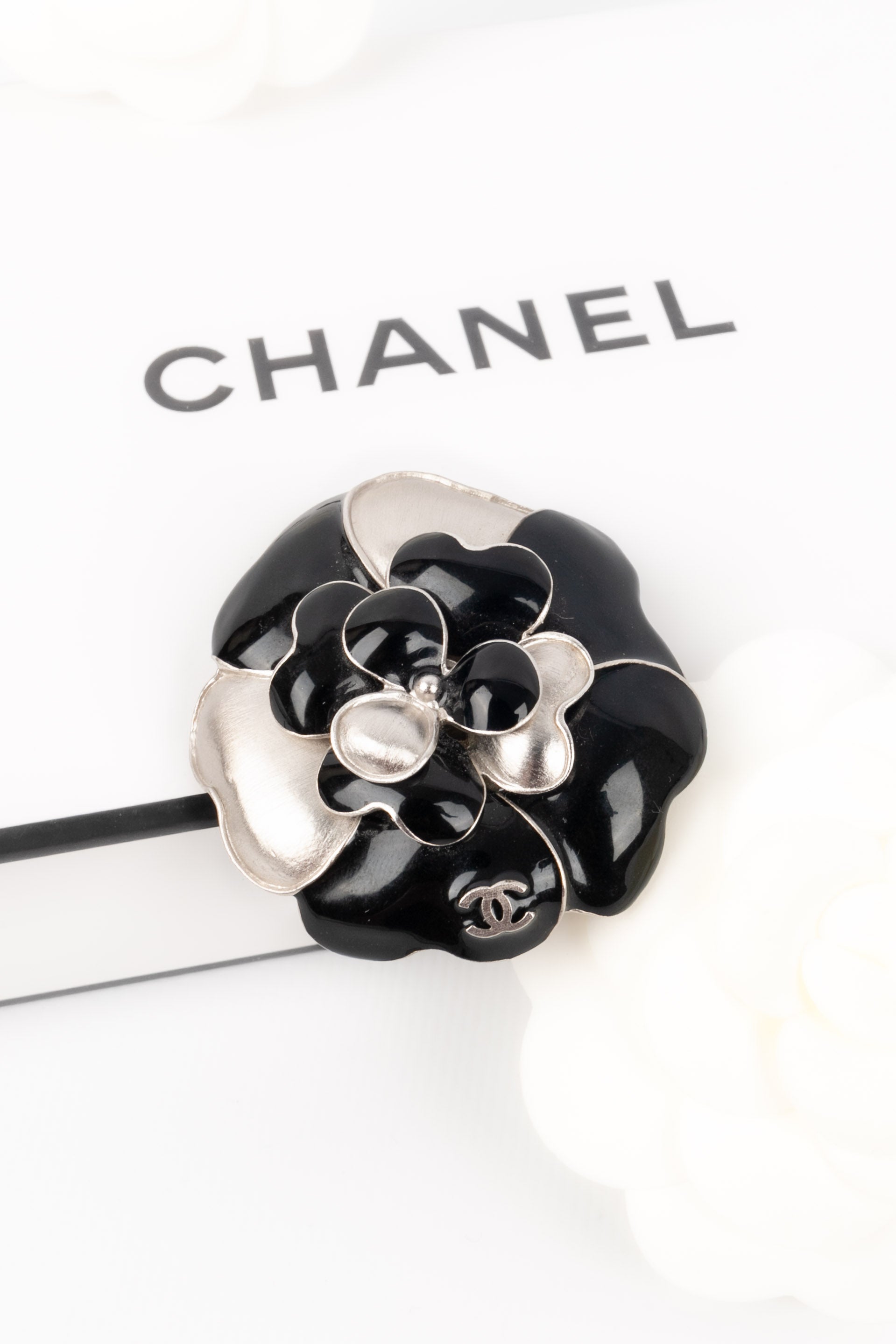 CHANEL - (Made in France) Broche camlia en mtal argent maill de noir. Collection Printemps-Et 2007.