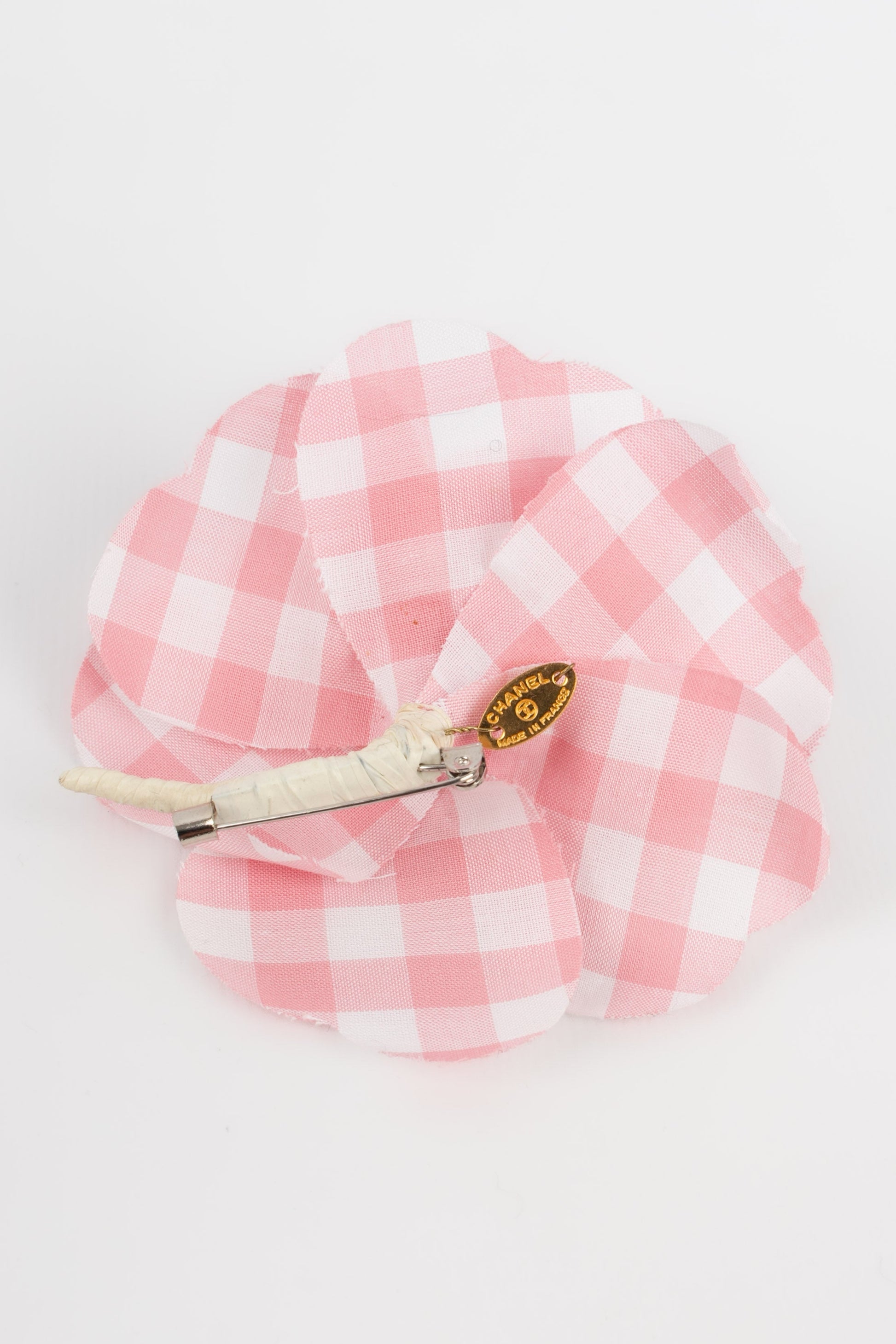 CHANEL - (Made in France) Broche camlia en tissu vichy rose et blanc. Modle collector datant du dbut des annes 1990.