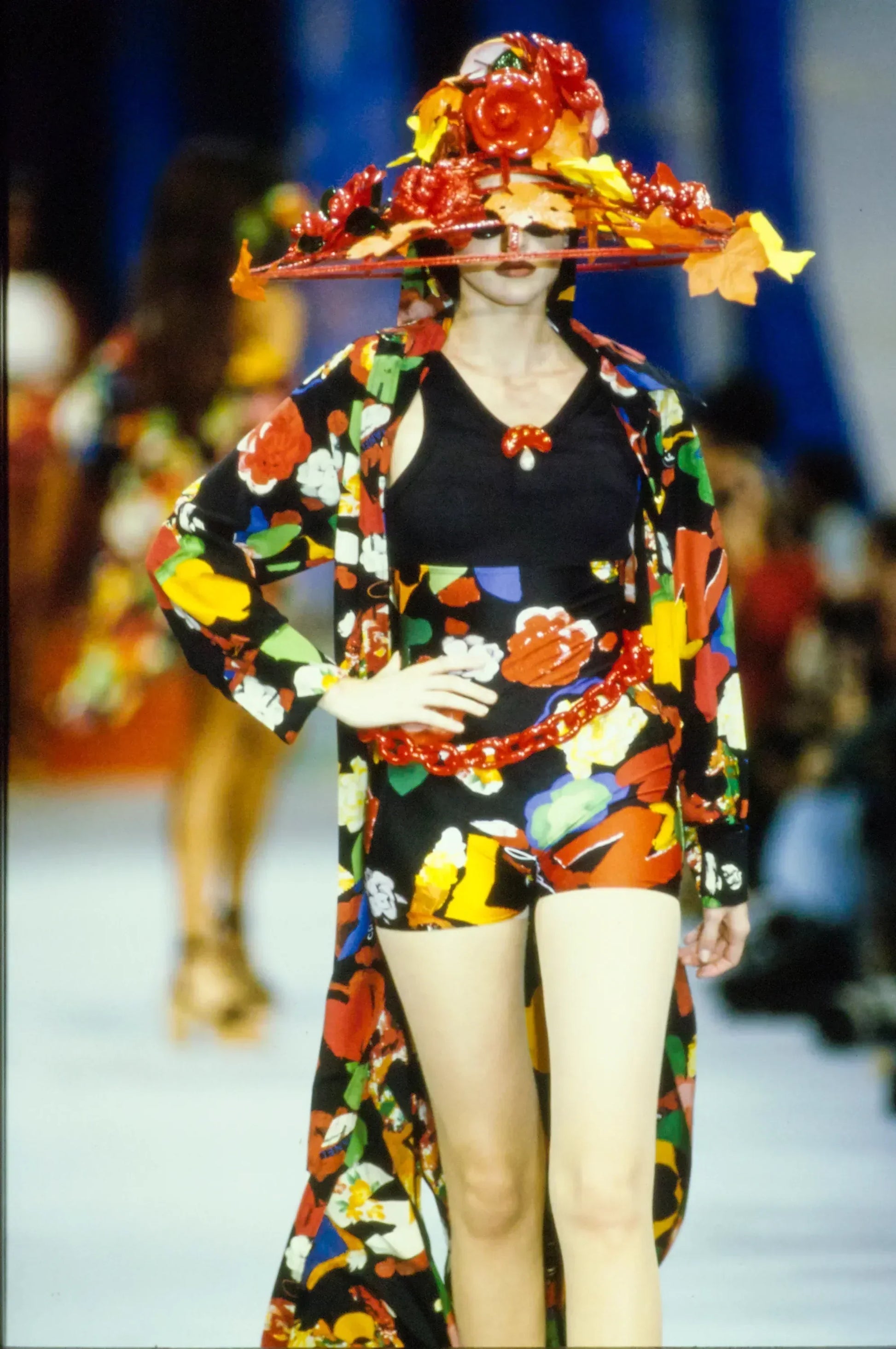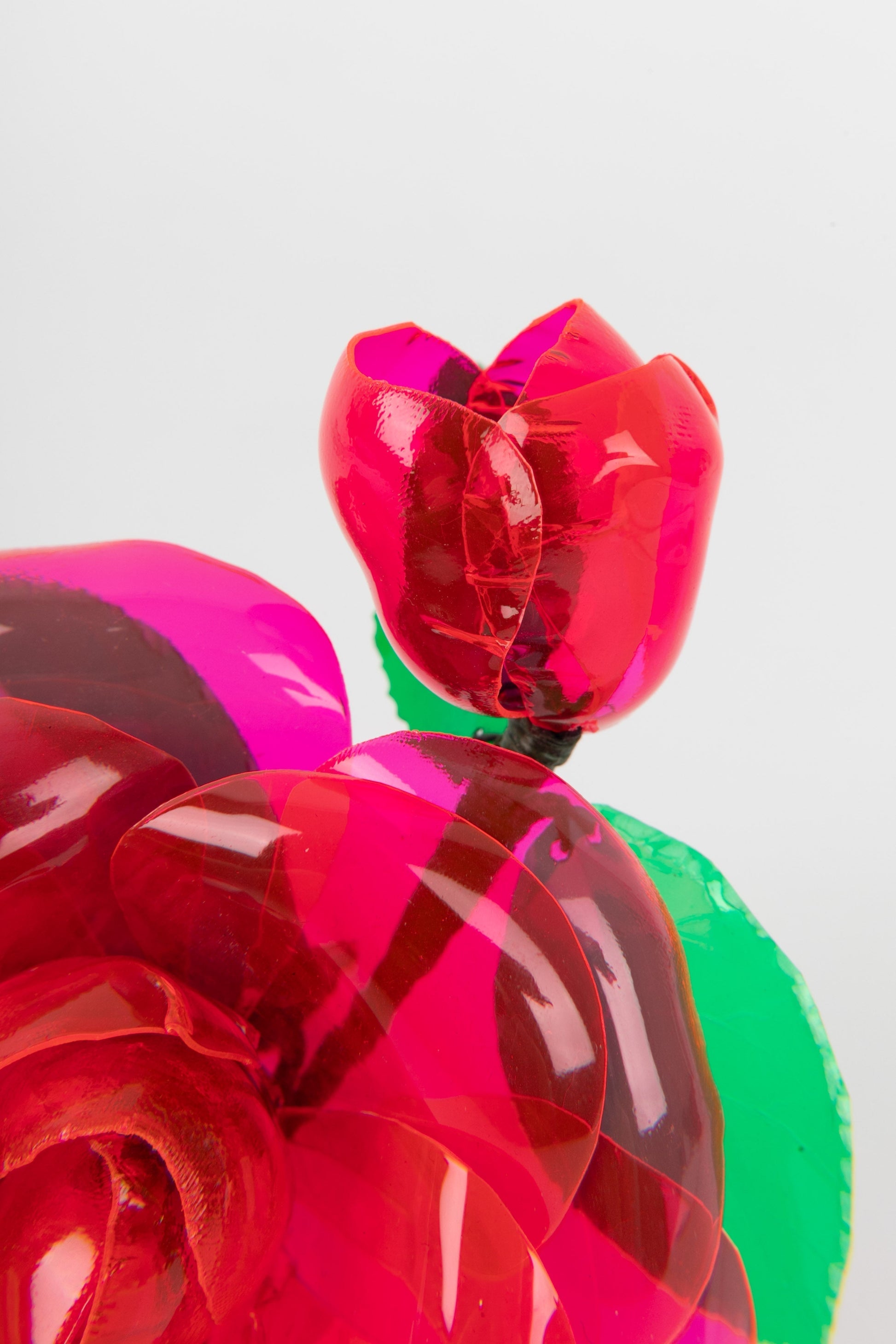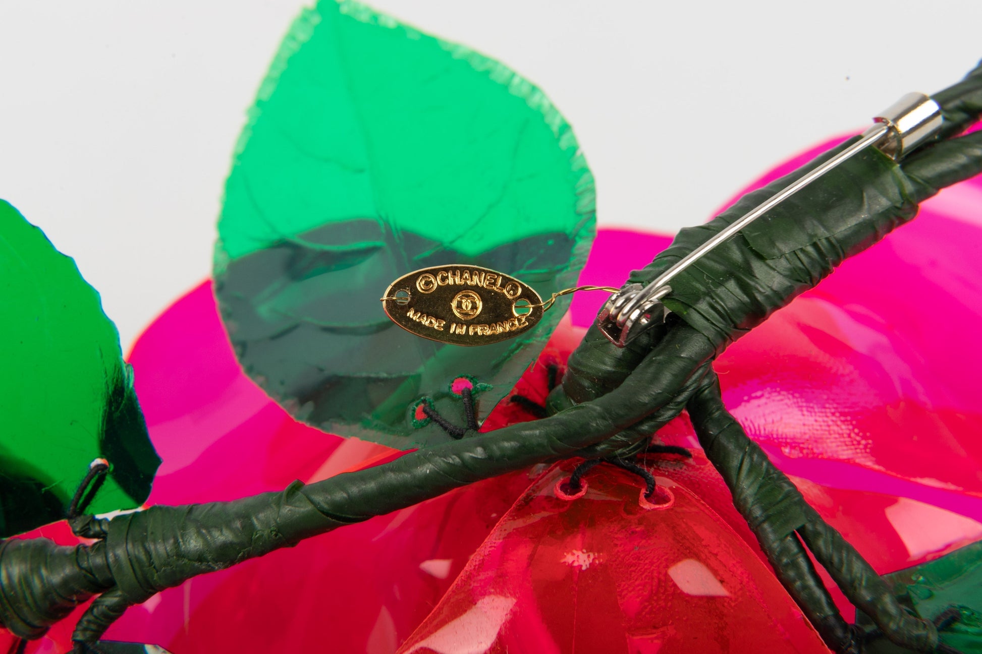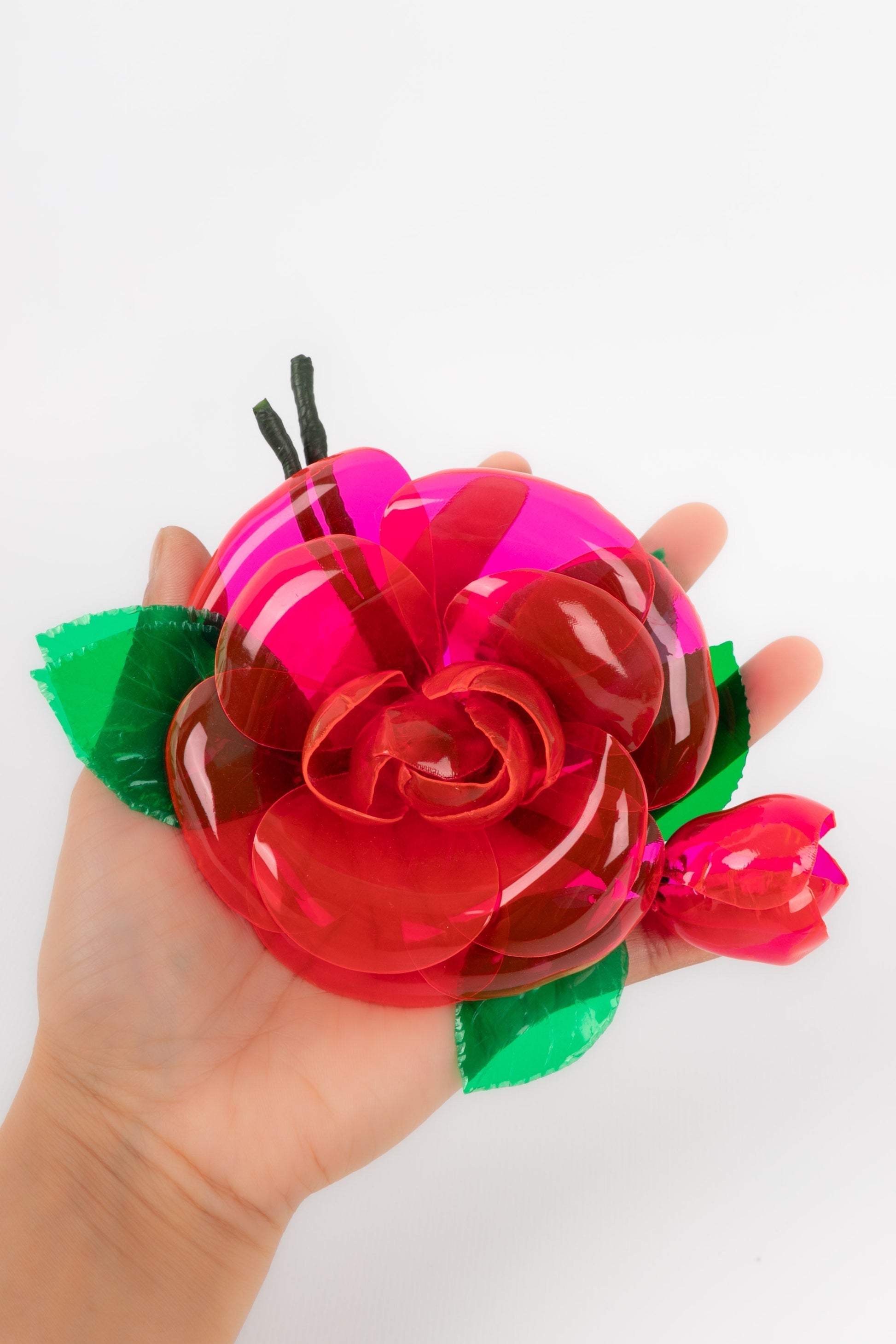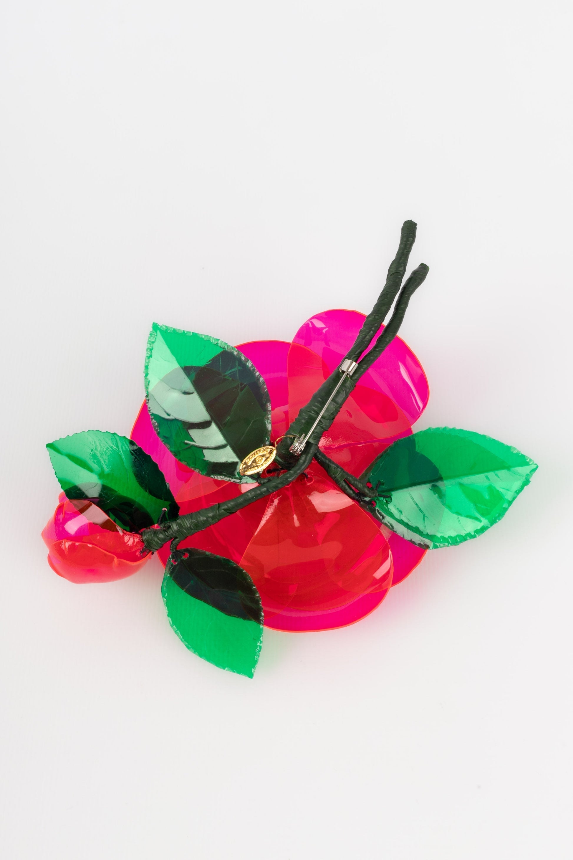 CHANEL - (Made in France) Broche camlia en matire plastique de couleur rouge/rose transparent. Collection Printemps/Et 1992.