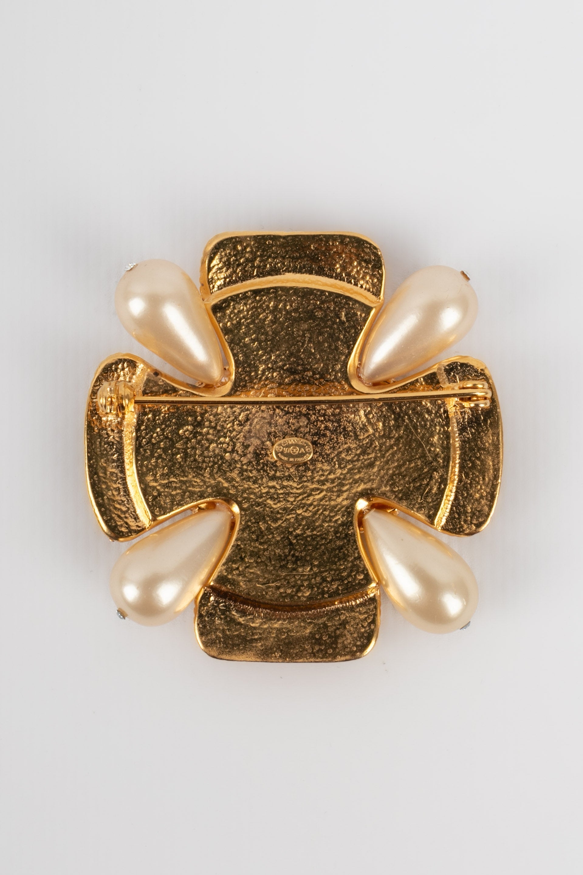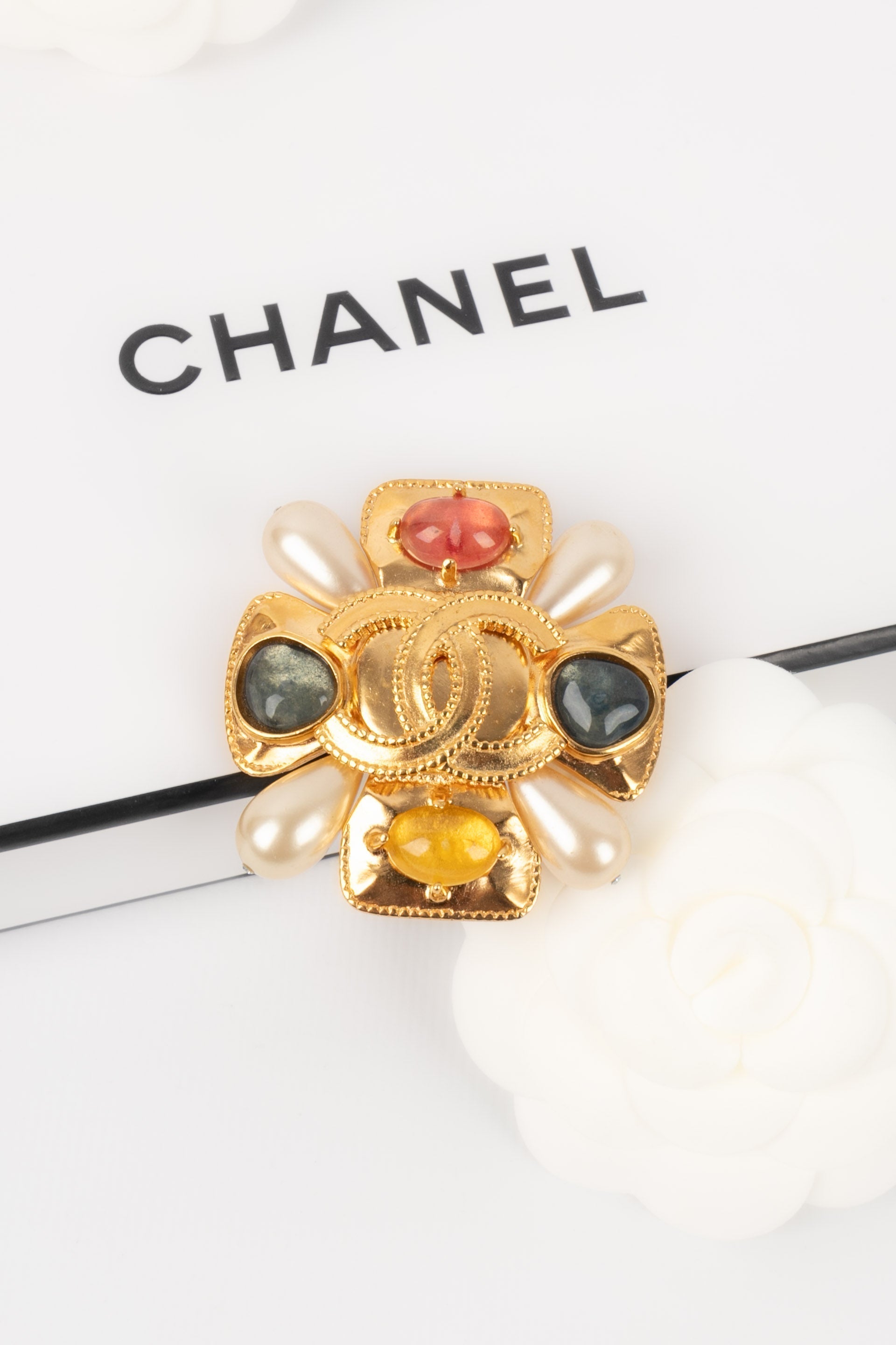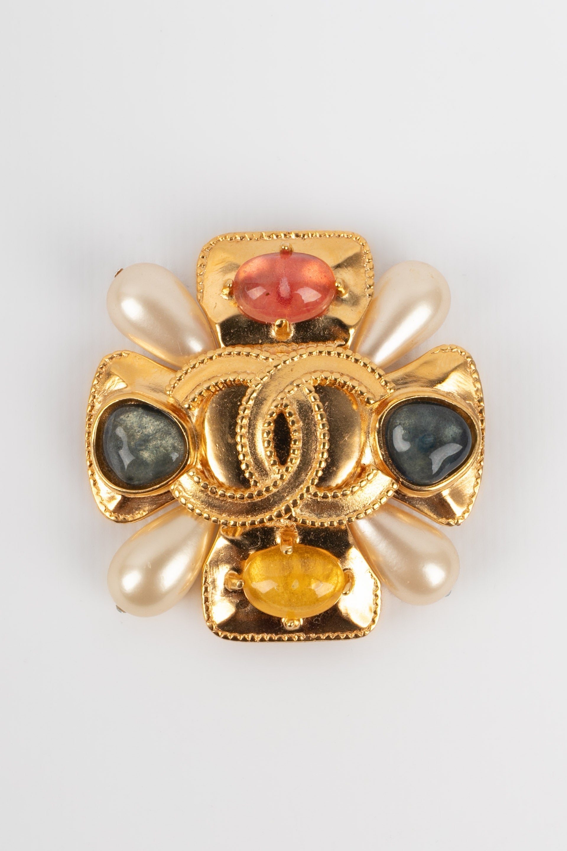 CHANEL - (Made in France) Broche croix en mtal dor pave de cabochons colors en pte de verre et de gouttes nacres fantaisies. Collection Automne-Hiver 1997.