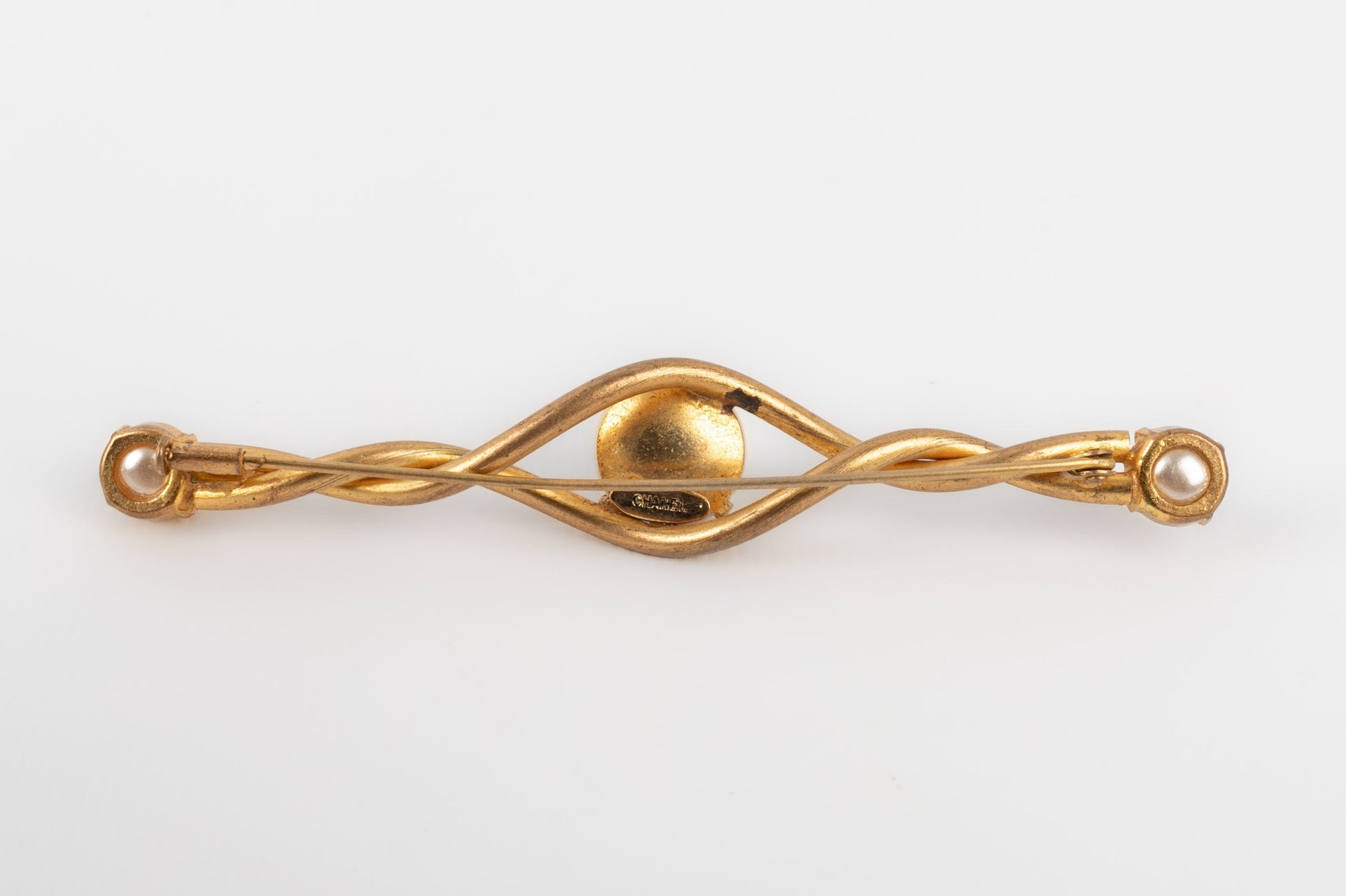 CHANEL - (Made in France) Longue broche dor pave de trois cabochons nacrs.