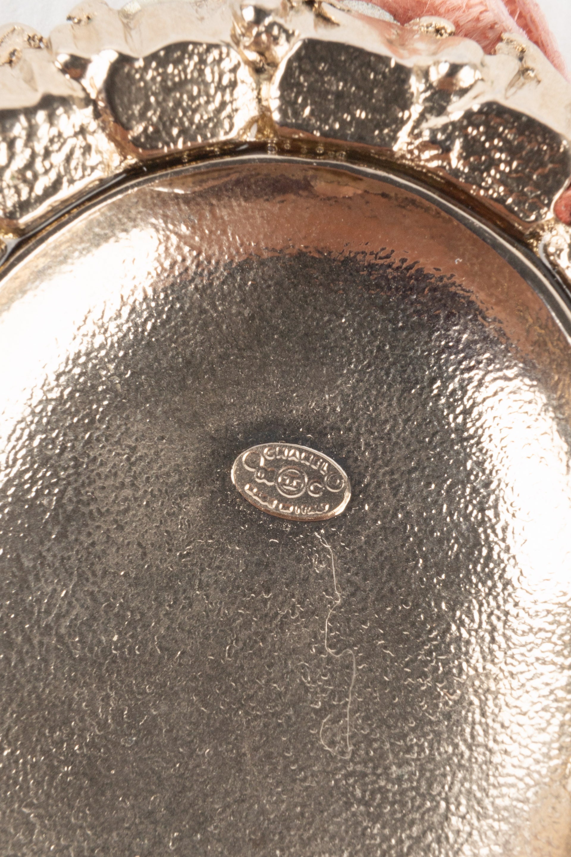 CHANEL - (Made in France) Broche en mtal argent pave de strass figurant un mdaillon surmont d'un ruban de velours rose.