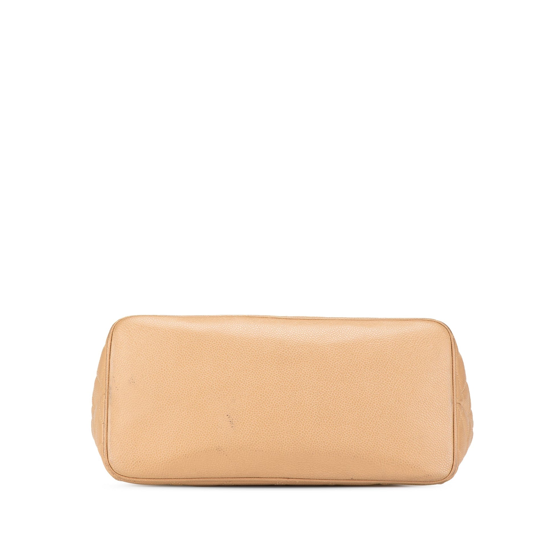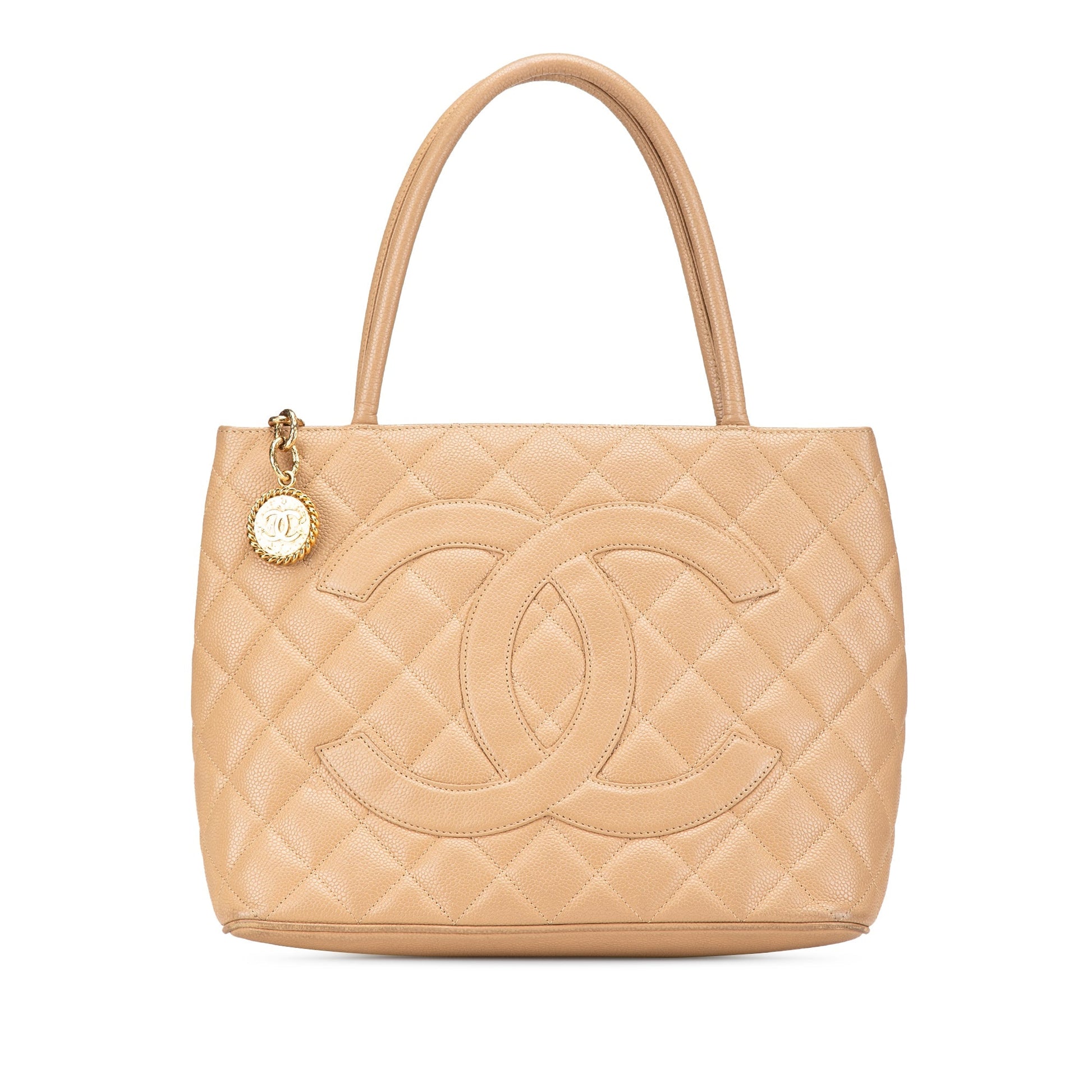 Product Details: Brown Chanel Caviar Medallion Tote. The Medallion tote bag features a quilted caviar leather body, rolled leather handles, a top zip closure, an exterior back slip pocket, and interior zip and slip pockets. 9.4" L x 11.4" W x 5.5" D, 6.3" drop. Serial number 7277314.